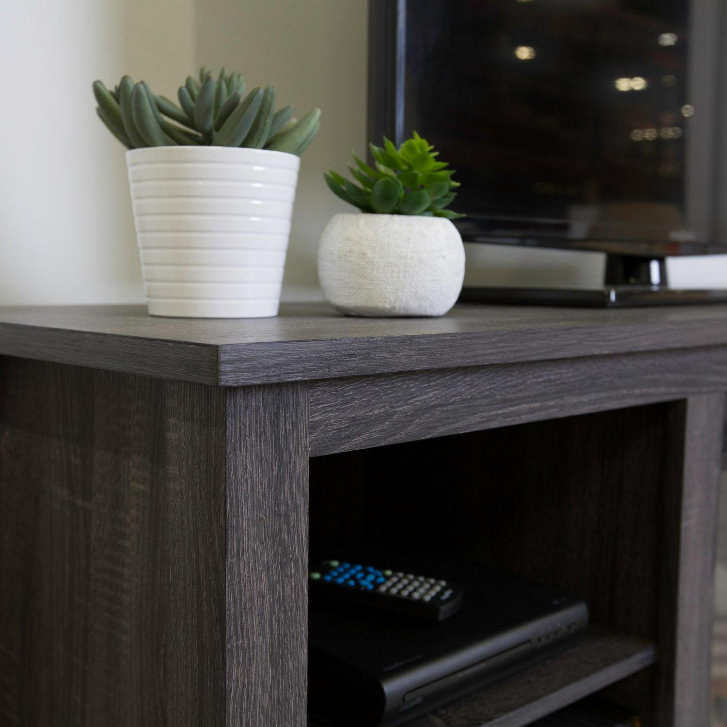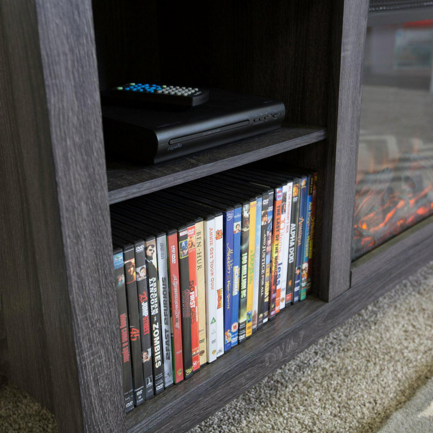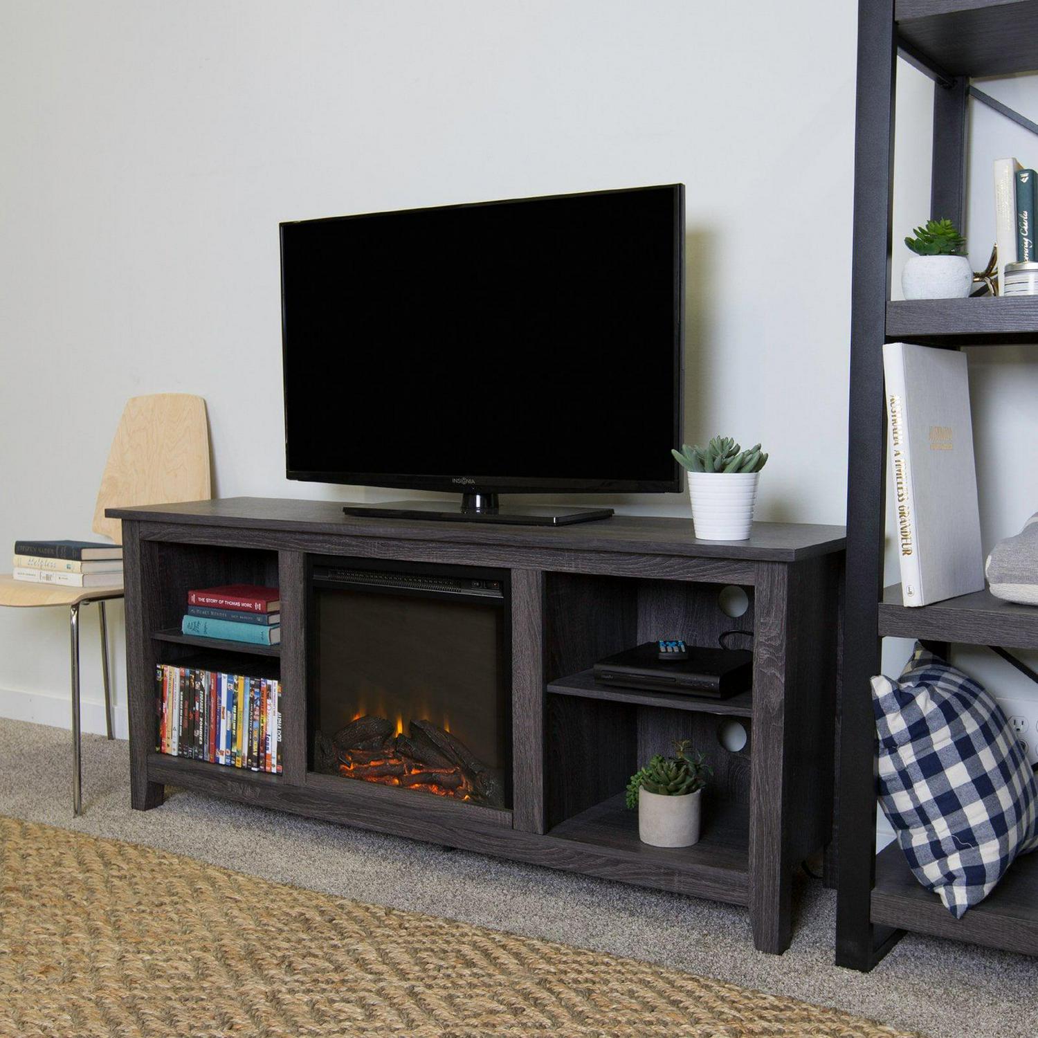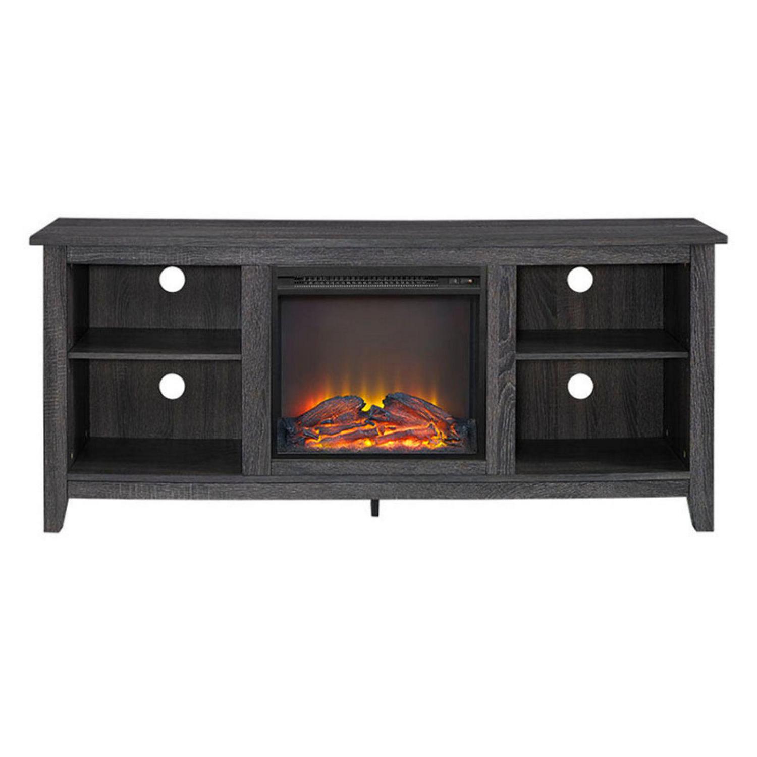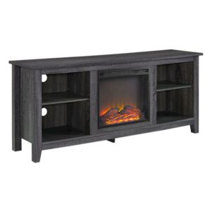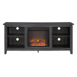 The Walker Edison Charcoal Wood Fireplace TV Stand is a functional and stylish piece that deserves center stage in your home. The top of the console can accommodate a flat-panel TV up to 60 inches. The body offers two side compartments, each with adjustable shelves and cord access ports at the rear. At the center is an electric crystal fireplace. This electric fireplace gives you the heat and light of a regular fireplace without the emissions, ash, or mess that comes with a regular, fuel-burning hearth. This console is crafted from high-grade engineered wood that won’t warp or crack with a laminate finish in a weathered lumber look.