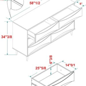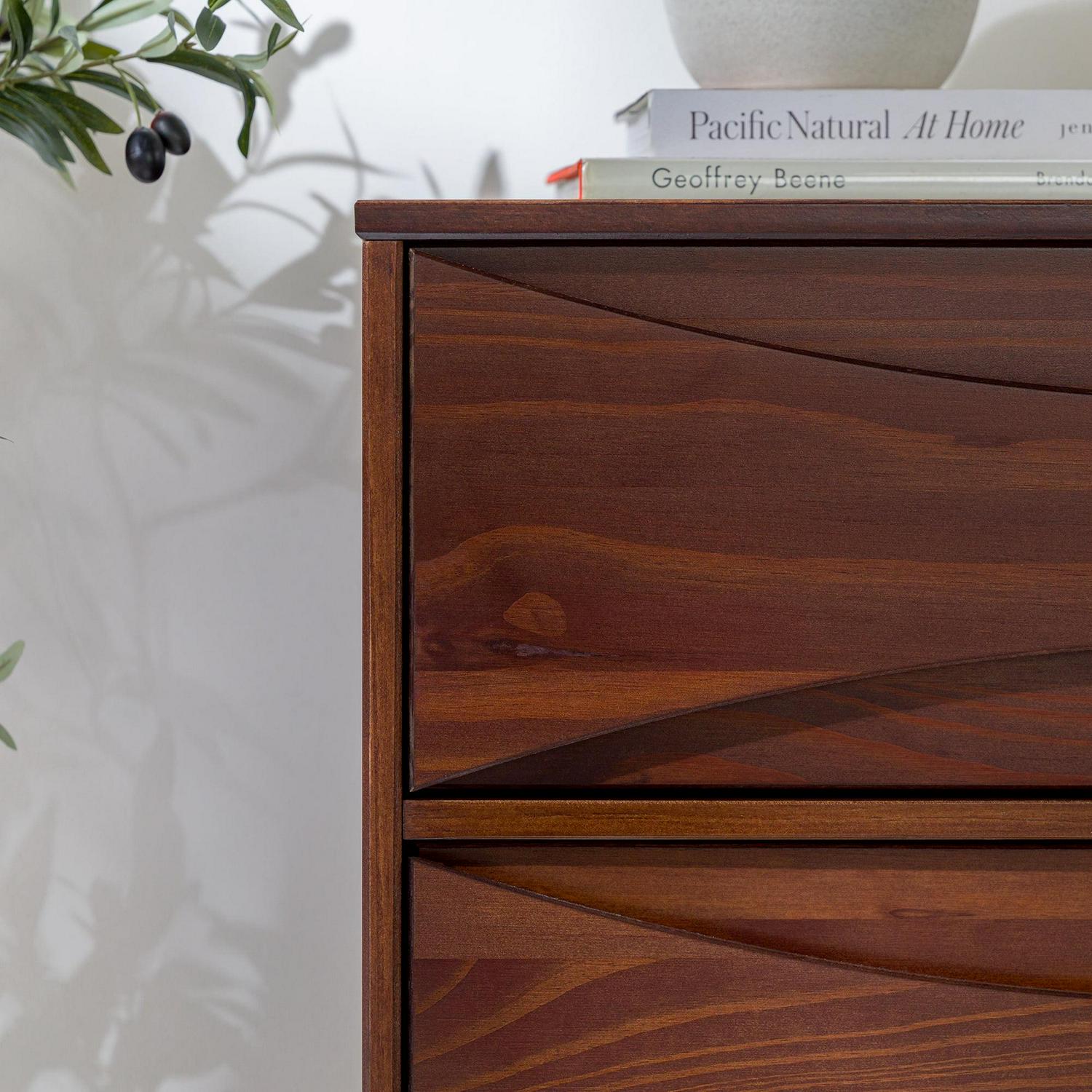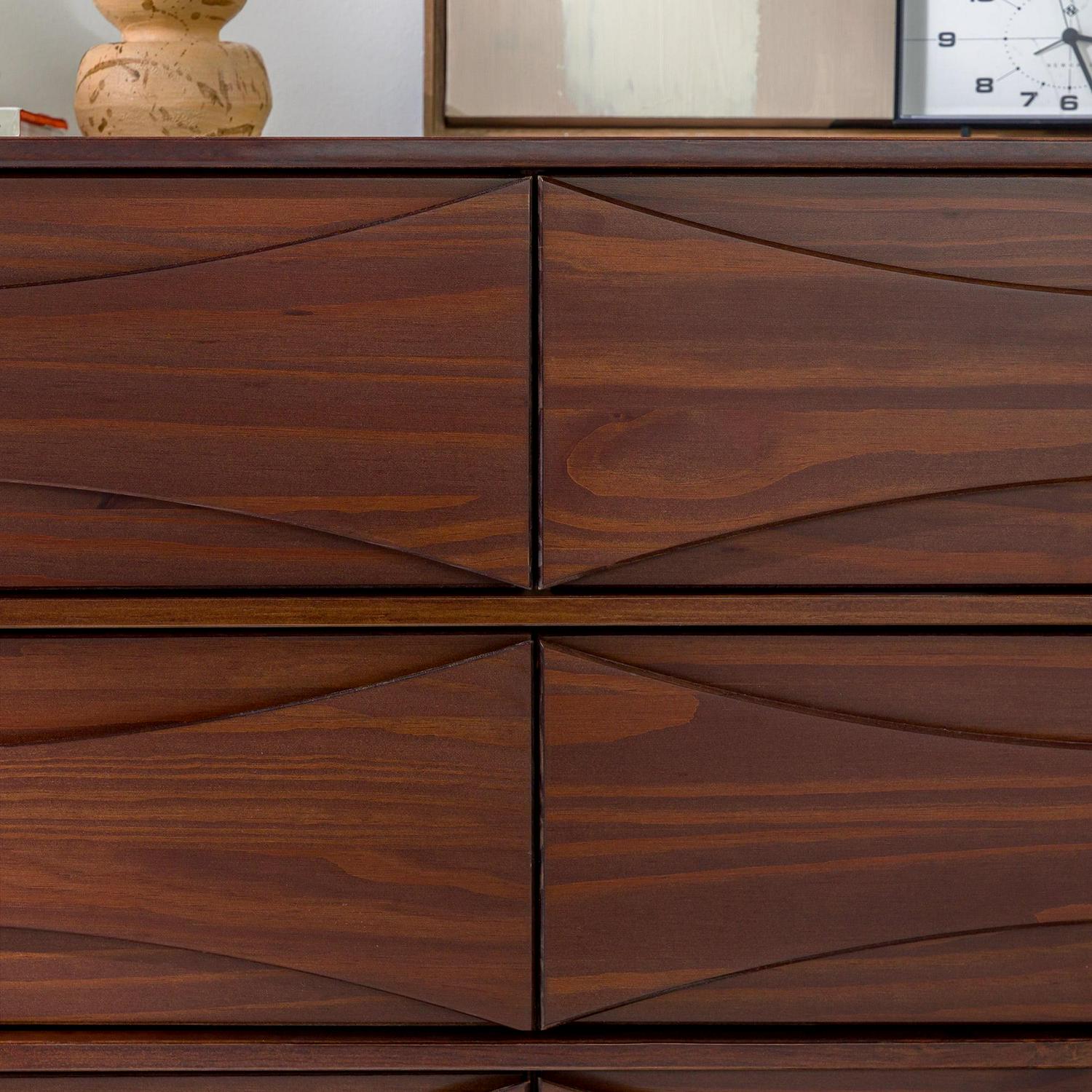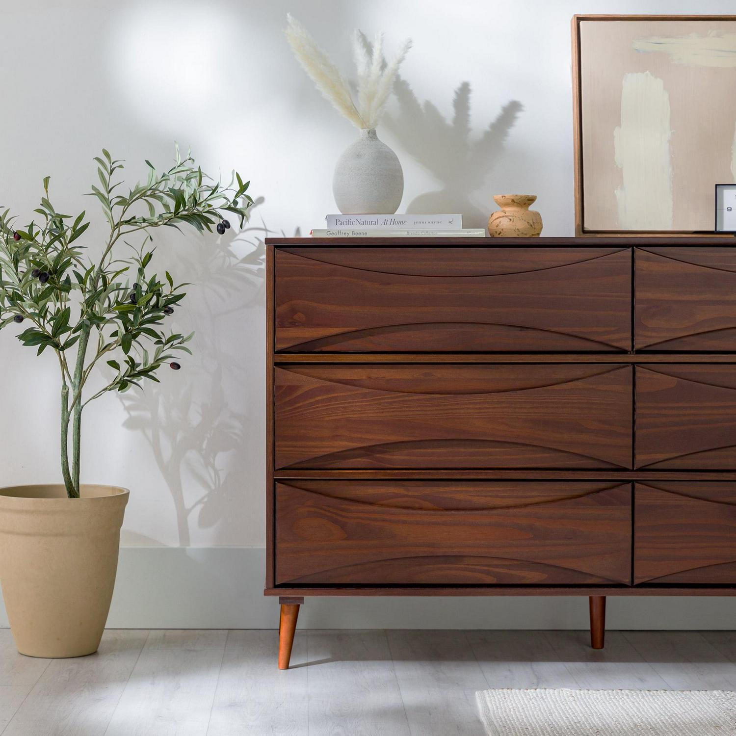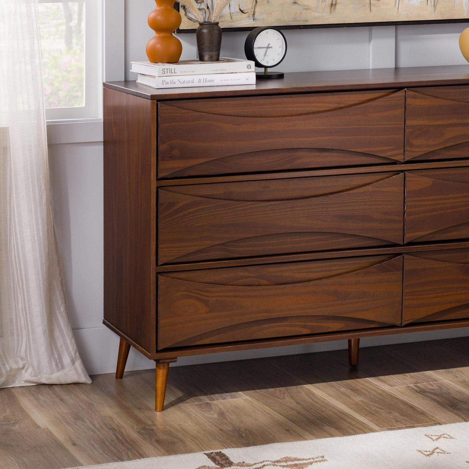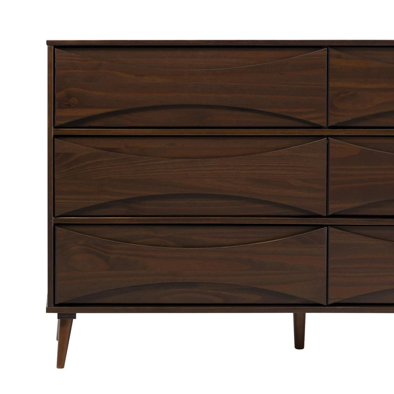 Add a stylish and practical dresser to your home with the Walker Edison 58 Mid-Century Modern Curved Front 6-Drawer Dresser. This eye-catching dresser features unique, curved detailing on the front of the drawers, which gives it a retro-inspired look that is sure to stand out. The tapered legs add an extra touch of style, while the six spacious drawers provide plenty of room for storing the essentials. Made from responsibly harvested solid pine wood, this dresser is both environmentally friendly and long-lasting.