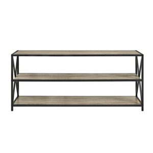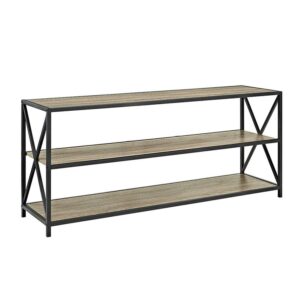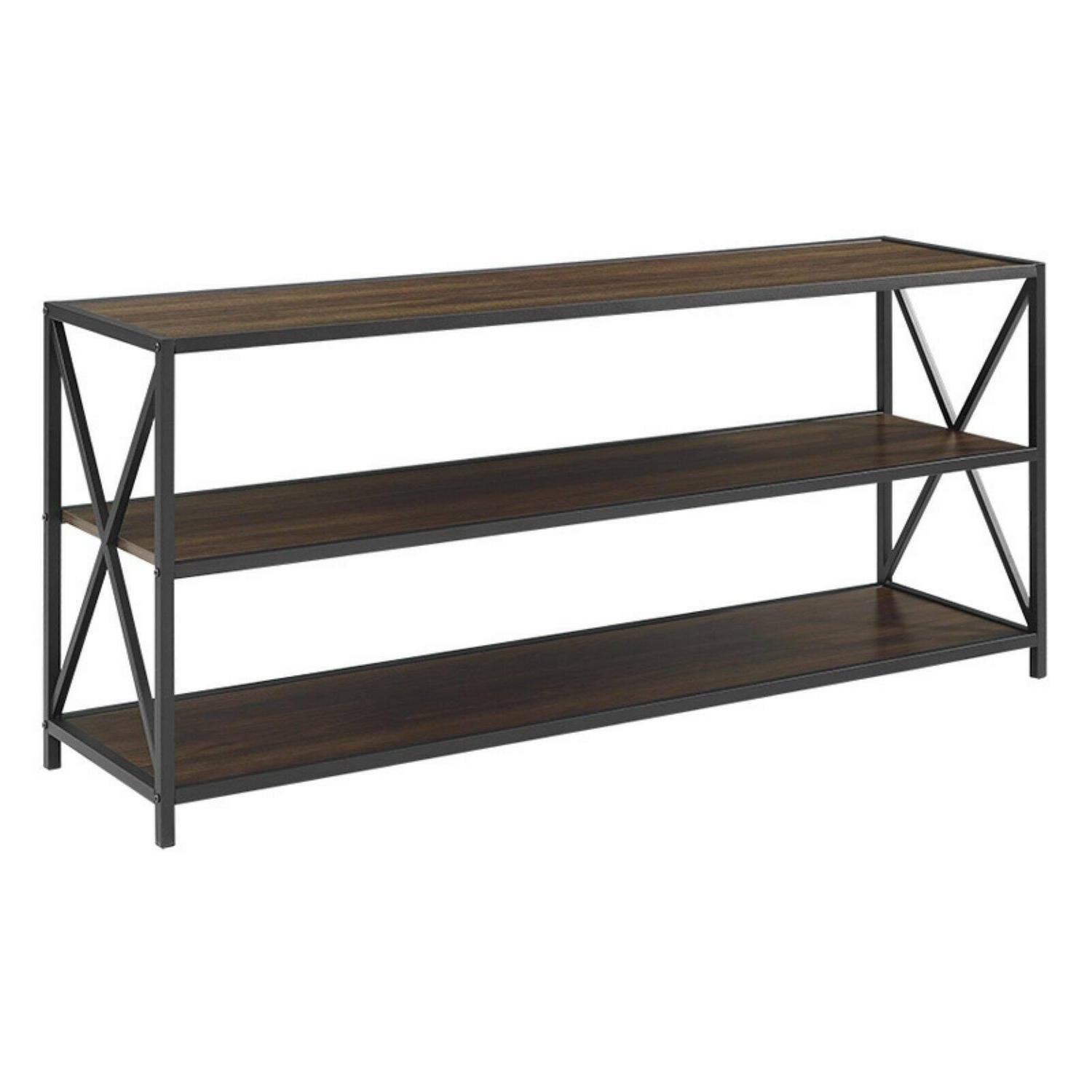 You can’t go wrong with storage and versatility, and the Walker Edison 60 in. Wide X-Frame Media Bookshelf has both! Use this three-shelved piece as a bookshelf, TV stand, buffet, console table, and more. Its simple X-frame design exudes a light and airy feel, while the dark powder-coated metal and MDF shelves in your choice of available finishes adds a dash of industrial elegance. Ships ready to assemble.