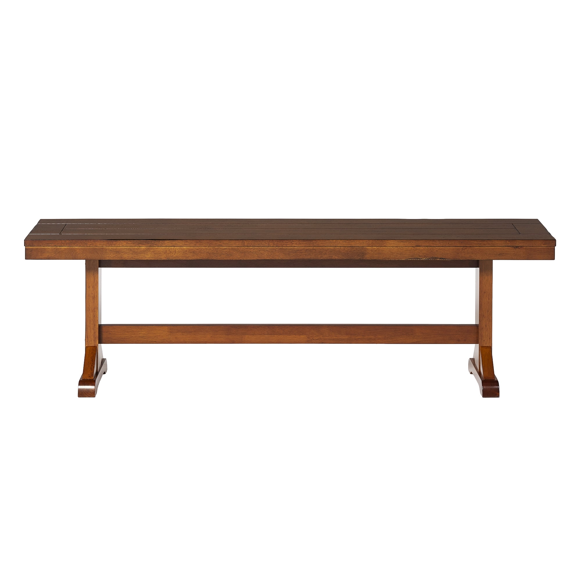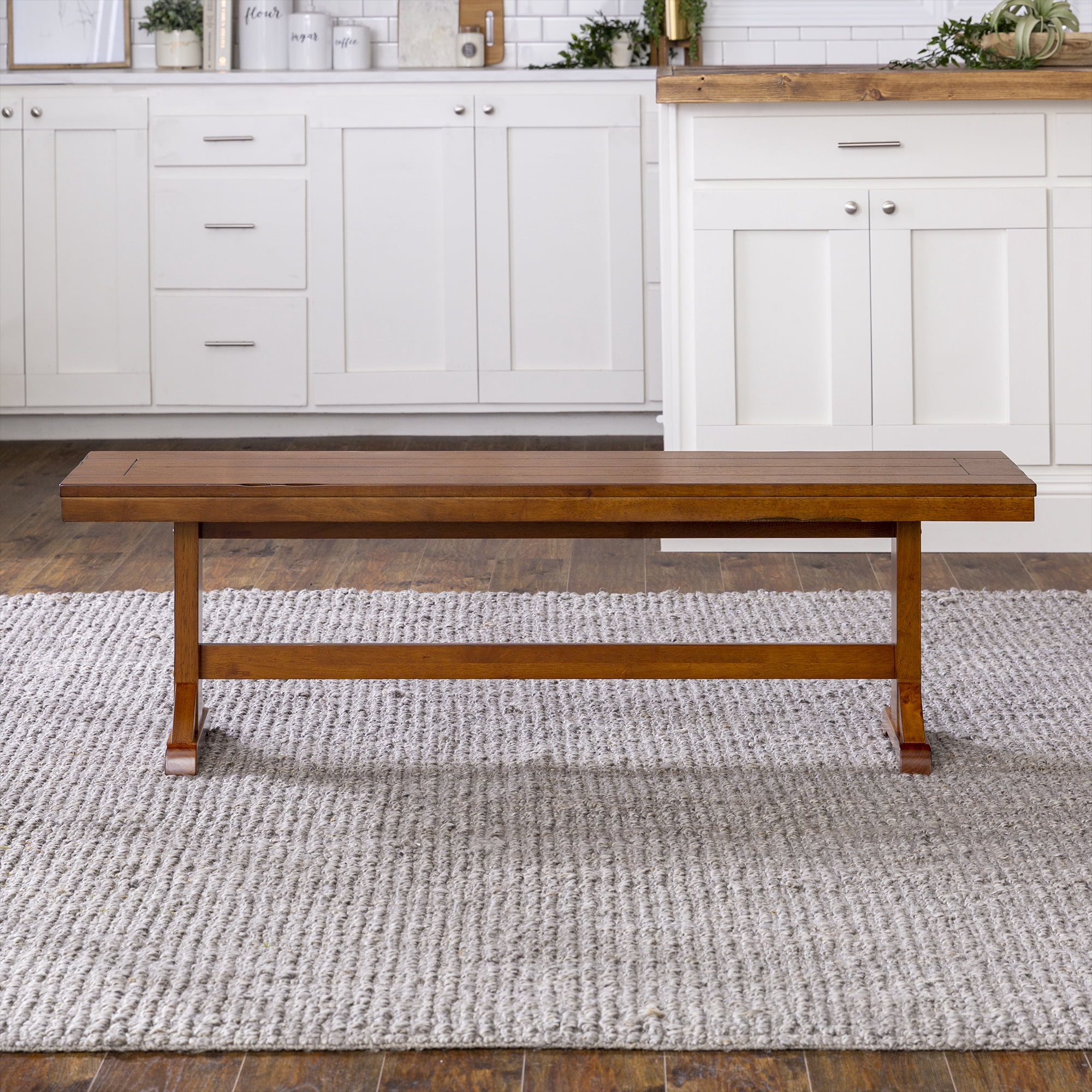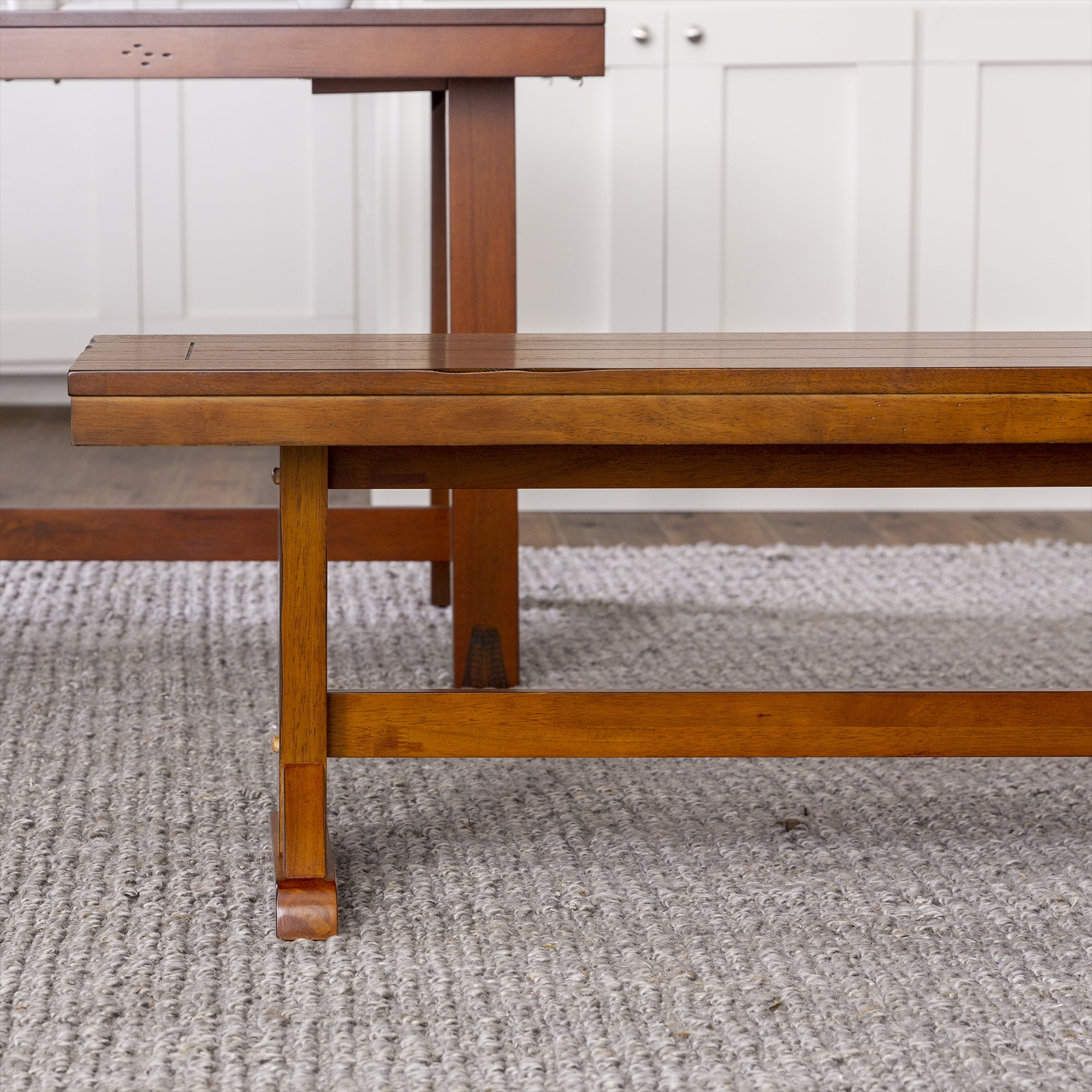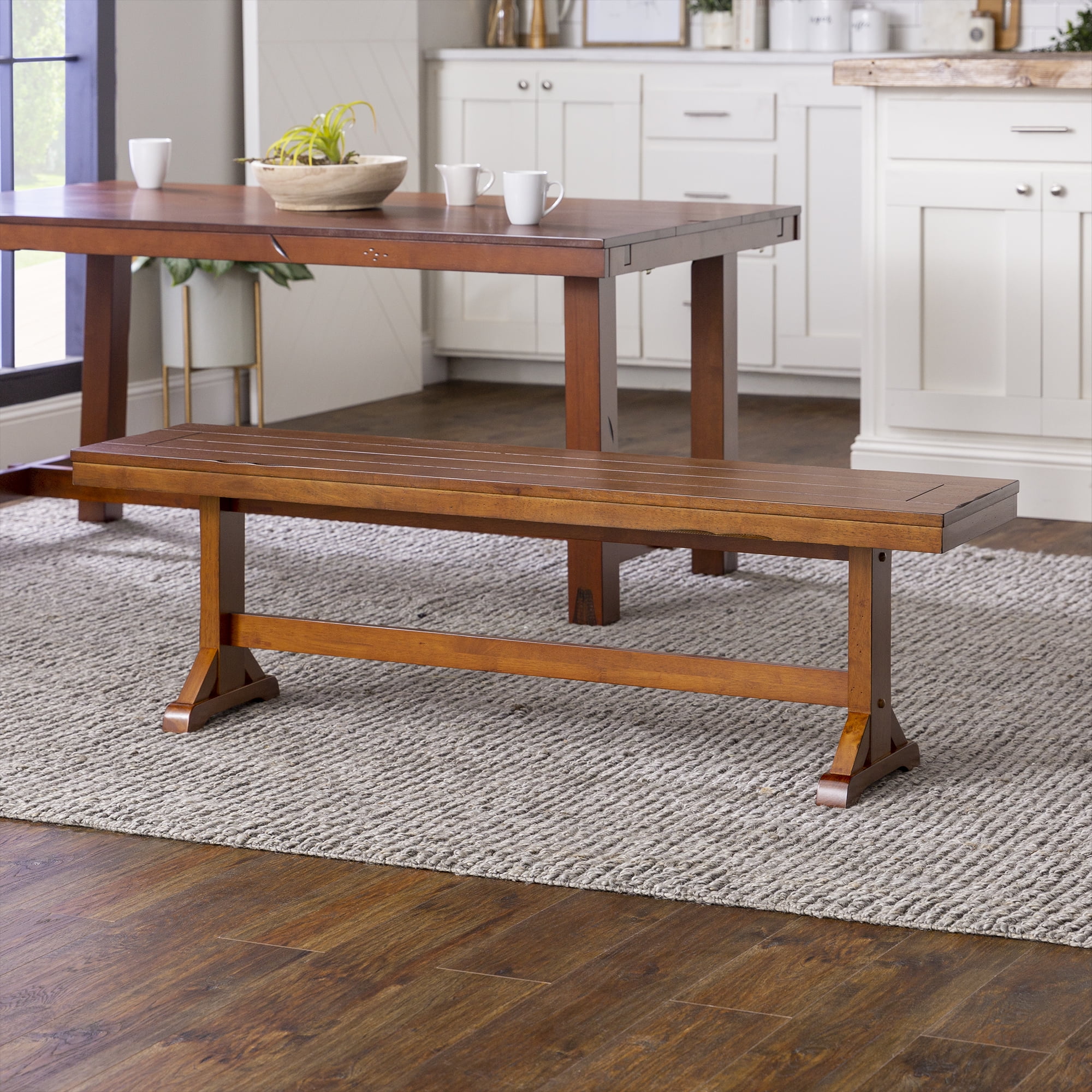 Grace your traditional dining room set up with this rectangle bench by Walker Edison. Trestle style legs and a planked top provide a versatility that allows this bench to fit in with any home decor. Pull this dining bench up to your kitchen table during every family gathering to create more space for everyone to sit comfortably. Made from high-grade MDF topped with solid wood veneers, this transitional bench is built to help you make memories with friends and family with its durable construction. This piece can also be used as an entryway bench for a quick stop to pull off your shoes as soon as you walk in the door after a long day at work.