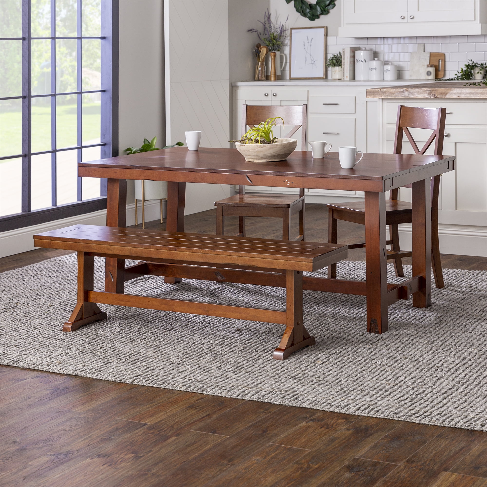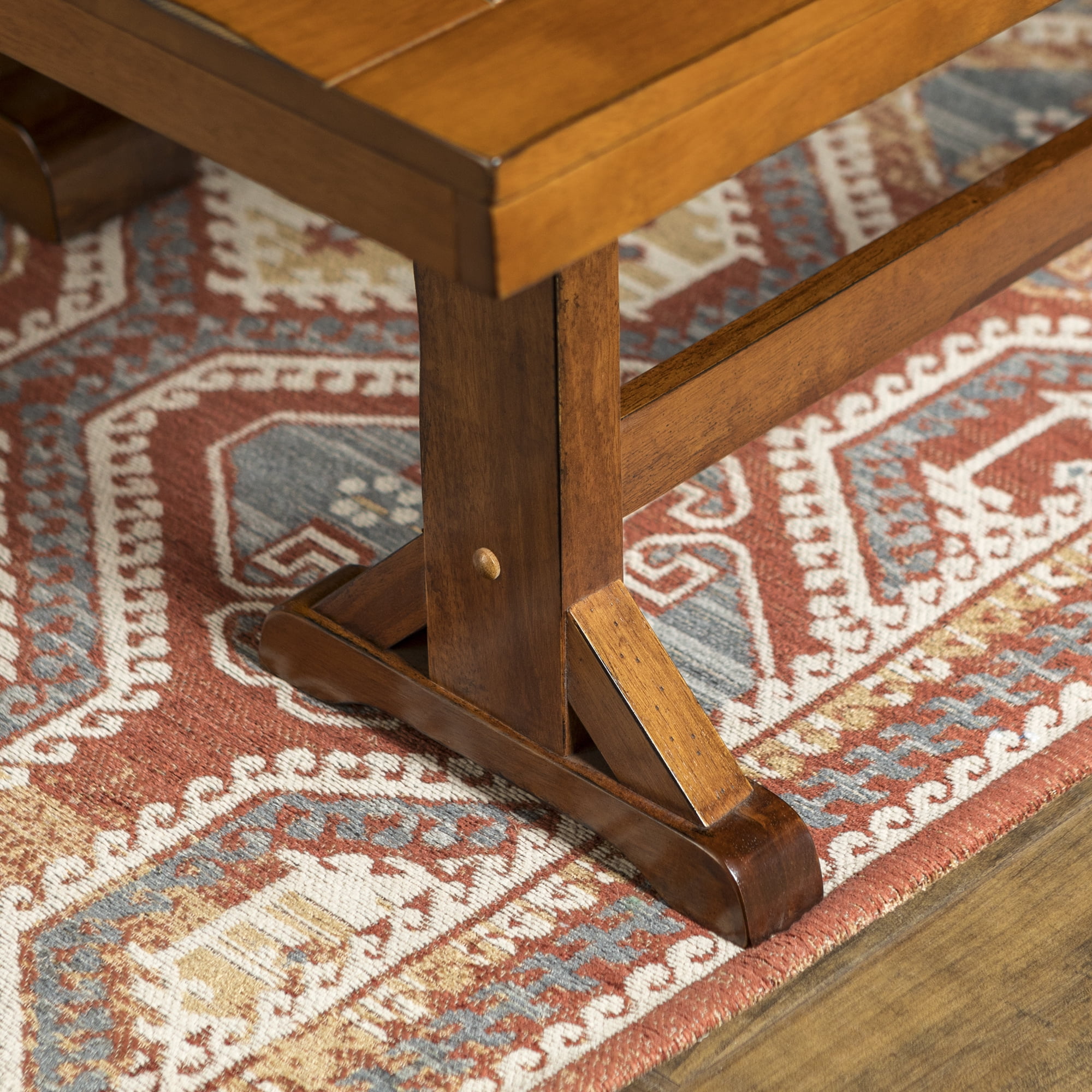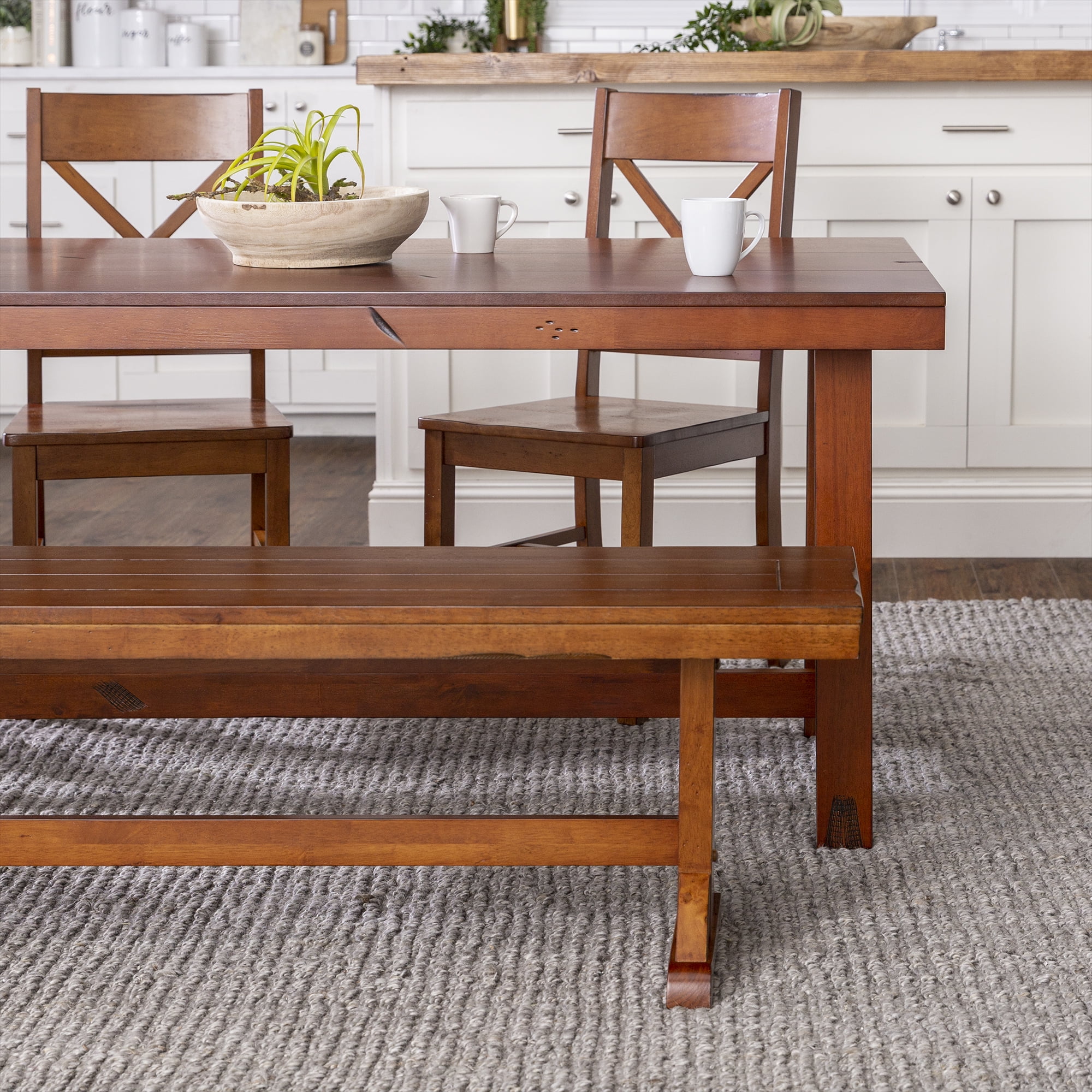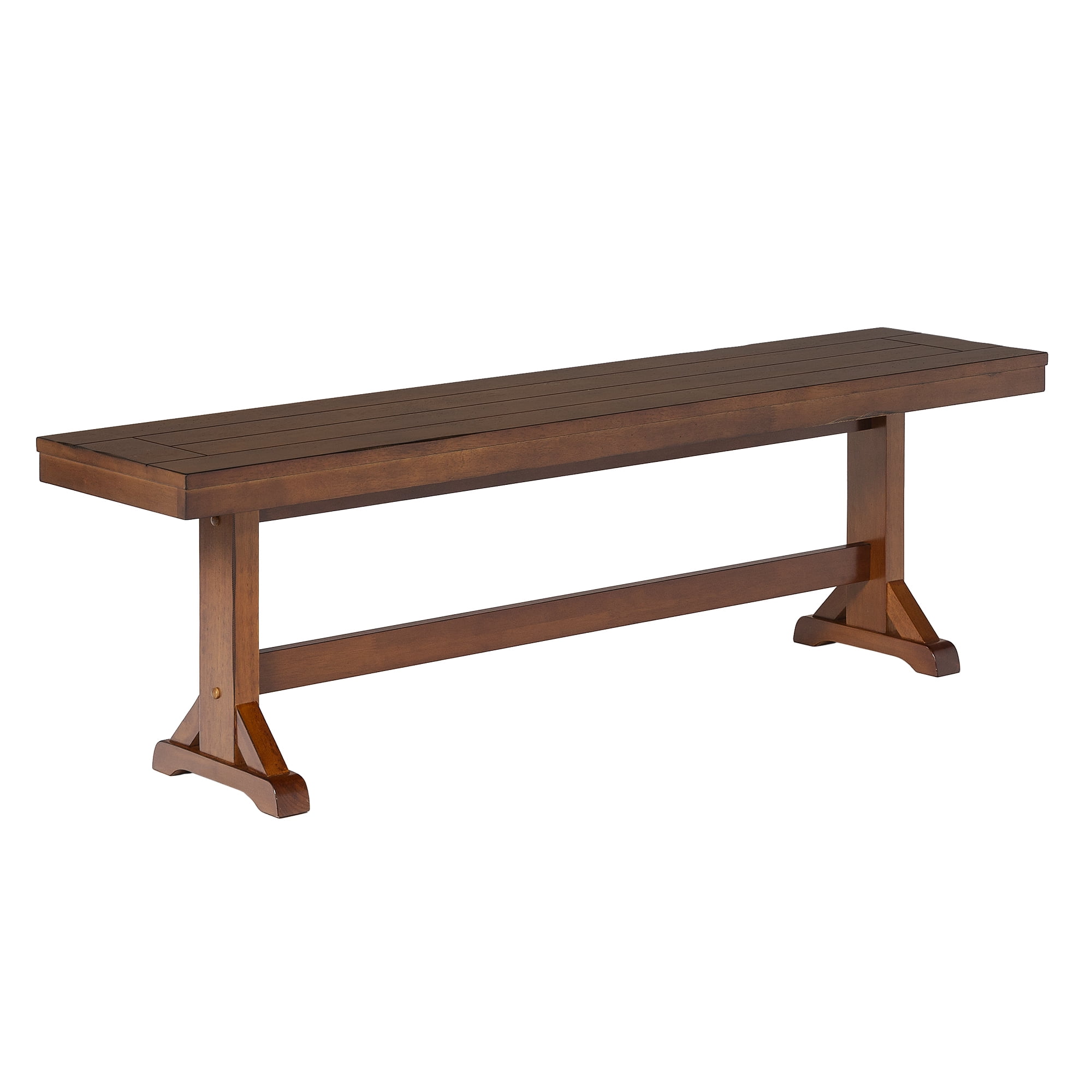 Grace your traditional dining room set up with this rectangle bench by Walker Edison. Trestle style legs and a planked top provide a versatility that allows this bench to fit in with any home decor. Pull this dining bench up to your kitchen table during every family gathering to create more space for everyone to sit comfortably. Made from high-grade MDF topped with solid wood veneers, this transitional bench is built to help you make memories with friends and family with its durable construction. This piece can also be used as an entryway bench for a quick stop to pull off your shoes as soon as you walk in the door after a long day at work.