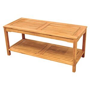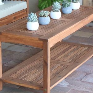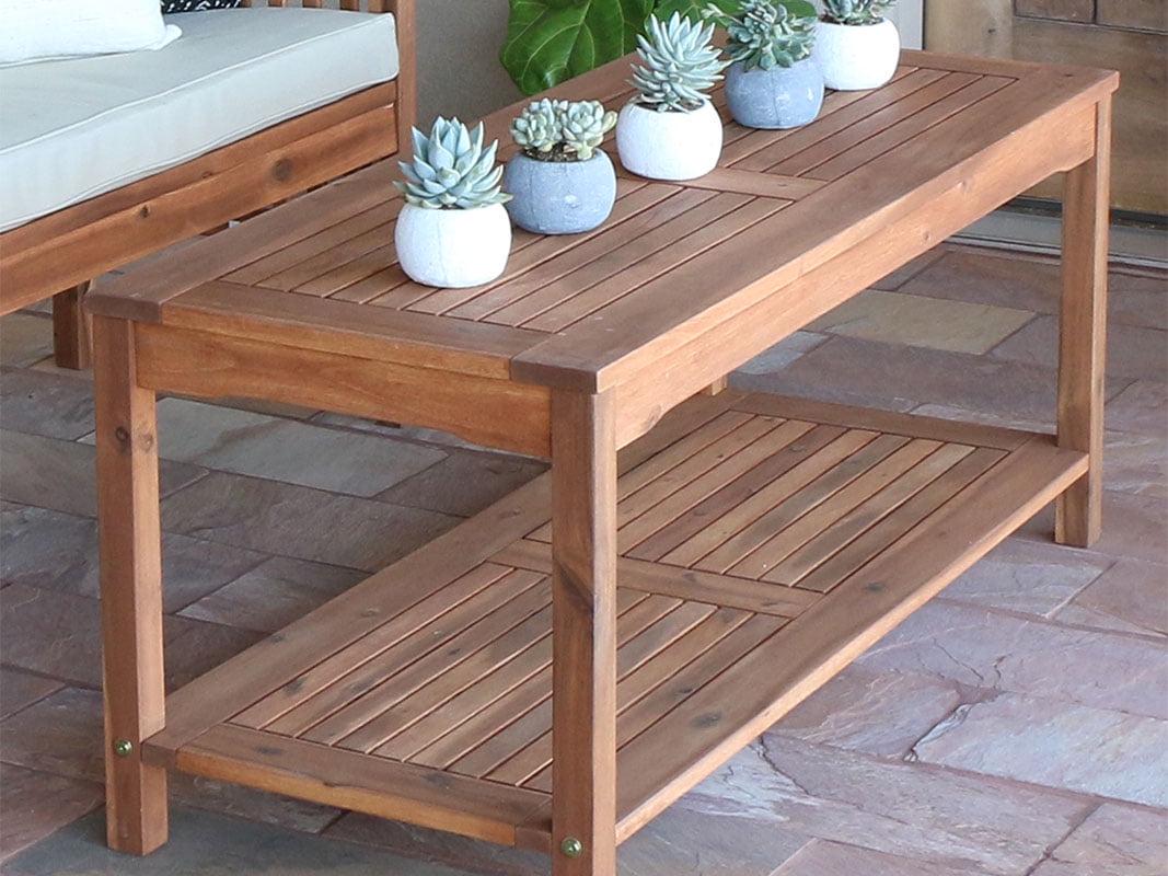 This stylish coffee table offers two levels to provide you ample storage for your outdoor accessories. Crafted from solid acacia hardwood, this table is naturally stylish yet durable to last summers to come. Set next to a loveseat or chairs on your patio or deck so you ll always have a spot to enjoy a drink or snack outdoors. Pair it with our matching loveseat and chairs for a complete patio set.