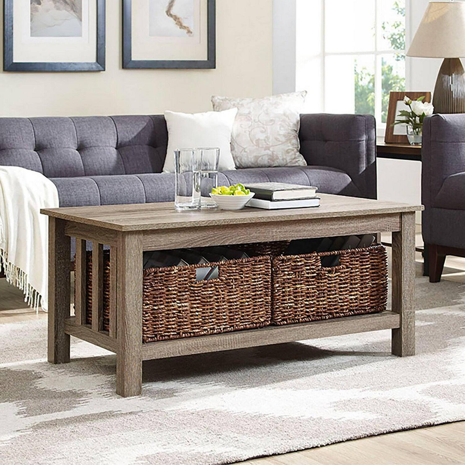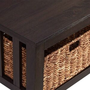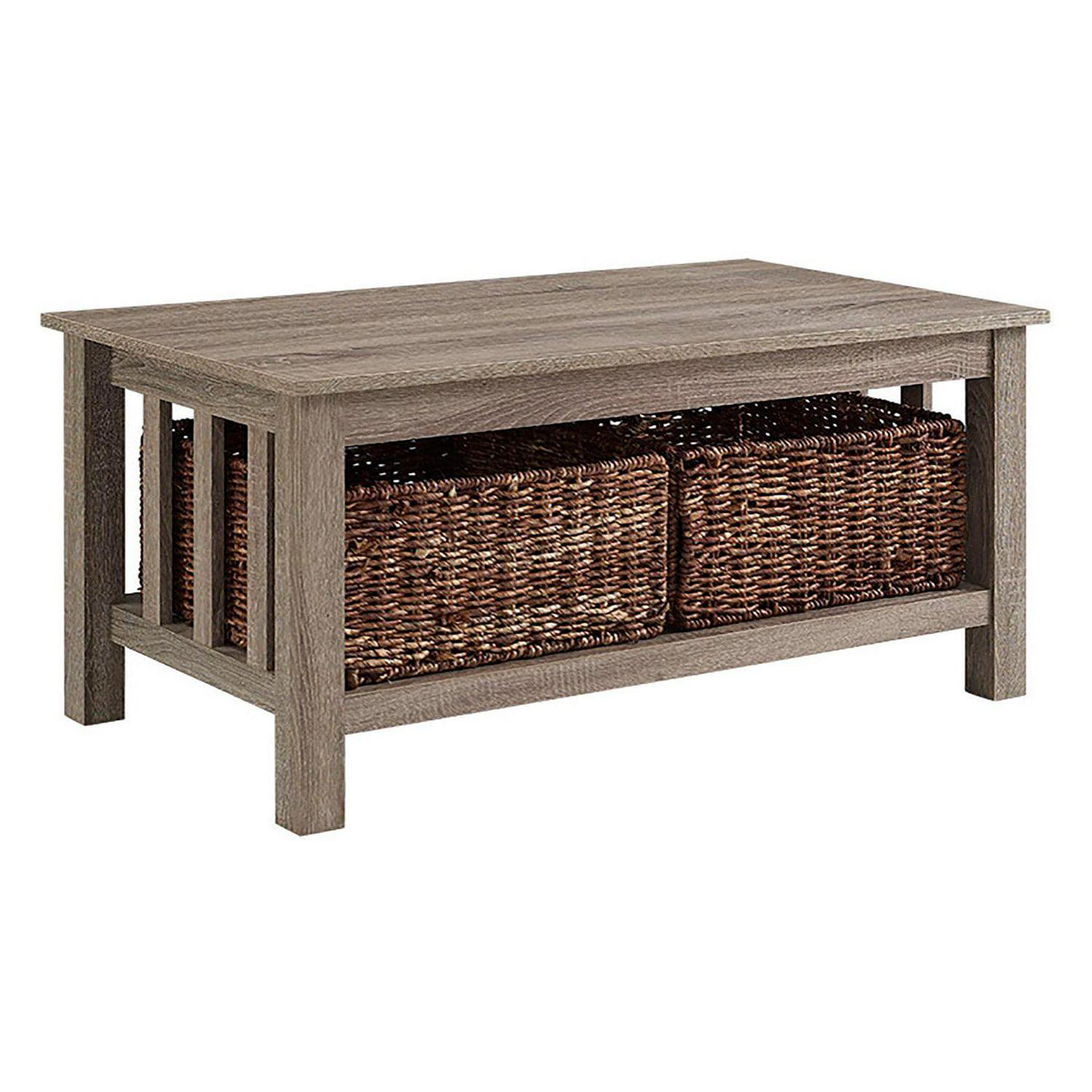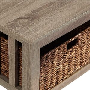 Walker Edison Alayna Mission Style Two Tier Coffee Table with Rattan Storage Baskets, 40 Inch, Grey/Brown