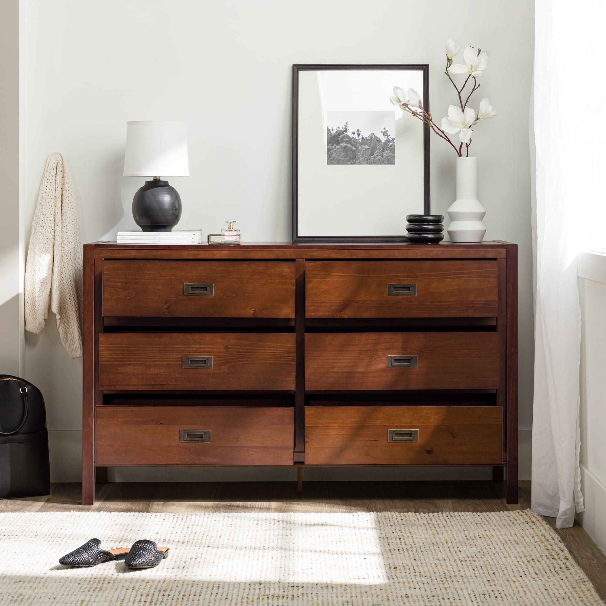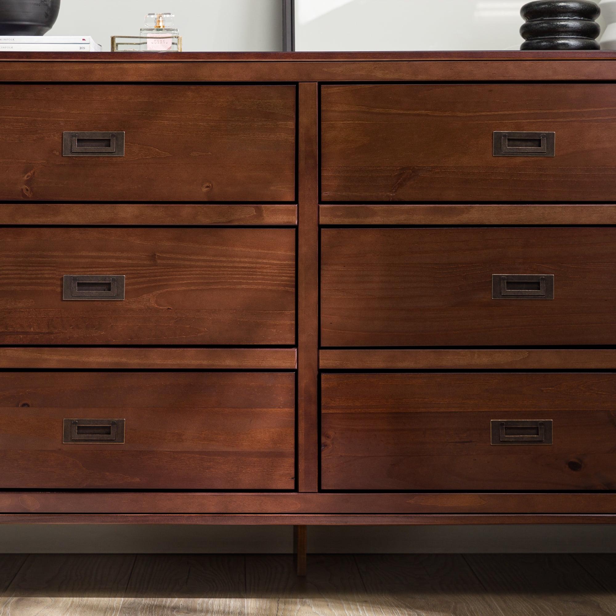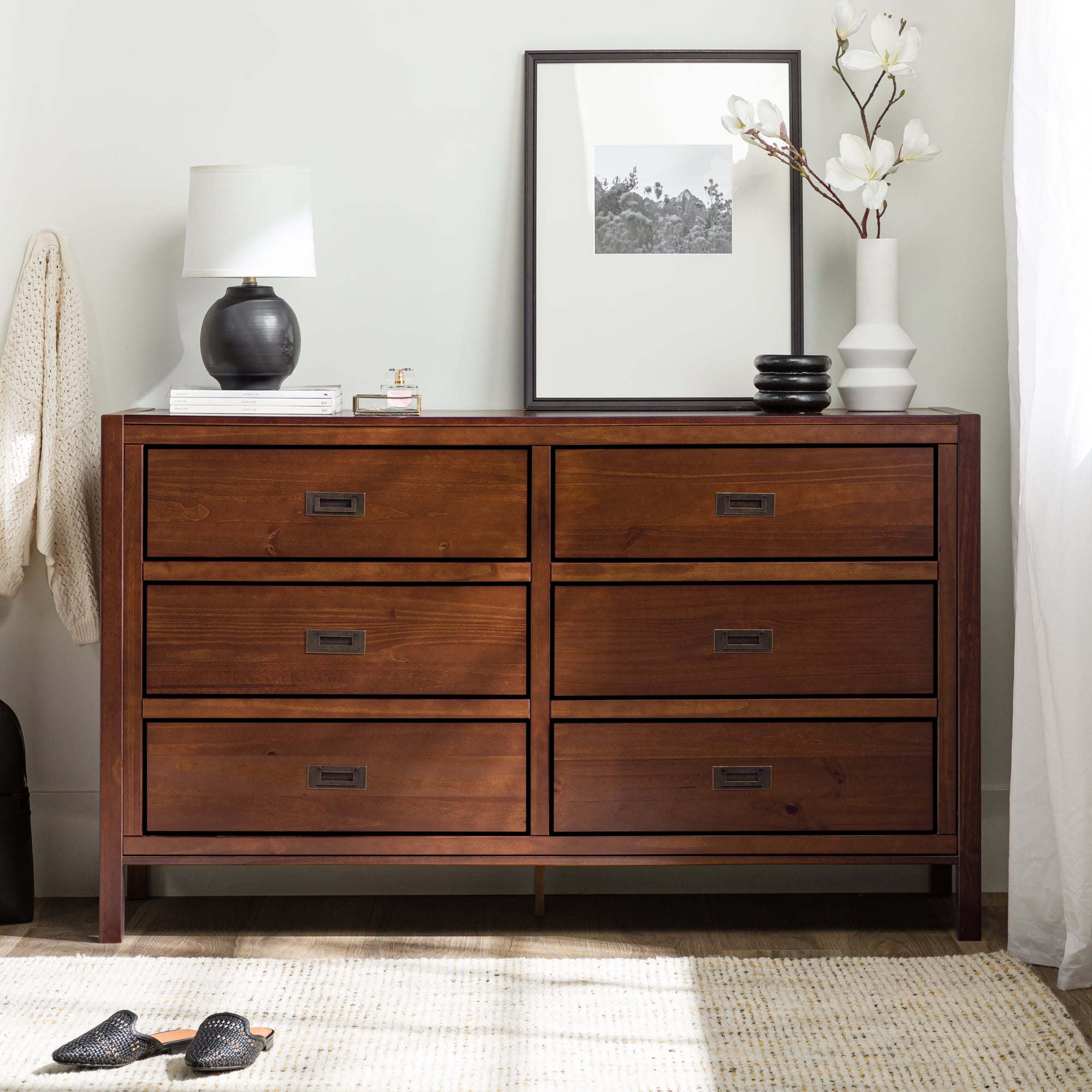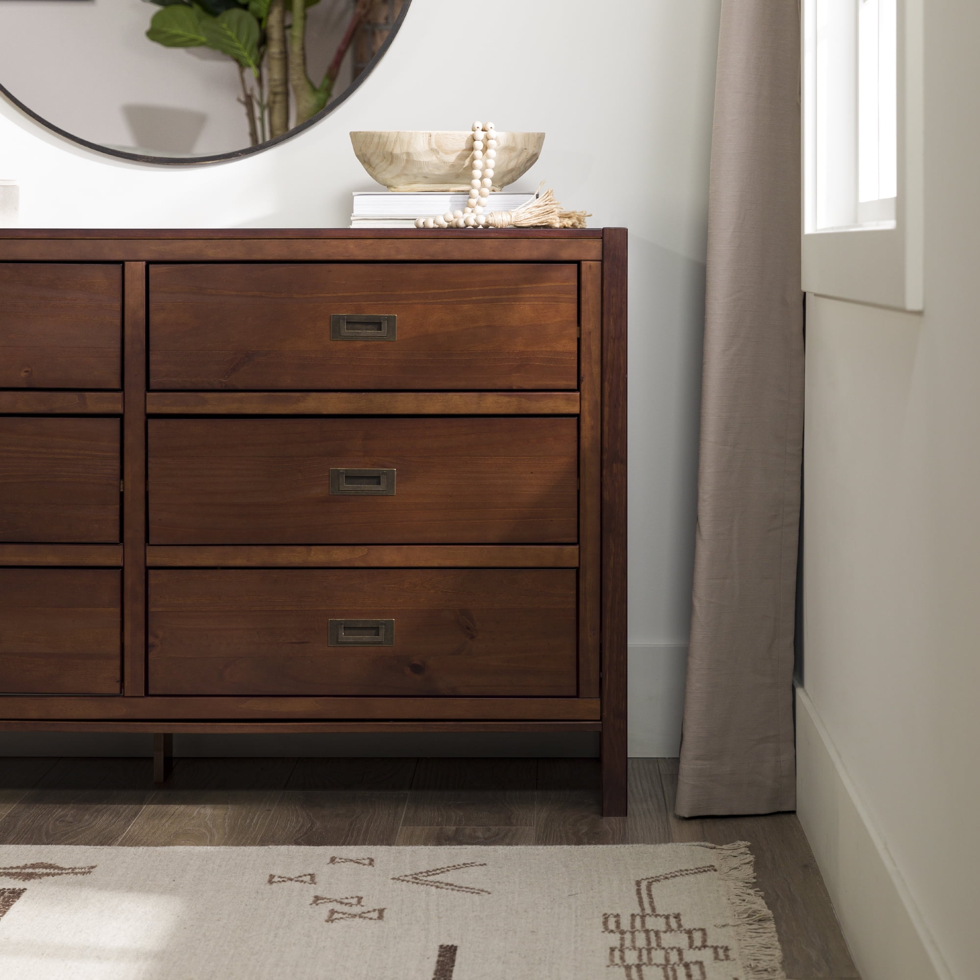 Six easy to open drawers with cutout metal handles. Classic black painted finish. Durable materials. What more could you want out of a dresser than the Annabelle Six Drawer Solid Wood Walnut Dresser by Walker Edison? The solid wood frame, high grade MDF backing and drawer bottoms, and metal hardware ensure this dresser will last a lifetime. The timeless silhouette will never go out of style and will match whatever interior decorating you have throughout the years. Tuck clothing, shoes, or other items out of sight in one of the six large drawers. You’ll feel more organized than ever after adding this dresser to your collection.