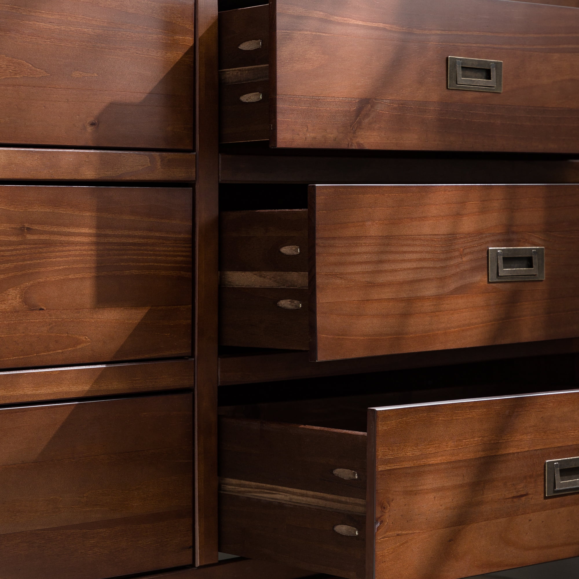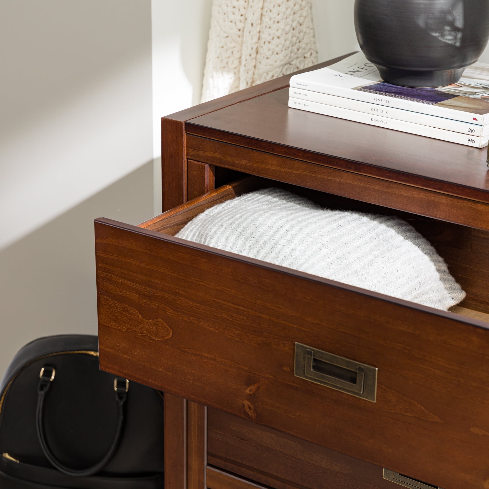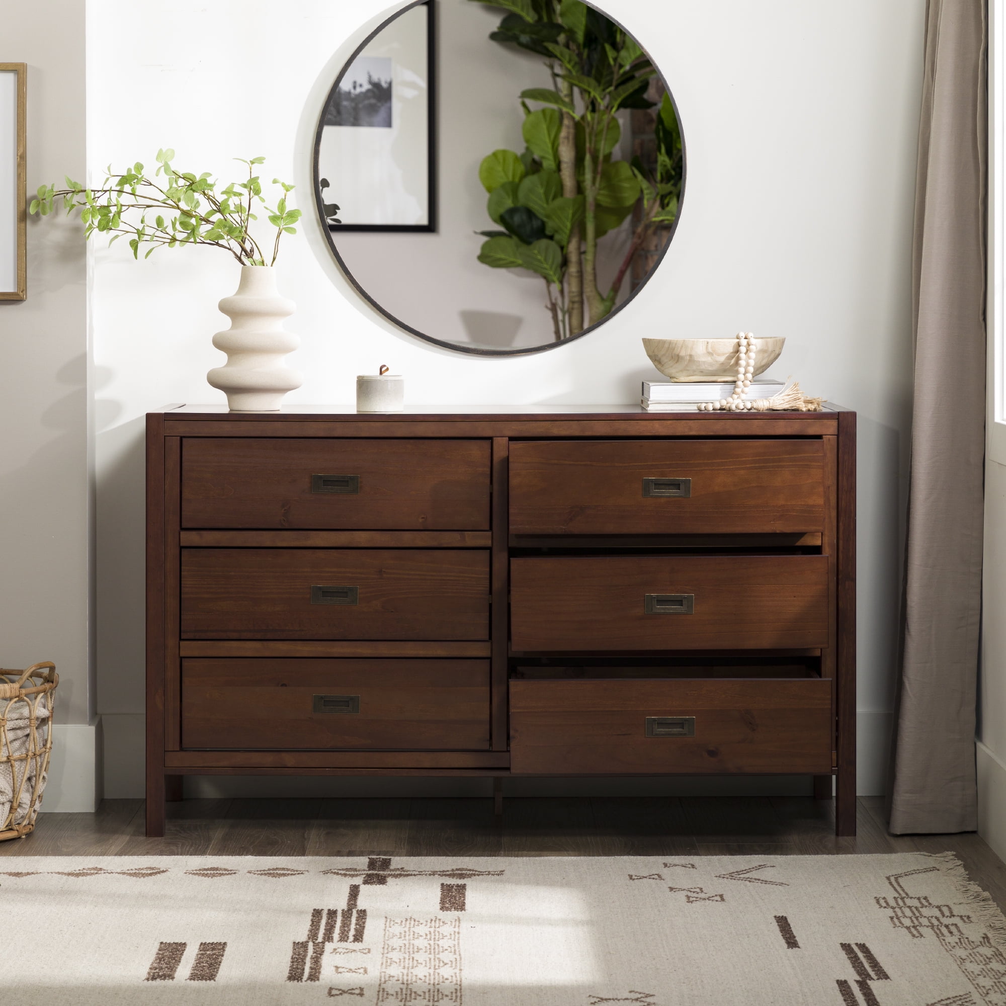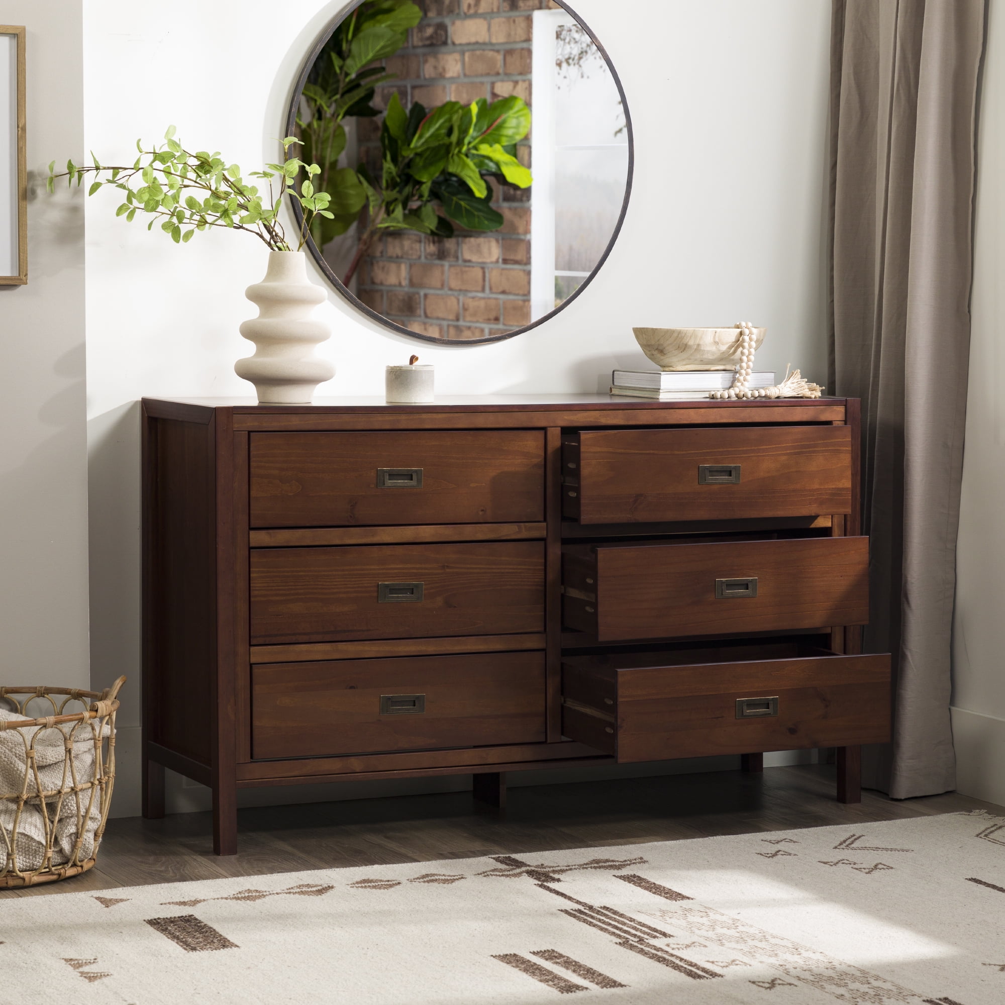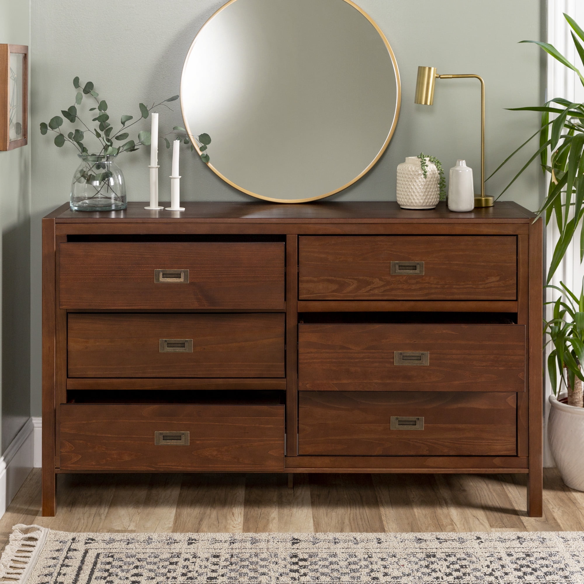 Six easy to open drawers with cutout metal handles. Classic black painted finish. Durable materials. What more could you want out of a dresser than the Annabelle Six Drawer Solid Wood Walnut Dresser by Walker Edison? The solid wood frame, high grade MDF backing and drawer bottoms, and metal hardware ensure this dresser will last a lifetime. The timeless silhouette will never go out of style and will match whatever interior decorating you have throughout the years. Tuck clothing, shoes, or other items out of sight in one of the six large drawers. You’ll feel more organized than ever after adding this dresser to your collection.