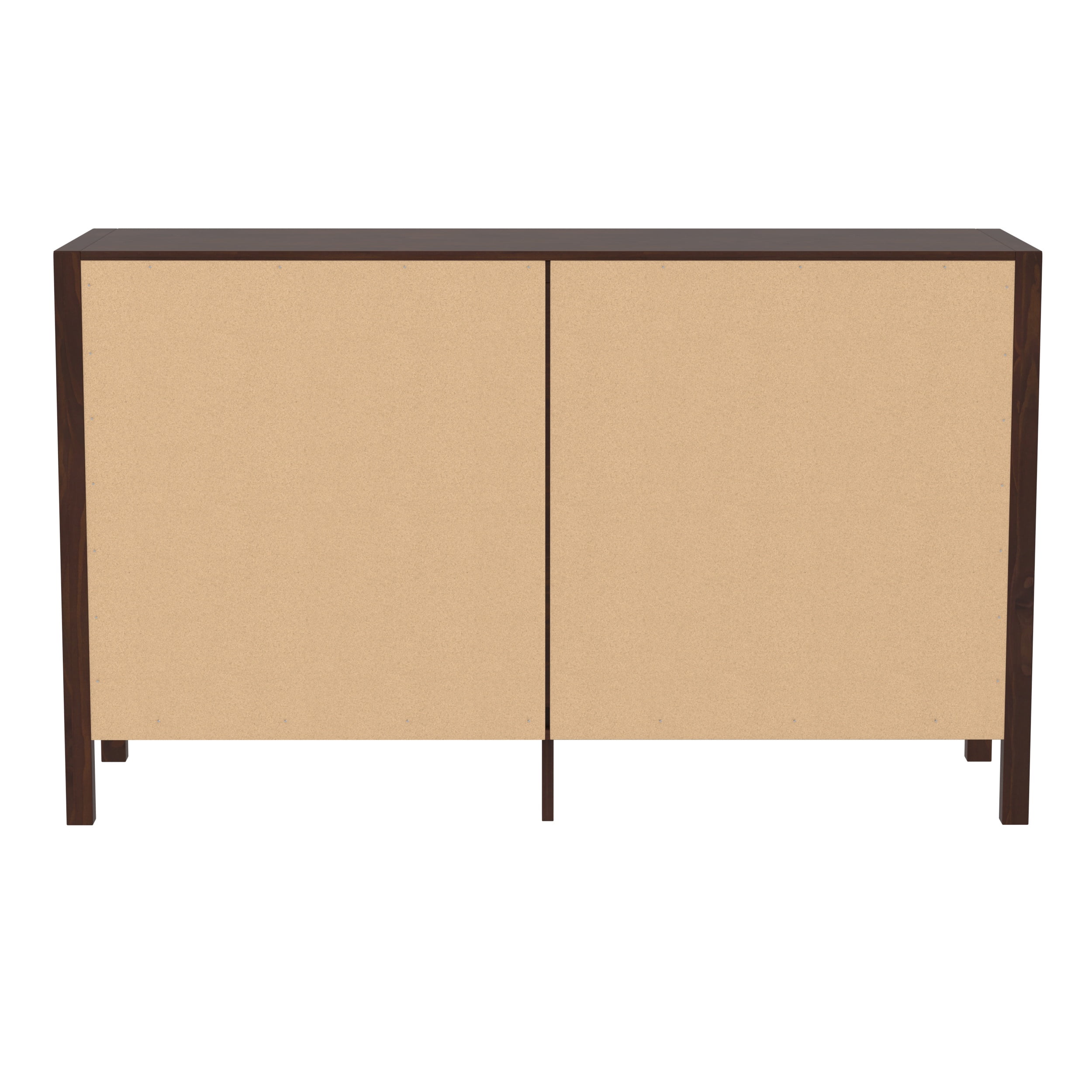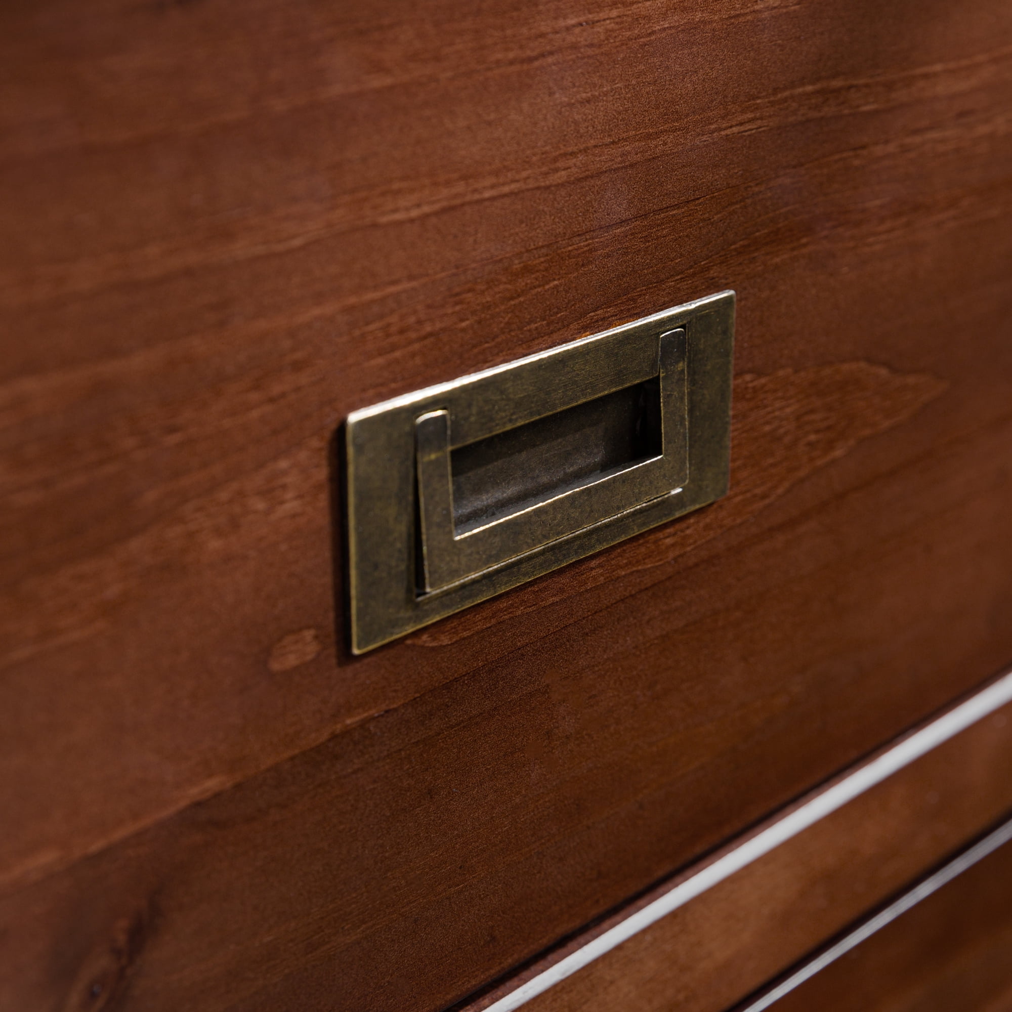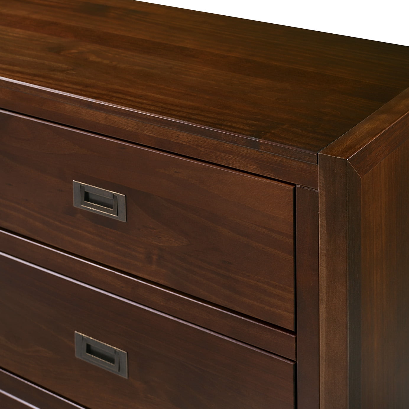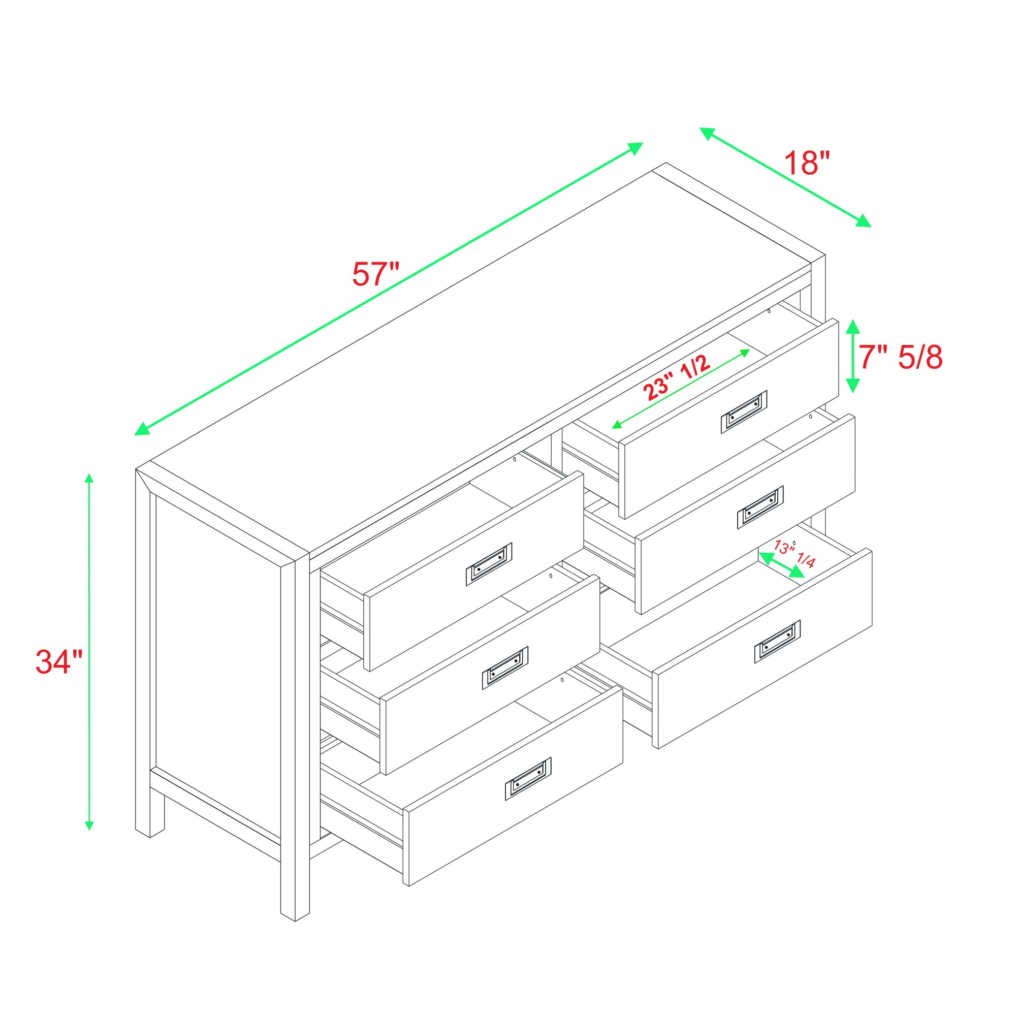 Packaged dimensions: 5″ H x 58″ L x 37″ W Assembled Dimensions: 34” H x 57” L x 18” W Materials: Solid wood, high grade MDF, and metal Assembly: Some assembly required Modern style dresser Walnut painted finish Closed storage Six drawers with wood runners Cutout painted metal handles Finished drawer interiors