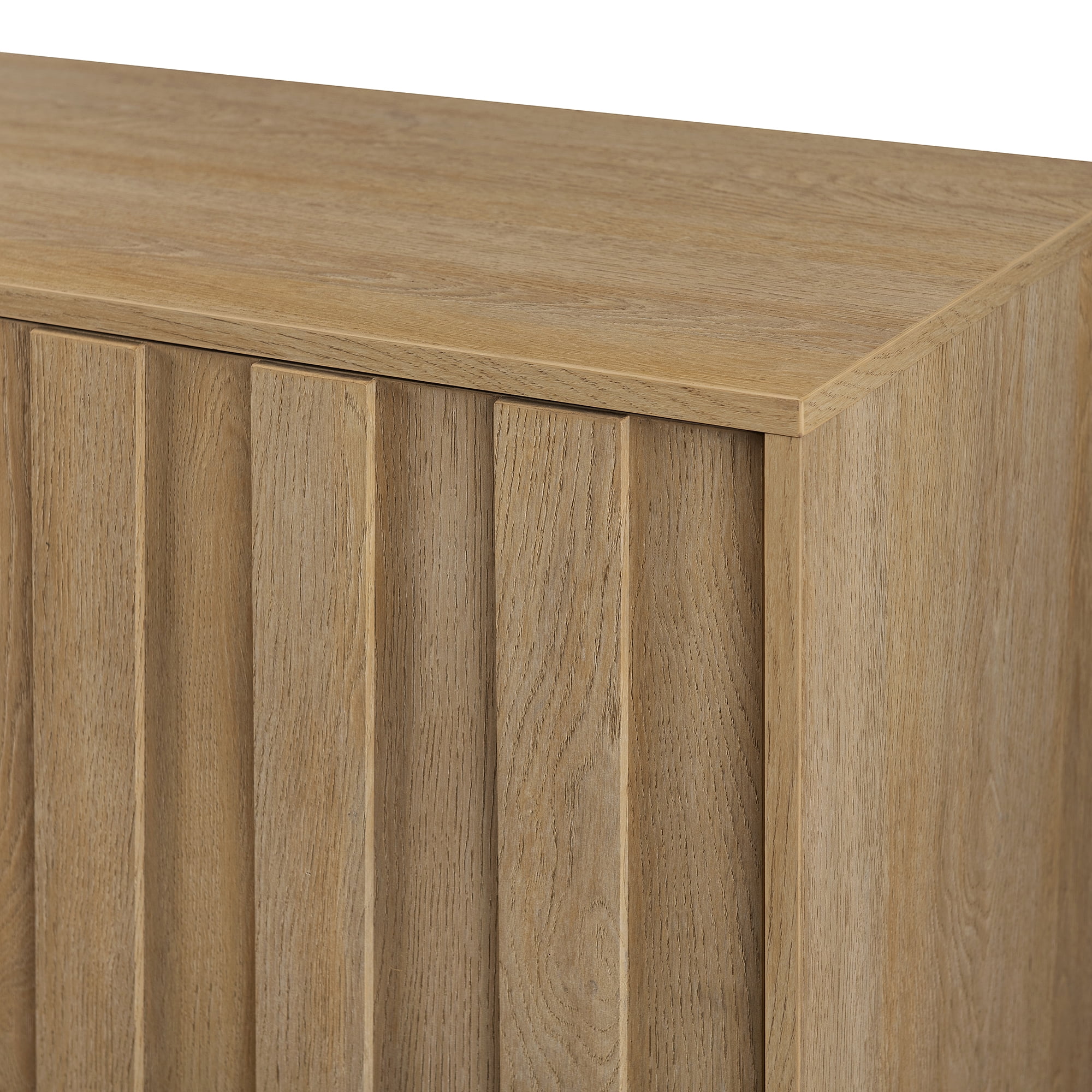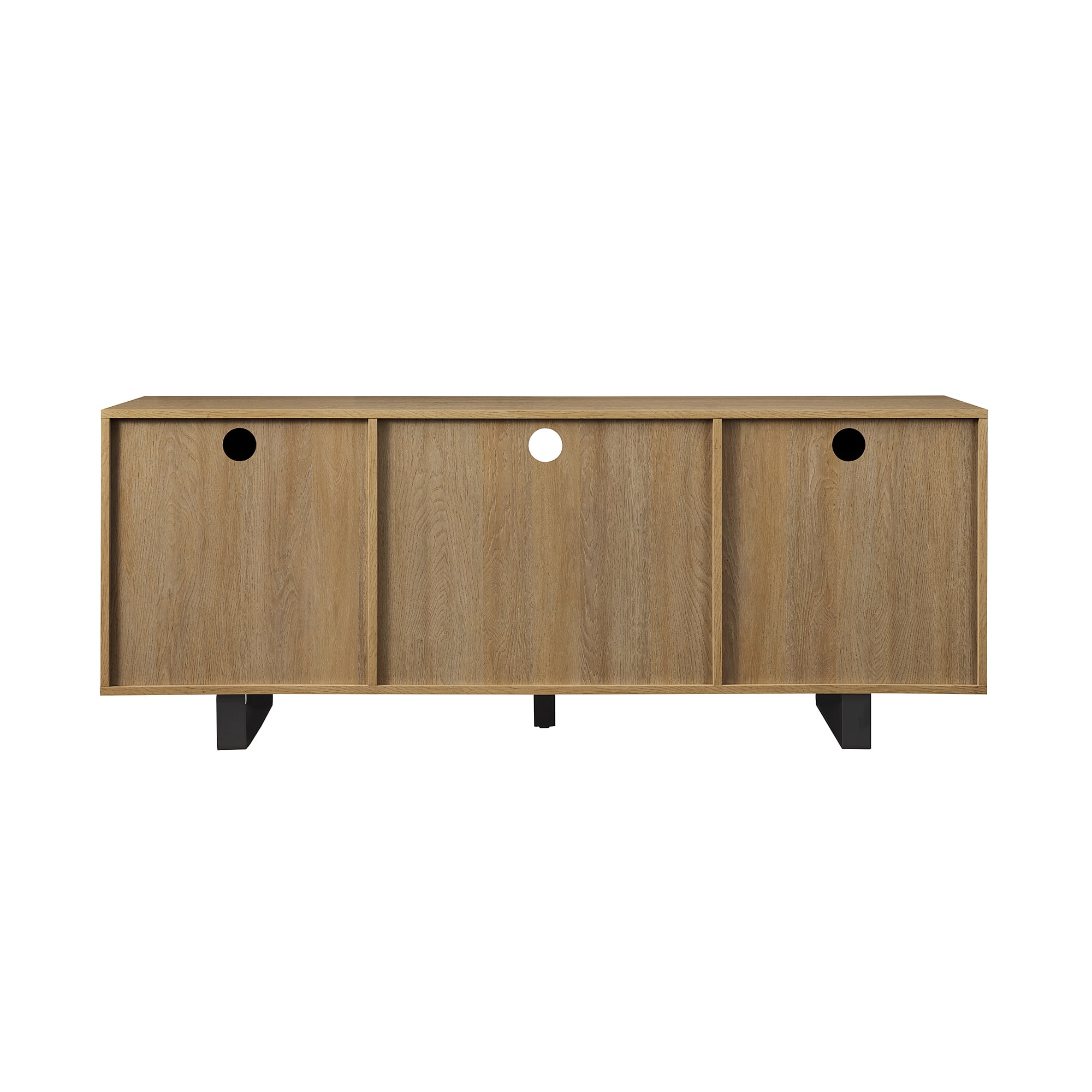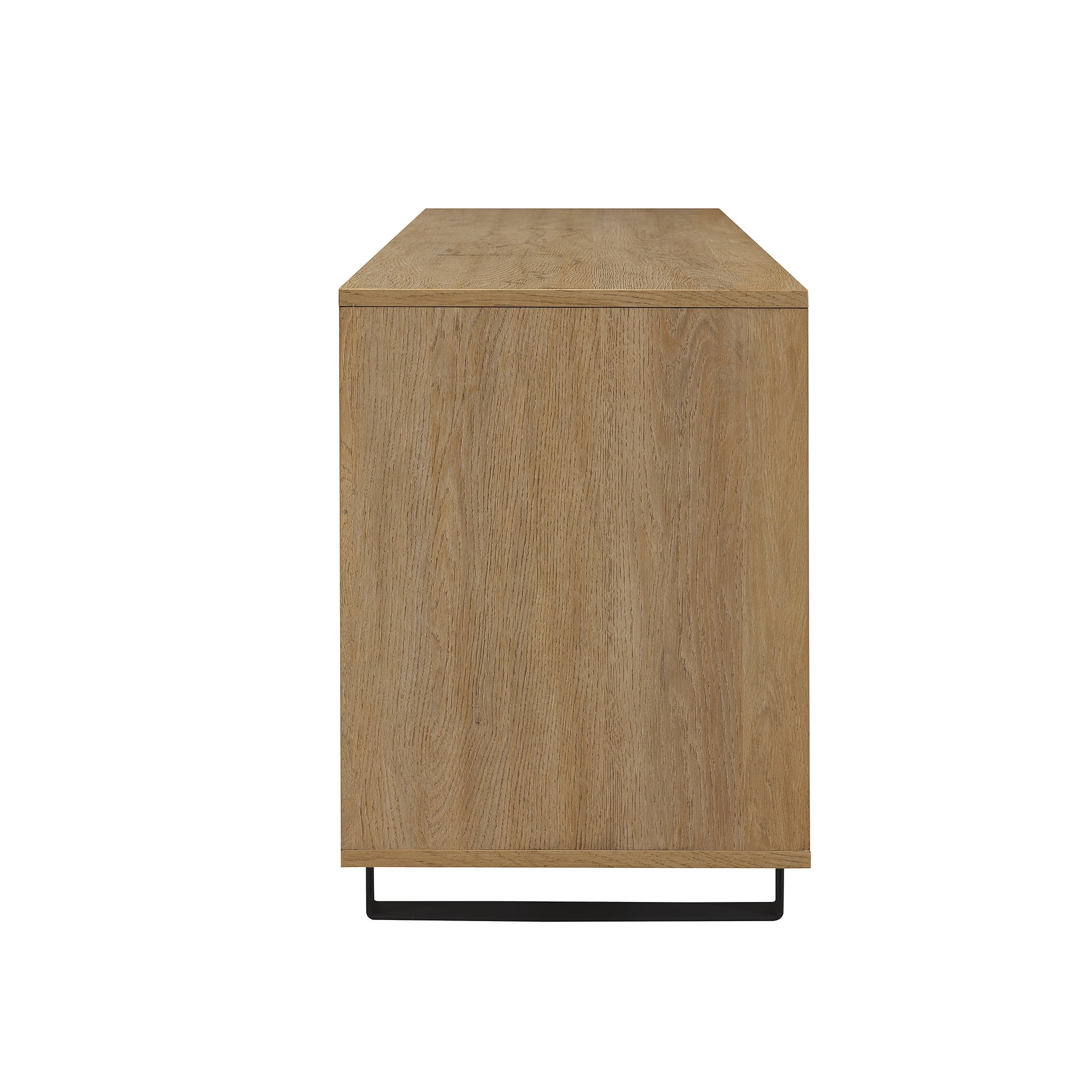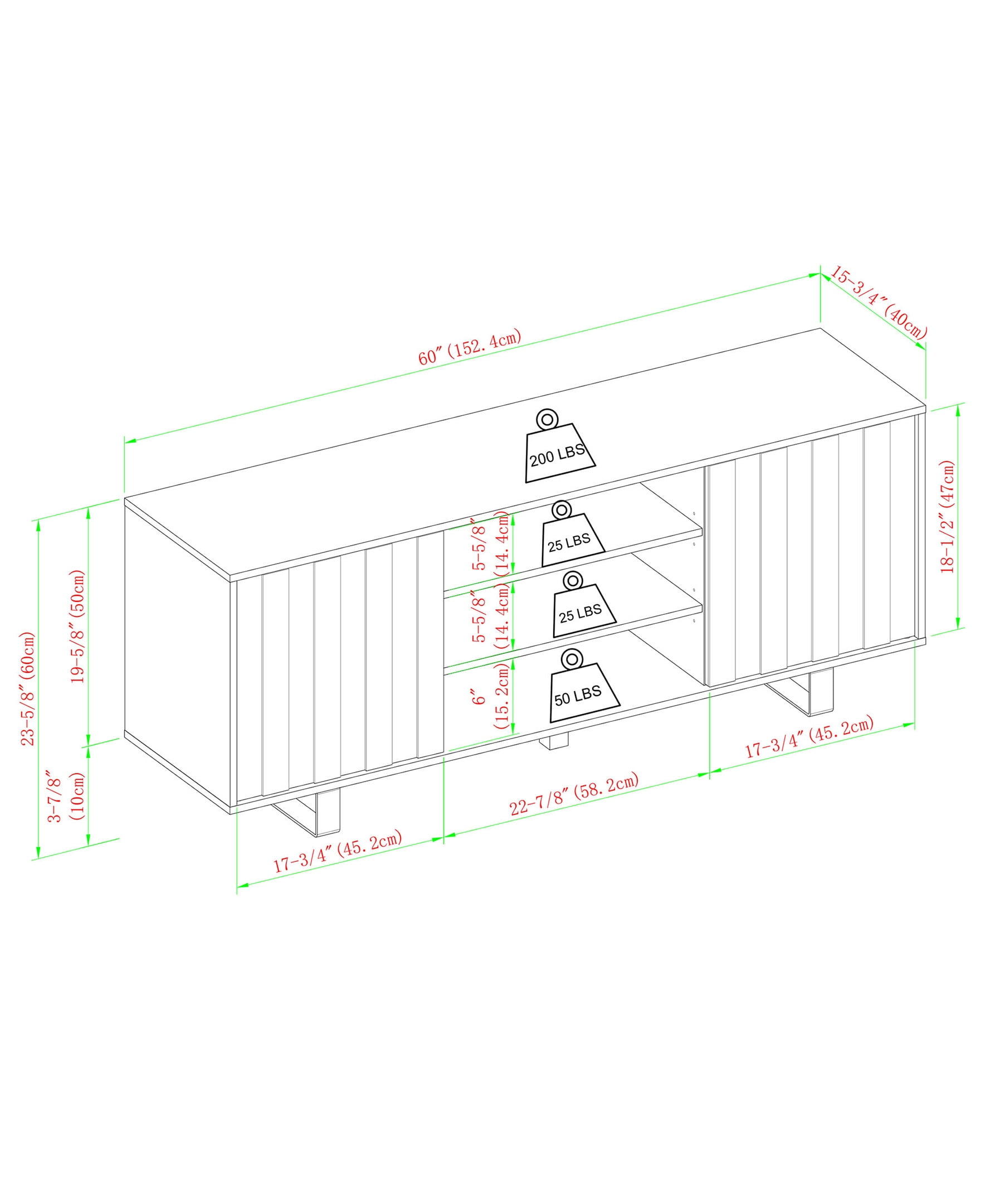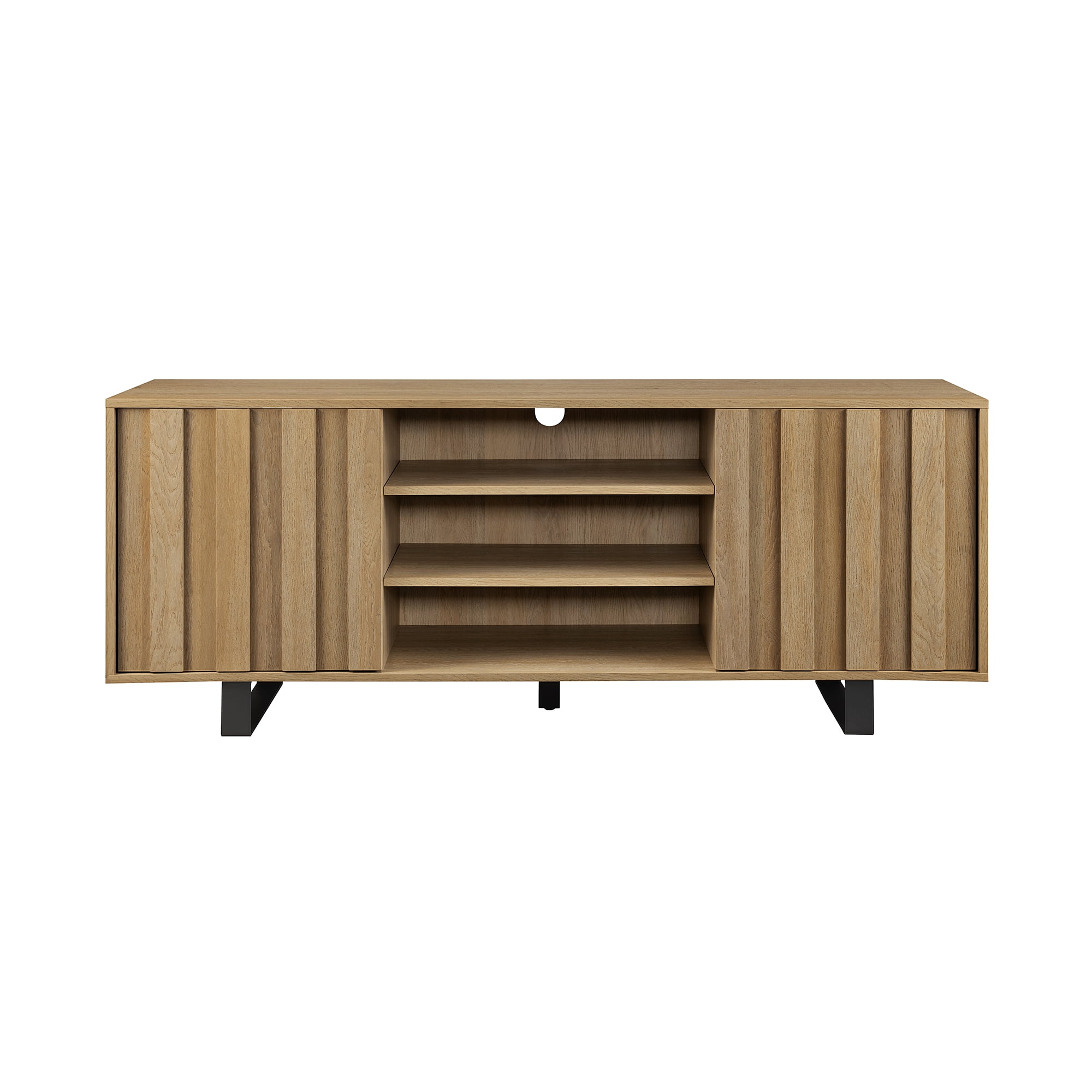 Contemporary style Coastal oak finish Featuring vertical paneling on the front for added interest Adjustable shelves for a customizable storage solution Cord management ports for tidy tech Sleigh-shaped metal legs Push-click doors Versatile design that fits in with contemporary, modern, and Japandi-styled homes Made from warp-resistant MDF wood, durable laminate, and powder coated steel Ships ready-to-assemble with step-by-step instructions Assembled dimensions: 24” H x 60” L x 16” W Packaged dimensions: 6″ H x 65″ L x 22″ W