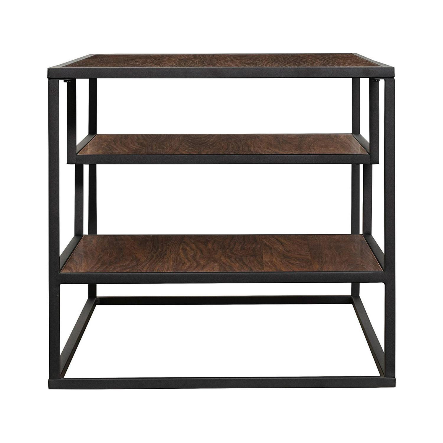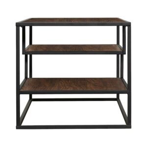 | Contemporary style| Dark walnut finish| Featuring three tiers for open storage| Mixed-material design for an eclectic look| Works well with modern, bohemian, and urban aesthetics| Perfect for organizing tech and home décor| Made from warp-resistant MDF wood, durable laminate, and powder-coated steel| Ships ready-to-assemble with step-by-step instructions| Assembled dimensions: 19 H x 40 L x 20 W| Packaged dimensions: 5 H x 43 L x 23 W