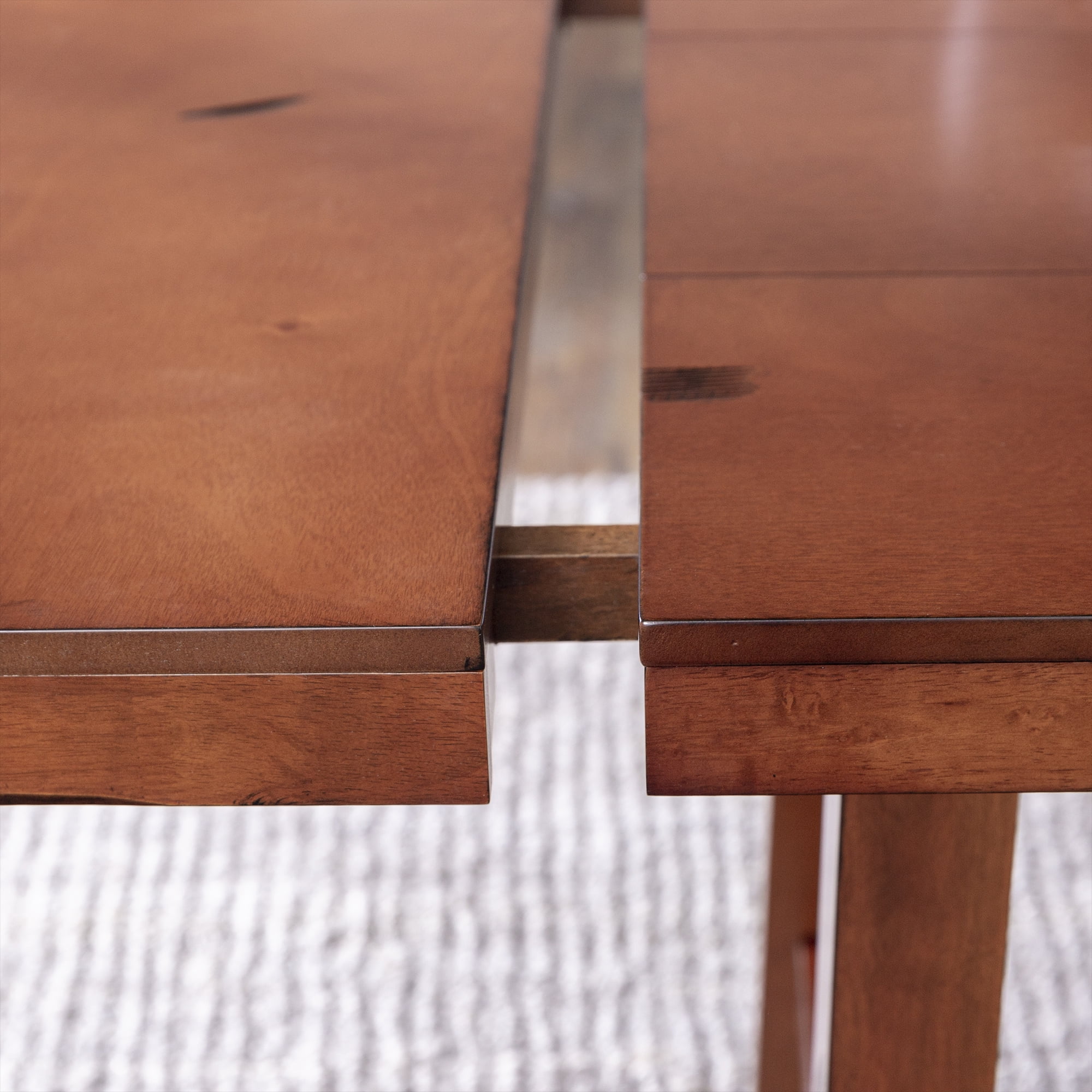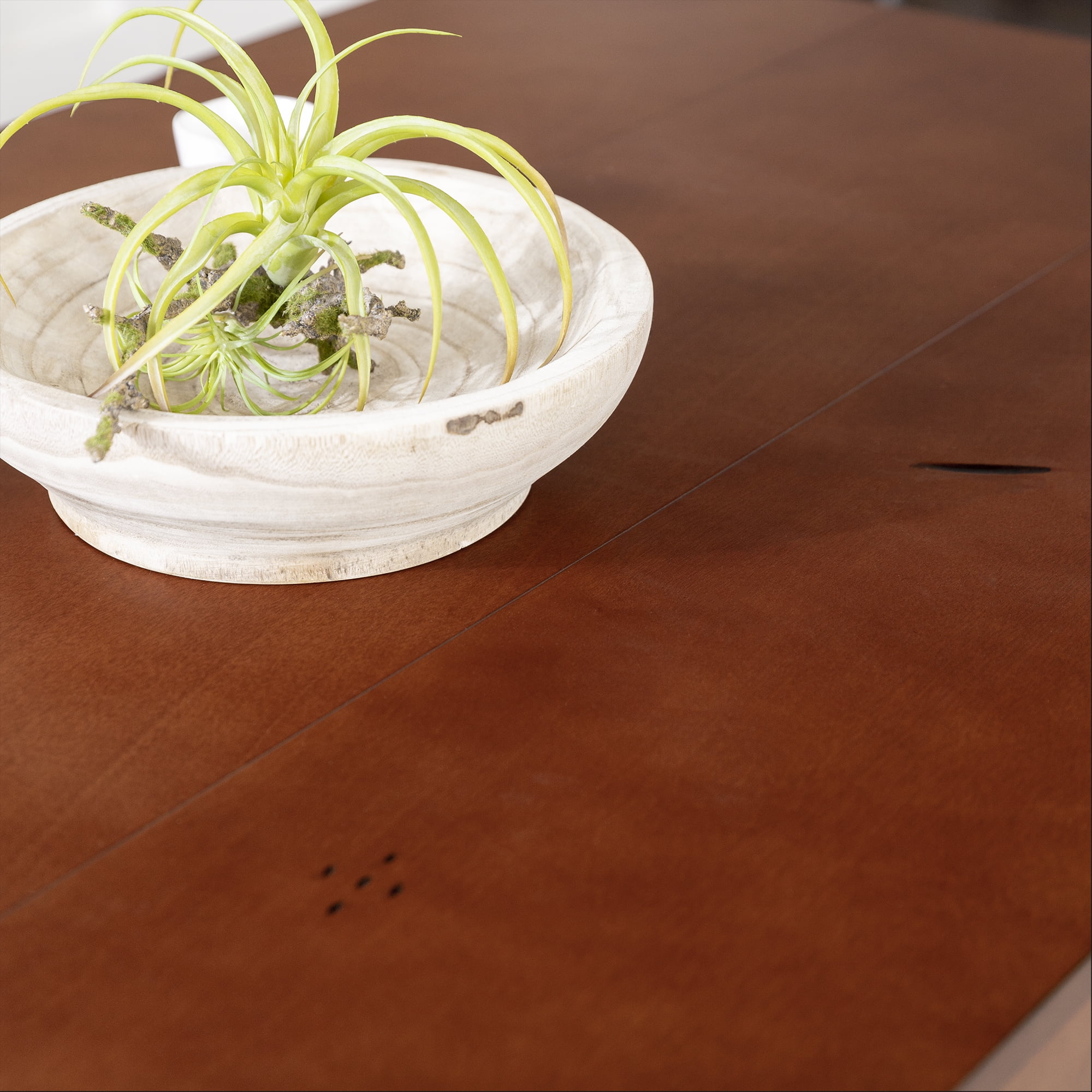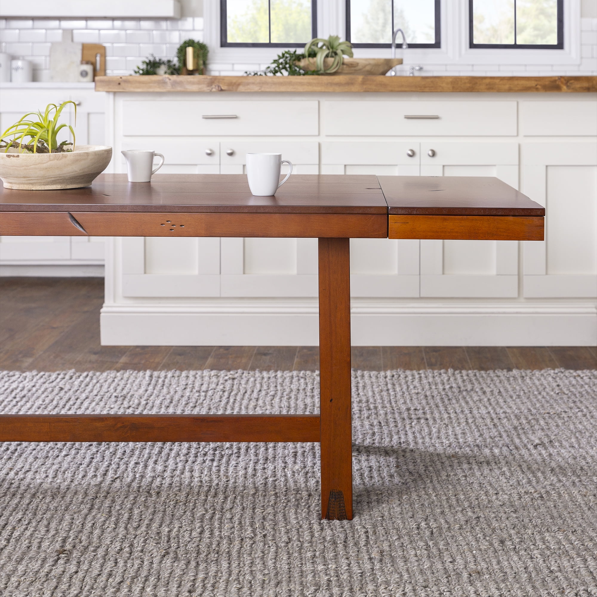 Gather family and friends in your home with this traditional dining table with 2 removable leaves. The trestle-style base will remind anyone of their childhood home cooked meals and fun family gatherings. Distressing on the tabletop and the wood finish create a rustic frame to enhance your farmhouse or country-inspired dining room. And with a solid wood build, this table will become a staple in your kitchen and help your own kids make great memories with your friends and family. Place your favorite chairs around the rectangle tabletop for the perfect hosting space.