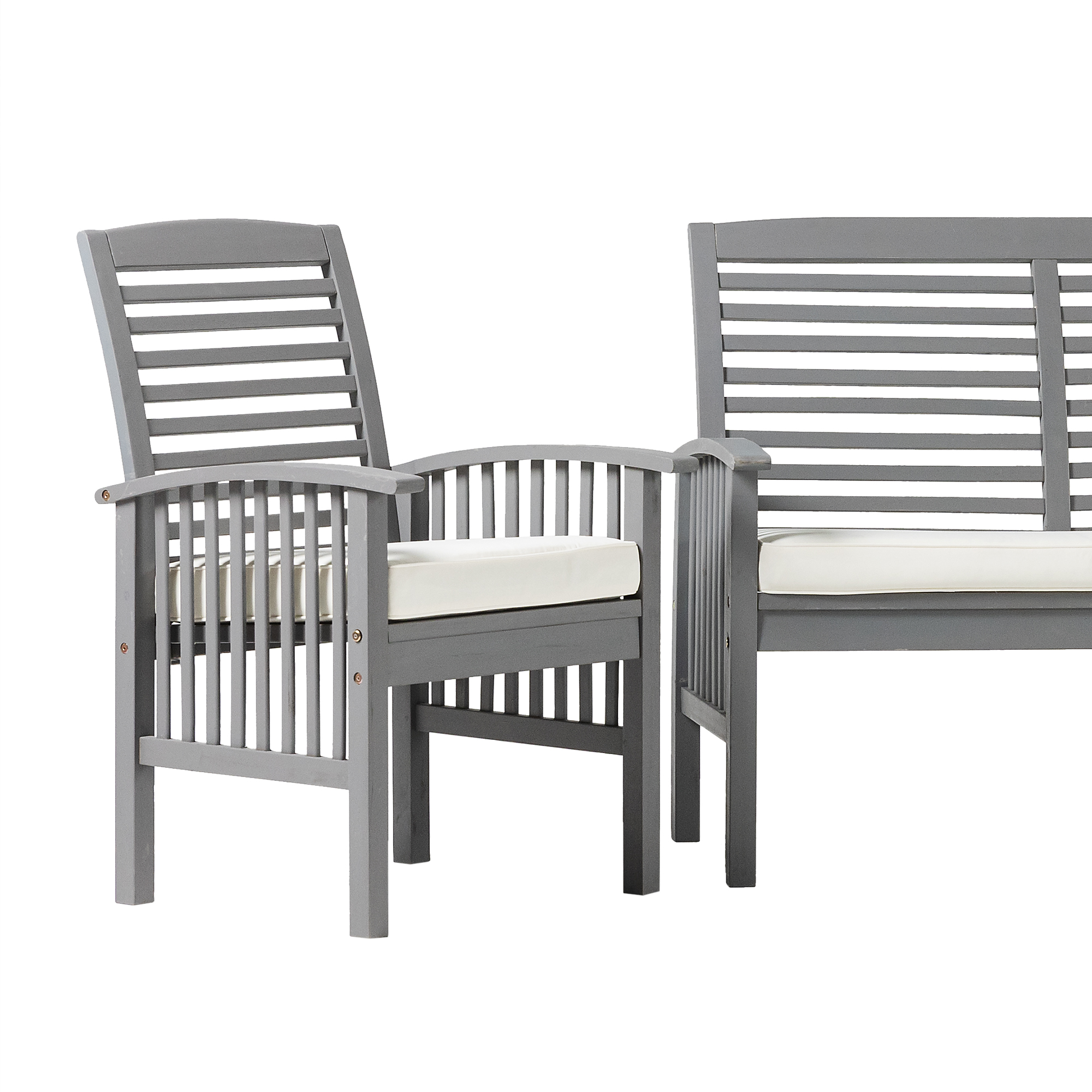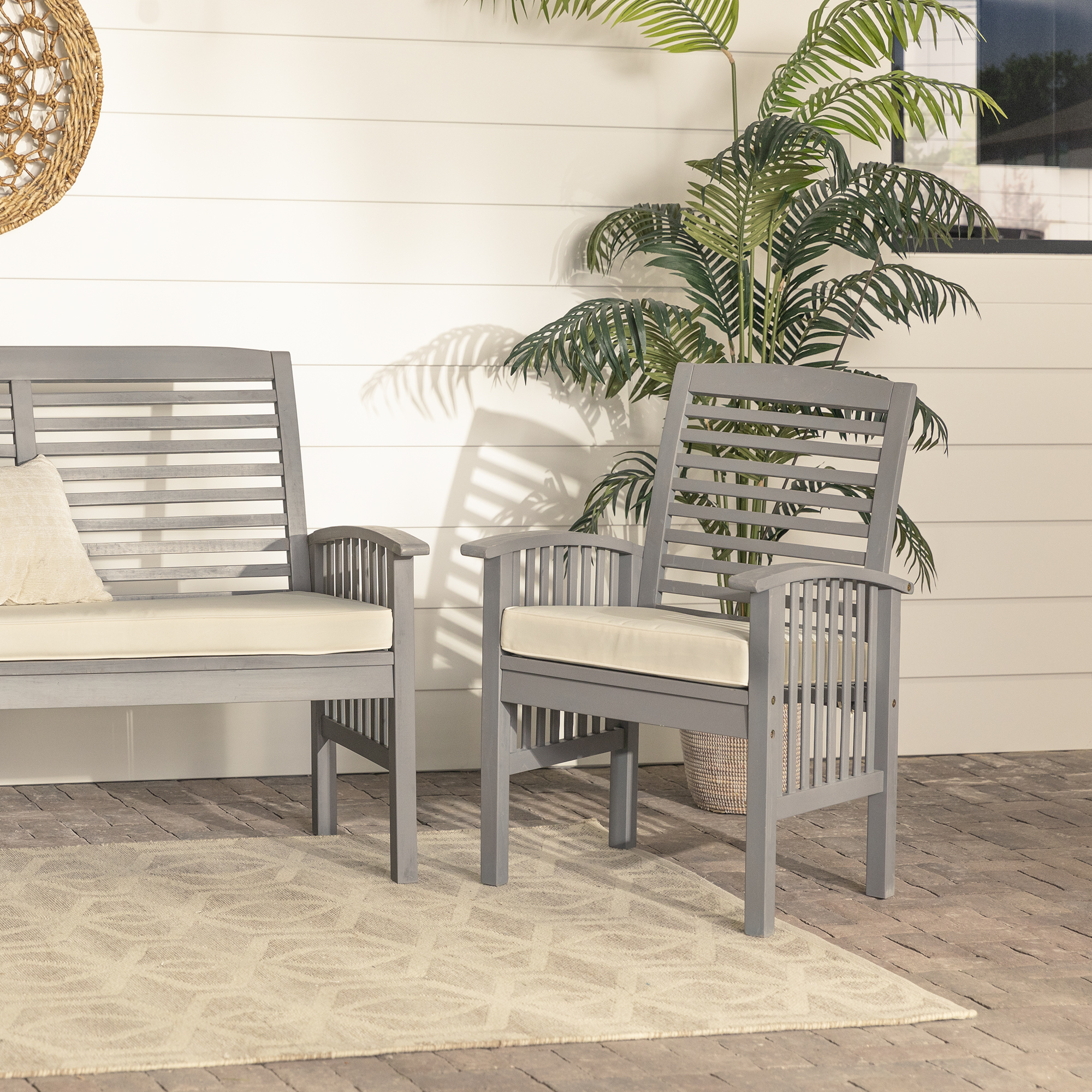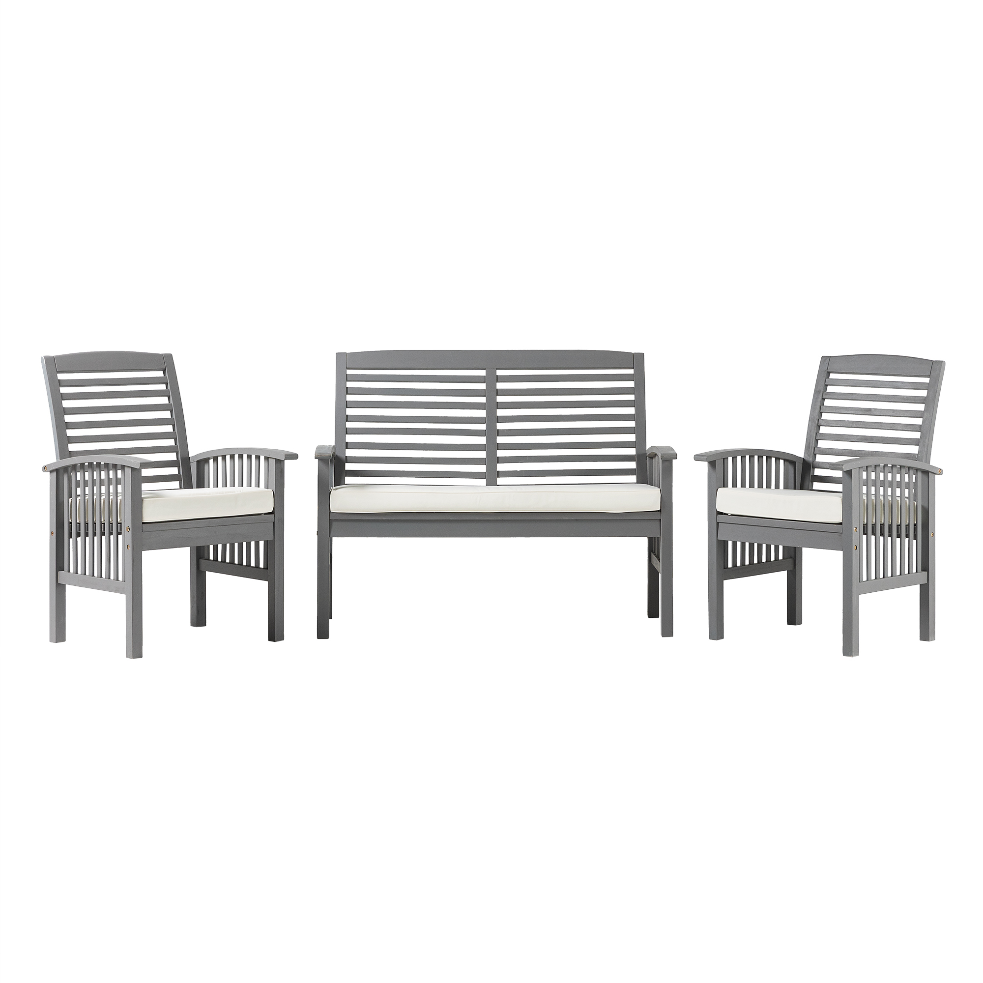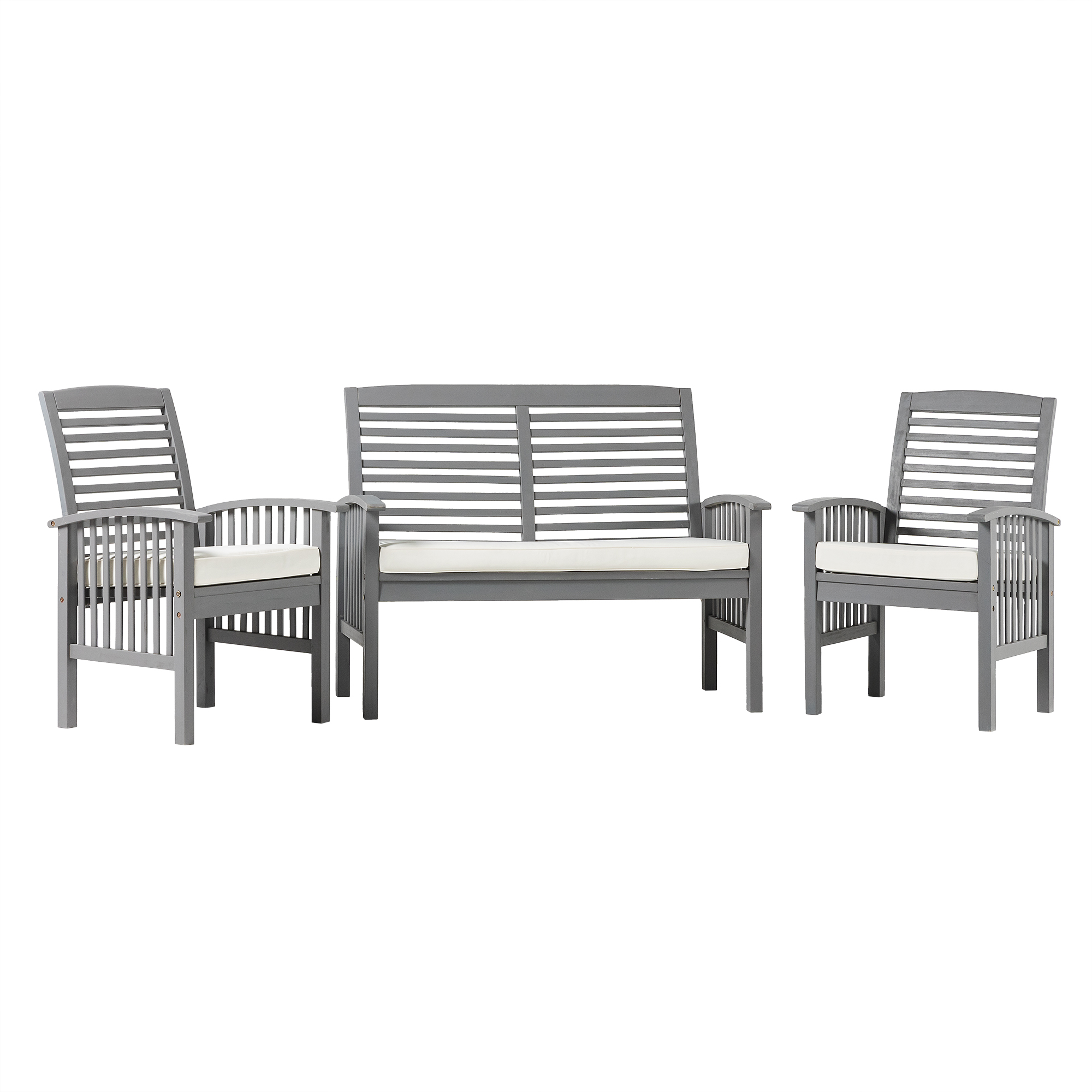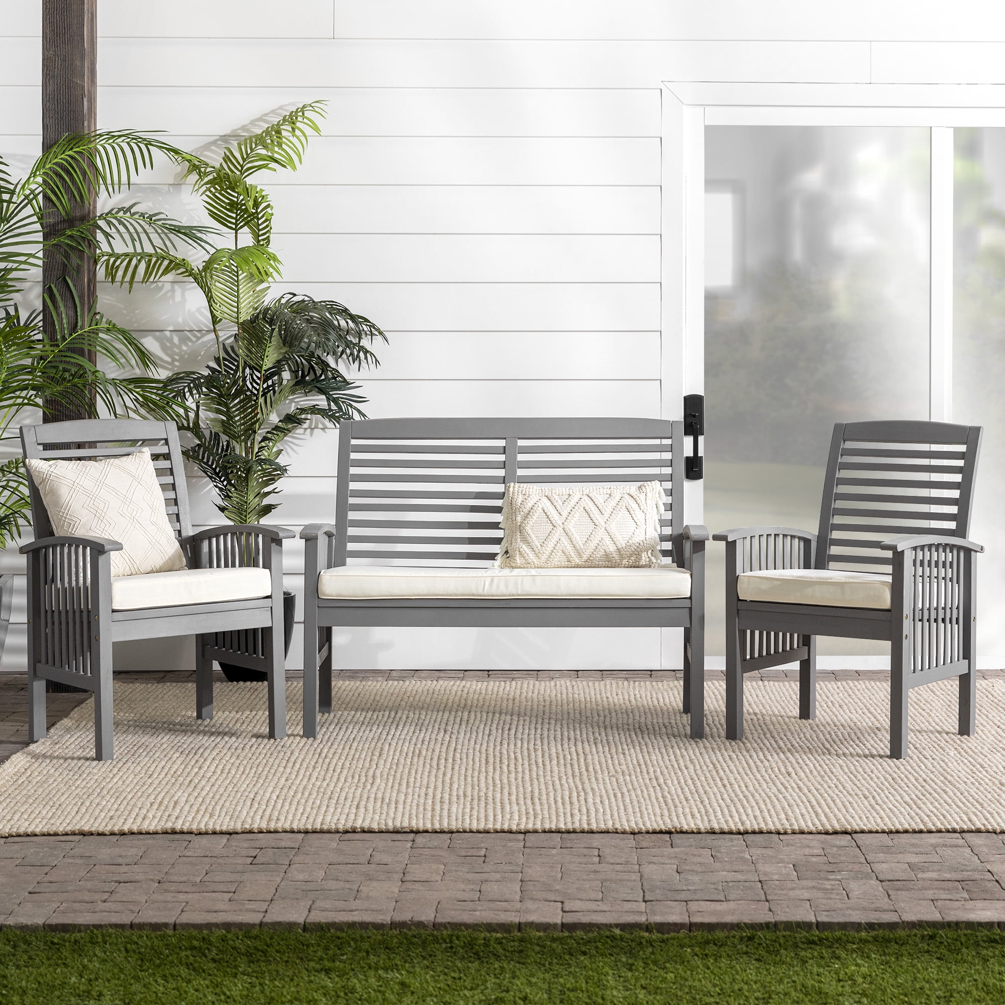 Gather the neighbors around the Daffodil Modern Outdoor Grey Wash 3 Piece Chair Set by Walker Edison for engaging conversation on a warm summer night. The plush cushions of the two chairs and loveseat present the perfect resting place after a long day of yard work or playing in the sun. Slatted backrests and arms provide a natural, boho ambiance for a truly relaxing backyard setup. And you don’t have to worry about finding a new set anytime soon because the weather-resistant solid acacia build will last for many years to come. Just make sure to add teak oil when needed and keep out of extreme temperature for the longest use.