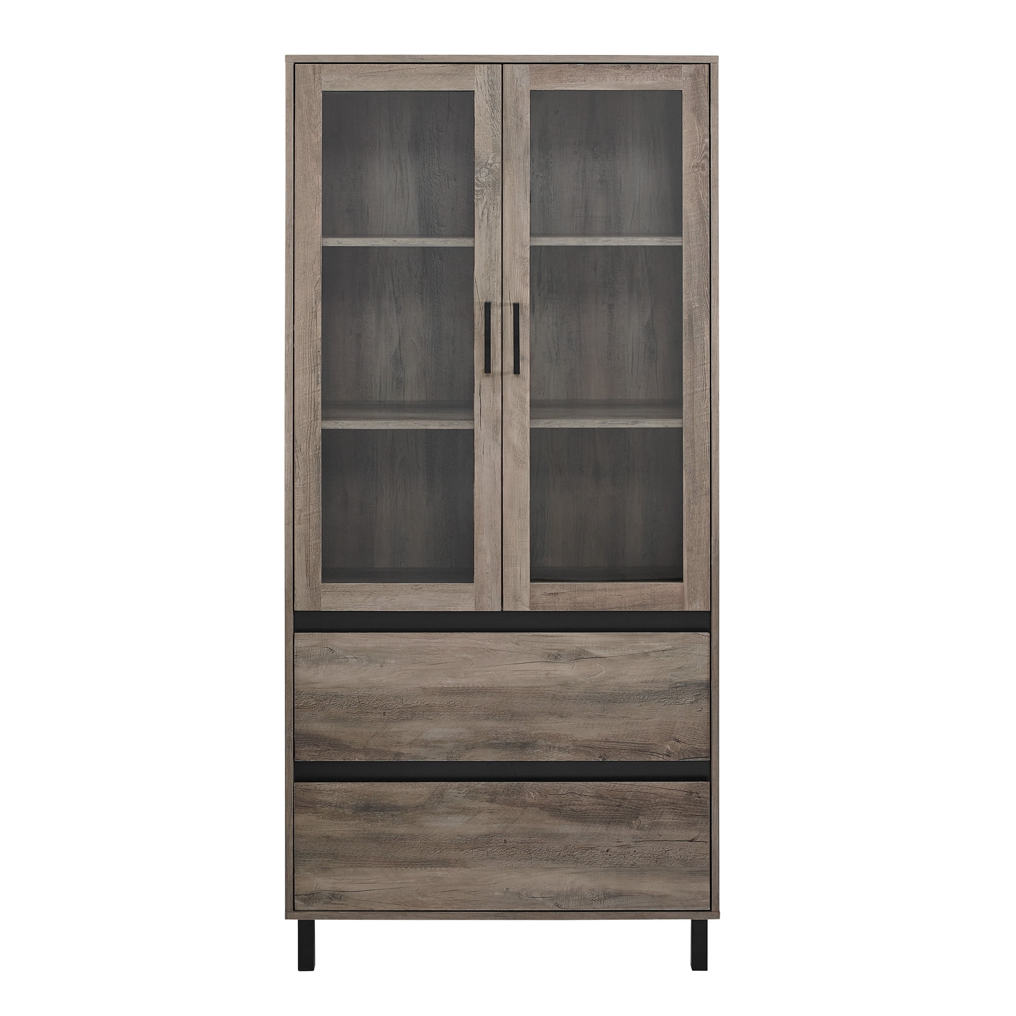 Create an organizer’s dream in your home with the Elaine 2 Drawer Glass door Hutch in Grey Wash by Walker Edison. This storage cabinet includes several options to display and hide away your items that haven’t found a home in your dining room, hallway, or living room. Use the two drawers on telescoping metal glides to tuck linens out of sight but within easy reach for when guests come to stay. The two doors include glass panes so you can show off your collection of old china, classic novels, or souvenirs from travels around the world. The two-tone design creates a modern cabinet that complements the decor style you love.