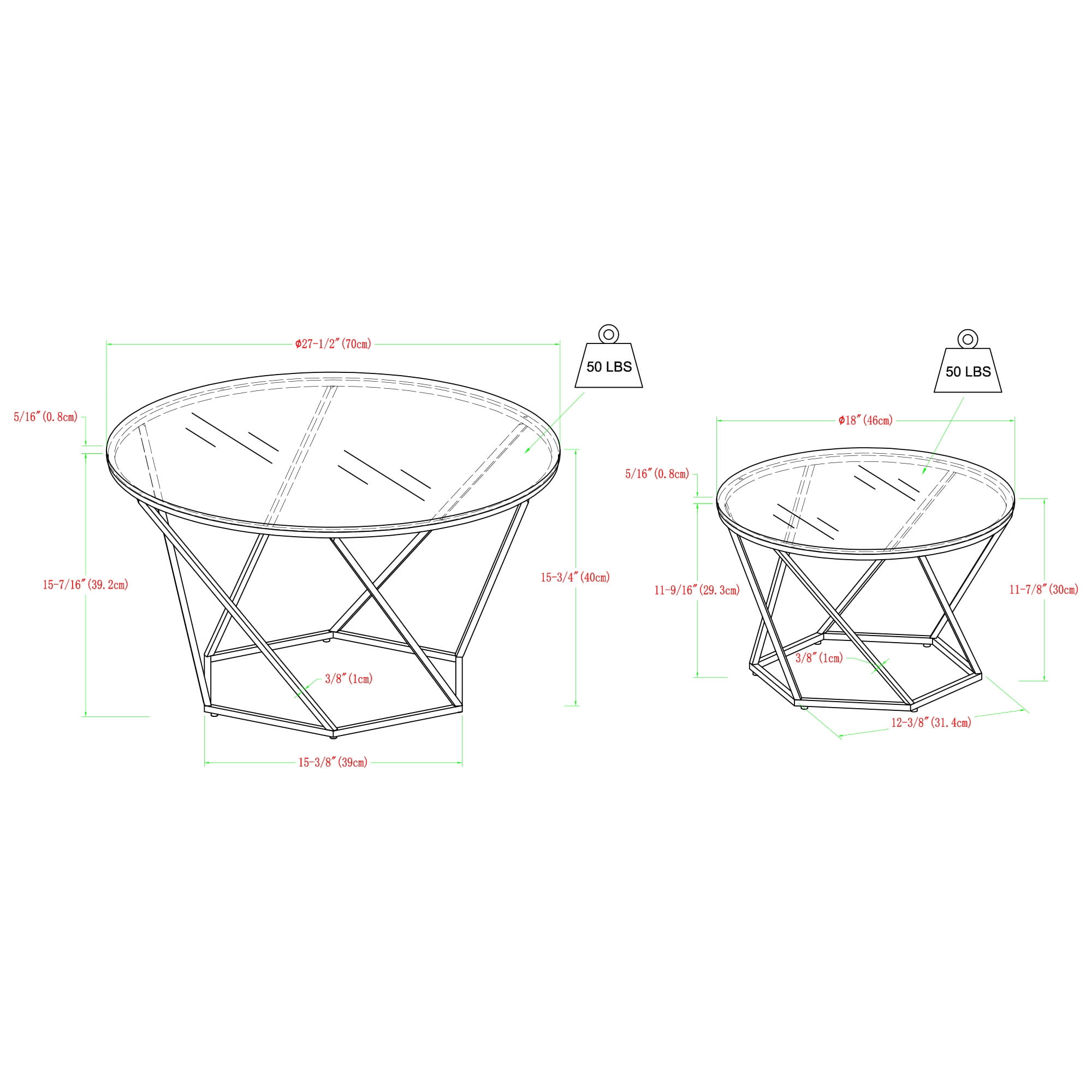 One large and one small table Glam style accent tables Geometric prism base Nesting style coffee table Circular table top Painted metal base Small space friendly Mixed material cocktail tables Assembled Dimensions: Large table: 16” H x 28” L x 28″ W Small table: 12” H x 18” L x 18″ W Packaged Dimensions: 19” H x 31” L x 30” W Assembly: Some assembly required Materials: High-grade MDF, premium laminate, powder-coated metal, tempered glass Ships in 1 box