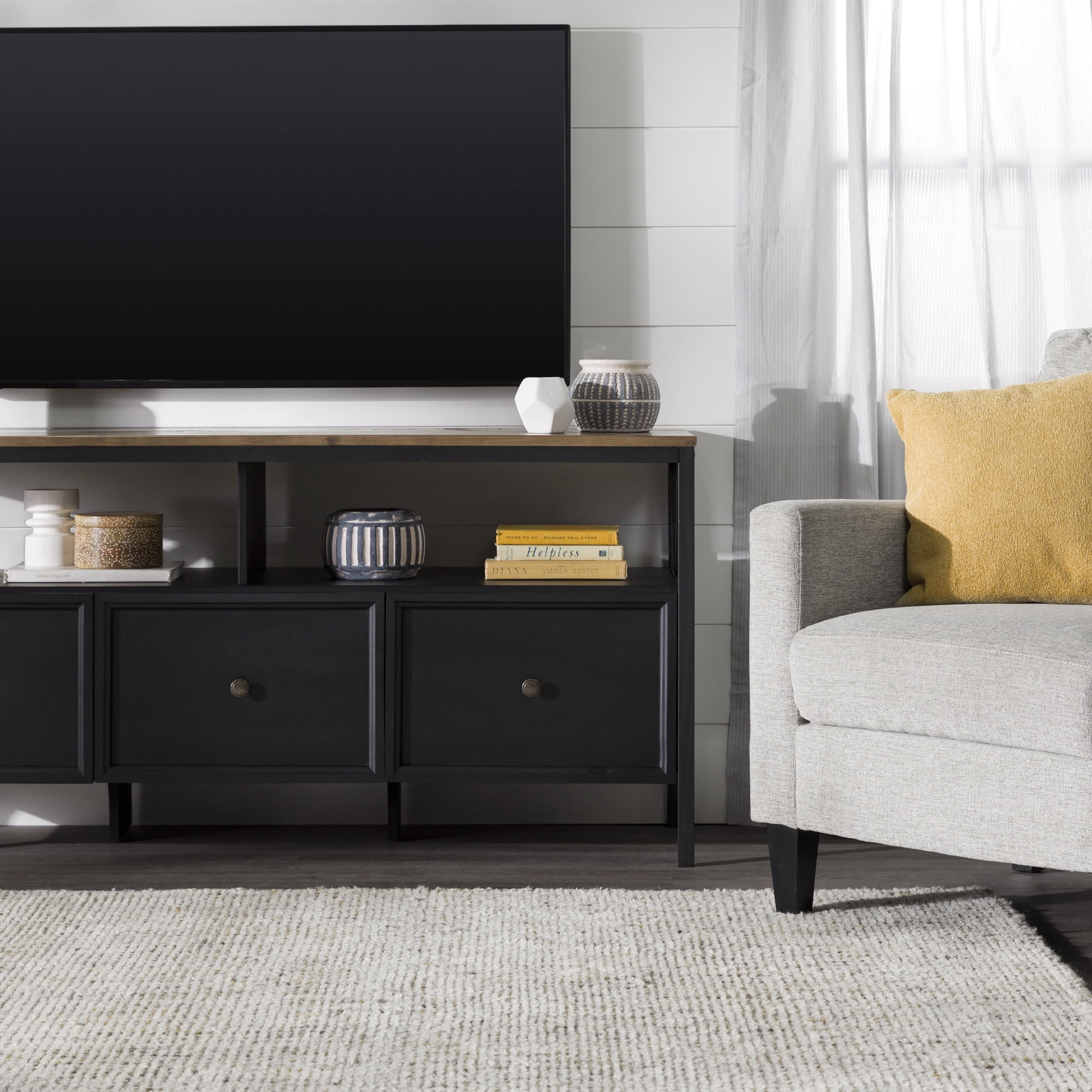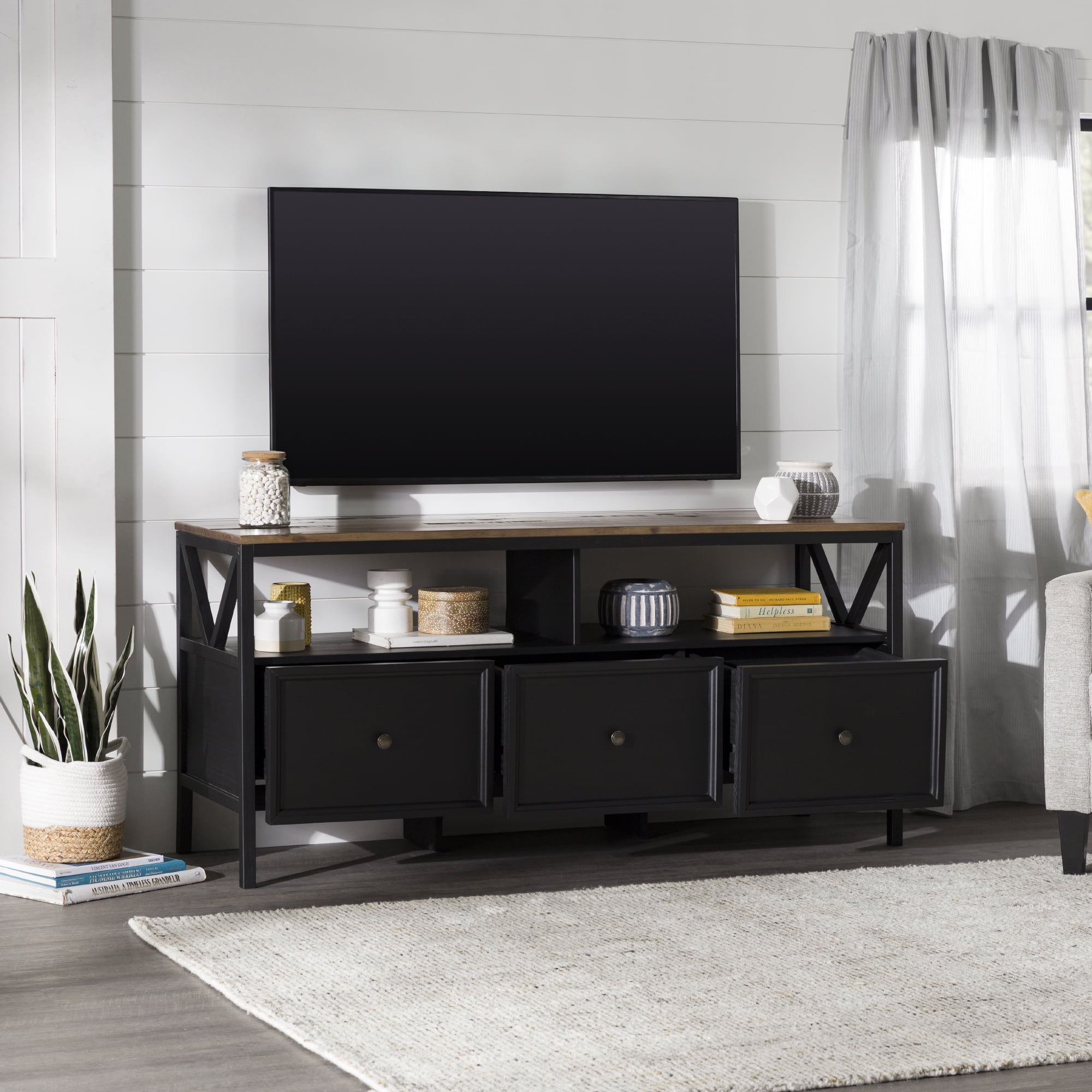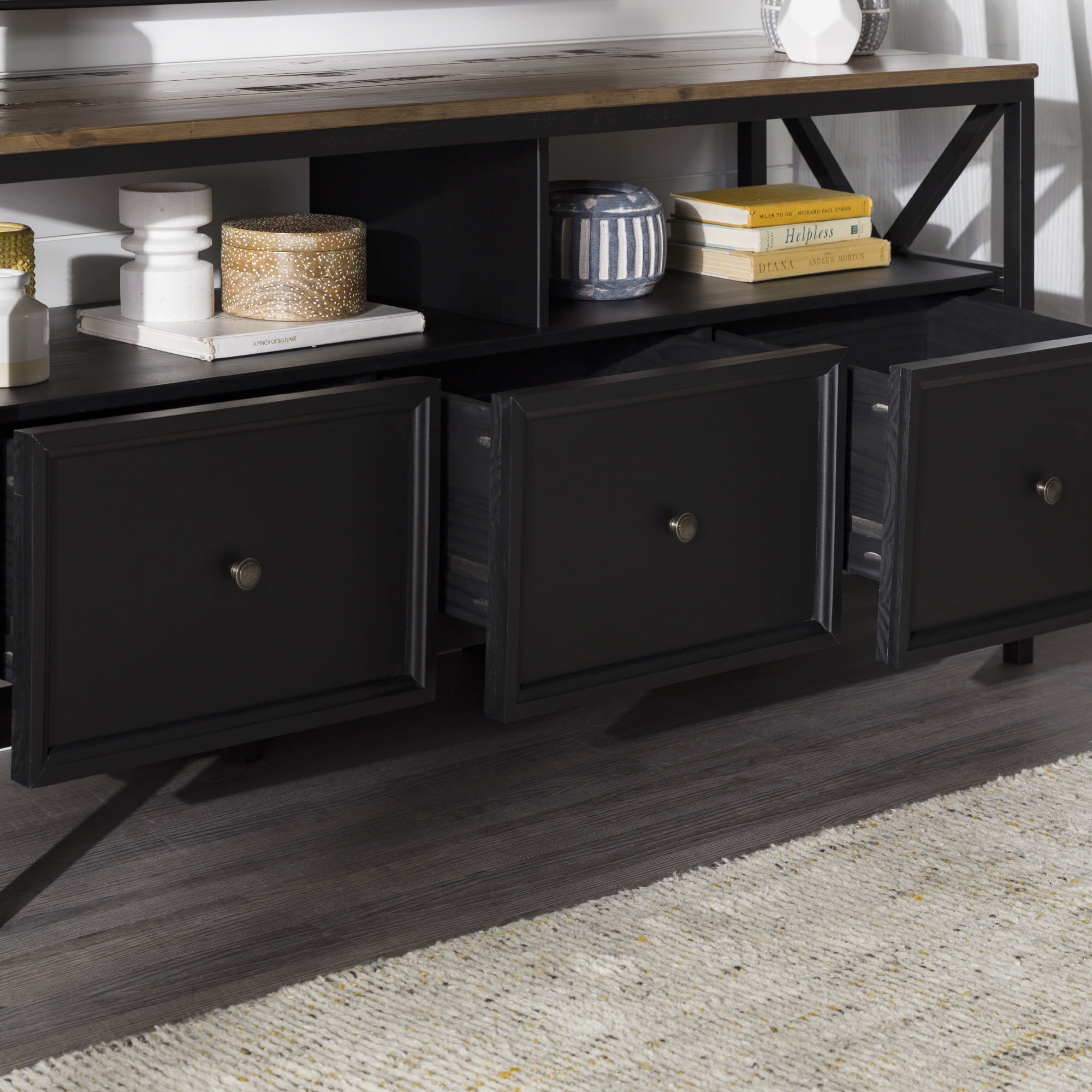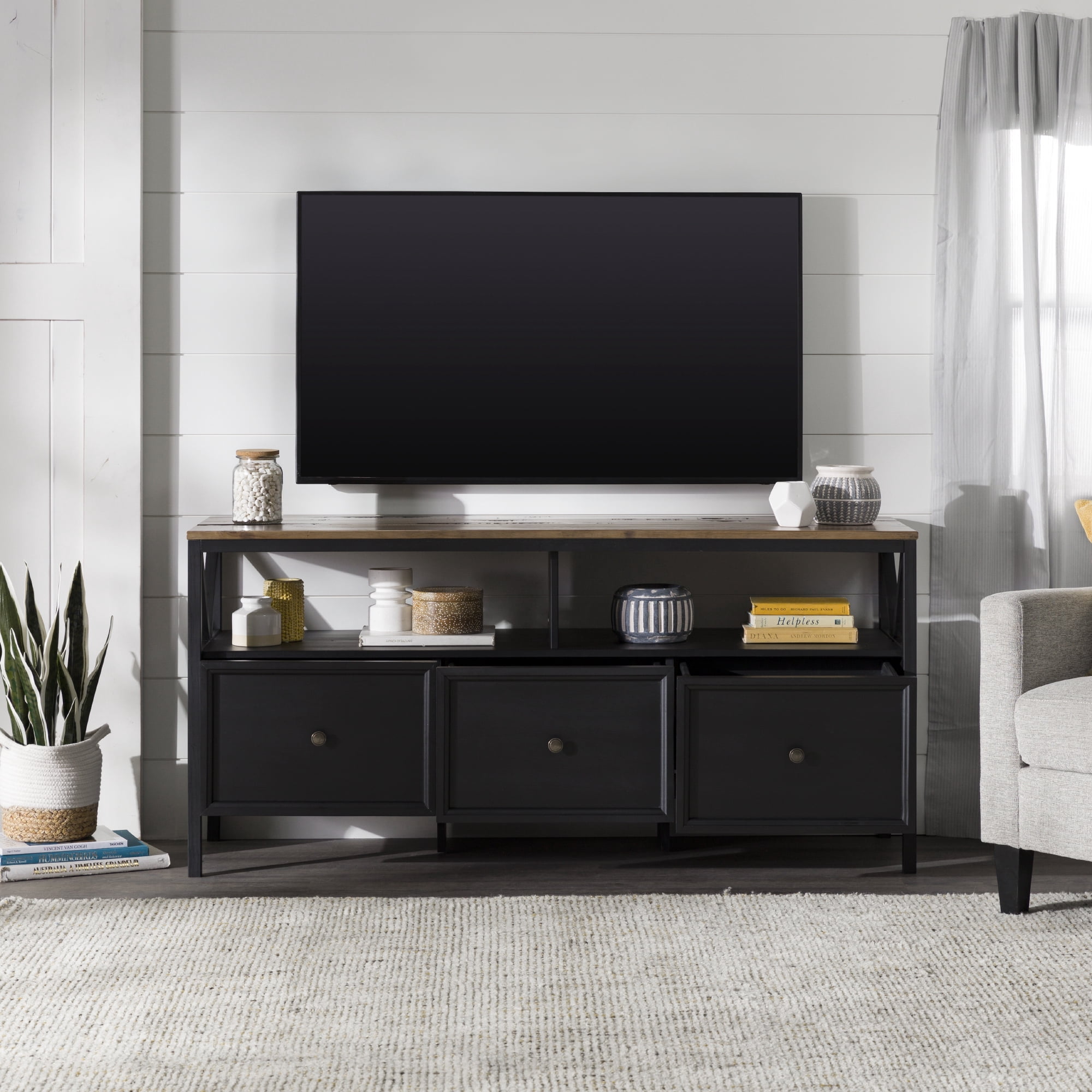 Implement a sense of family in your home with signs of “Gather” and “Live, Laugh, Love” displayed on this farmhouse TV stand by Walker Edison. The attractive side V accents add an extra rustic touch to the two-tone design. Place your TV up to 65 inches on the top and host the family for watch parties. They will love the three, easy-open, large drawers which hold games, blankets, and movies. The open display space provides the perfect spot for a sound bar, so everyone can enjoy the gatherings in your living room.