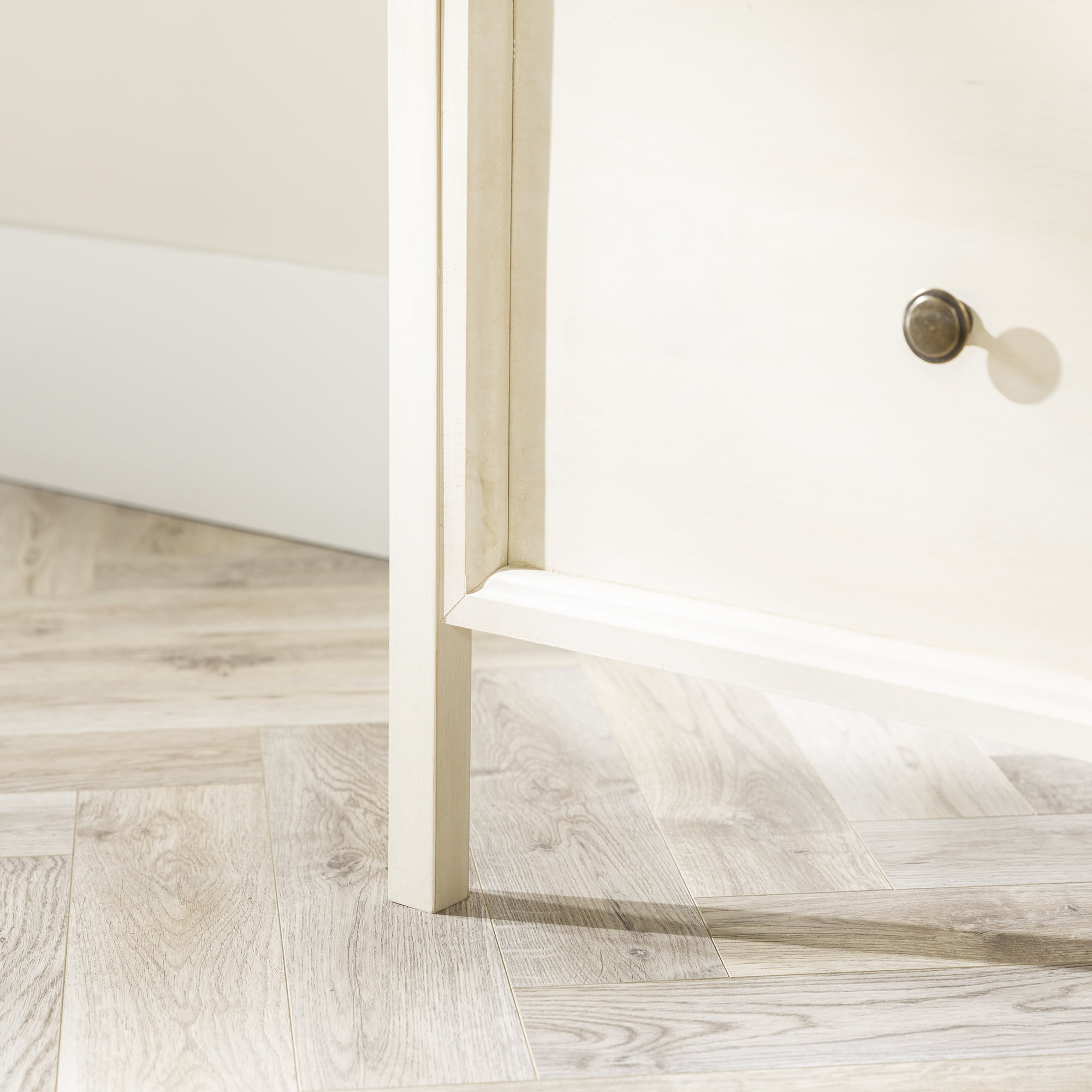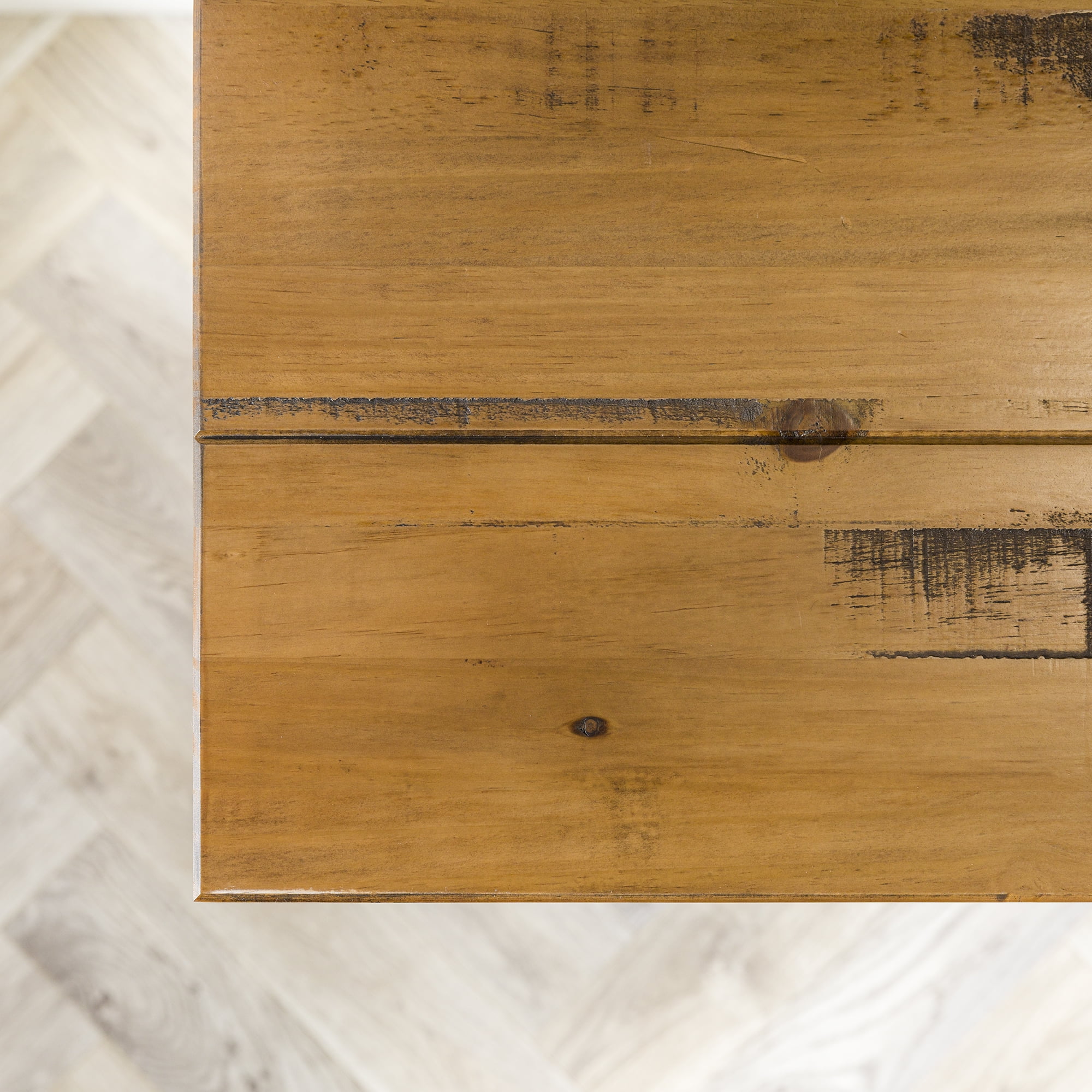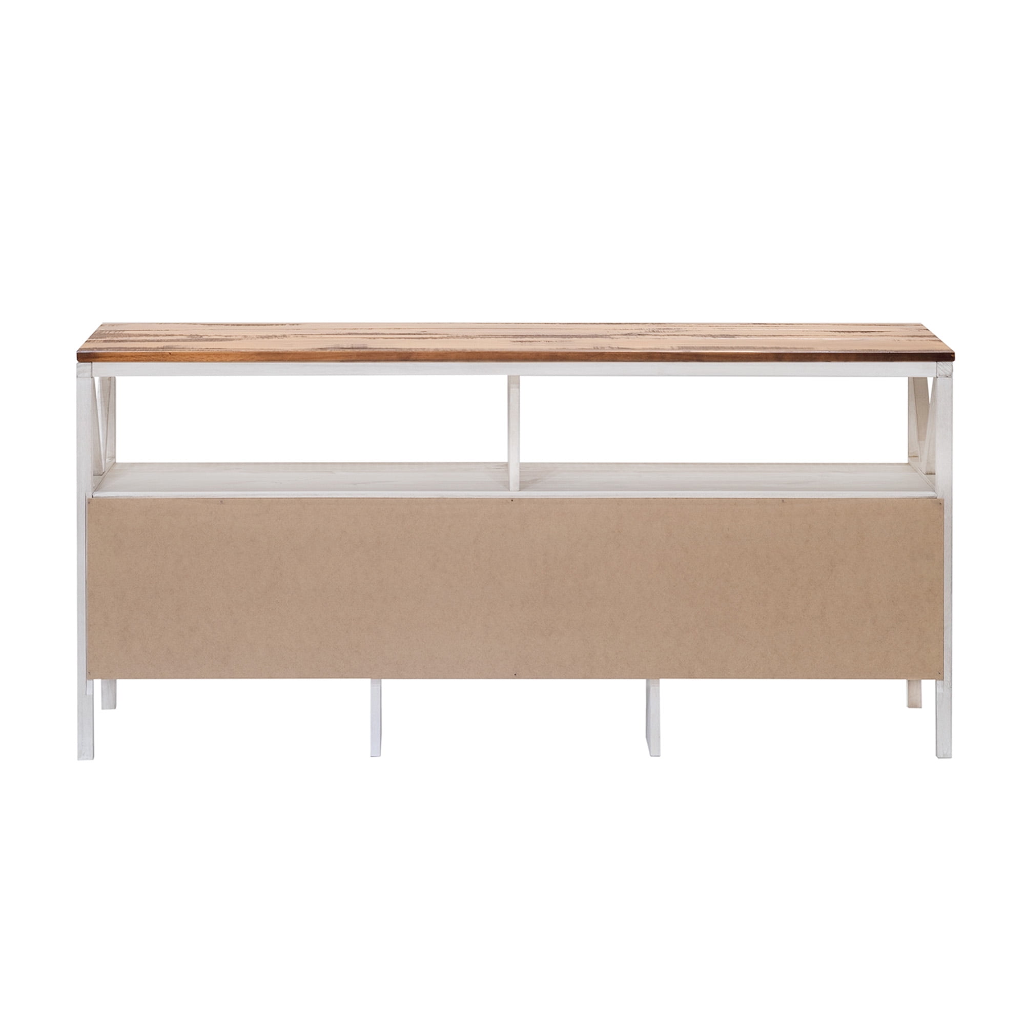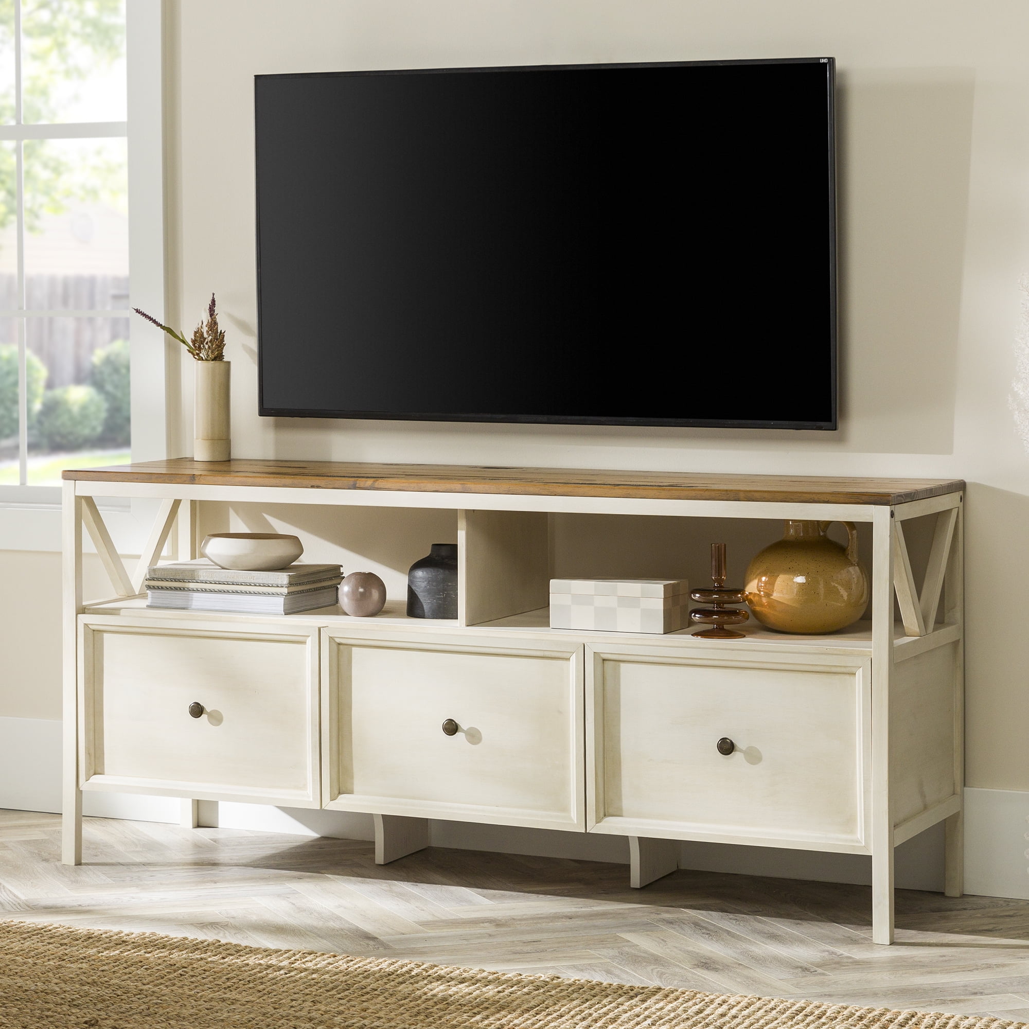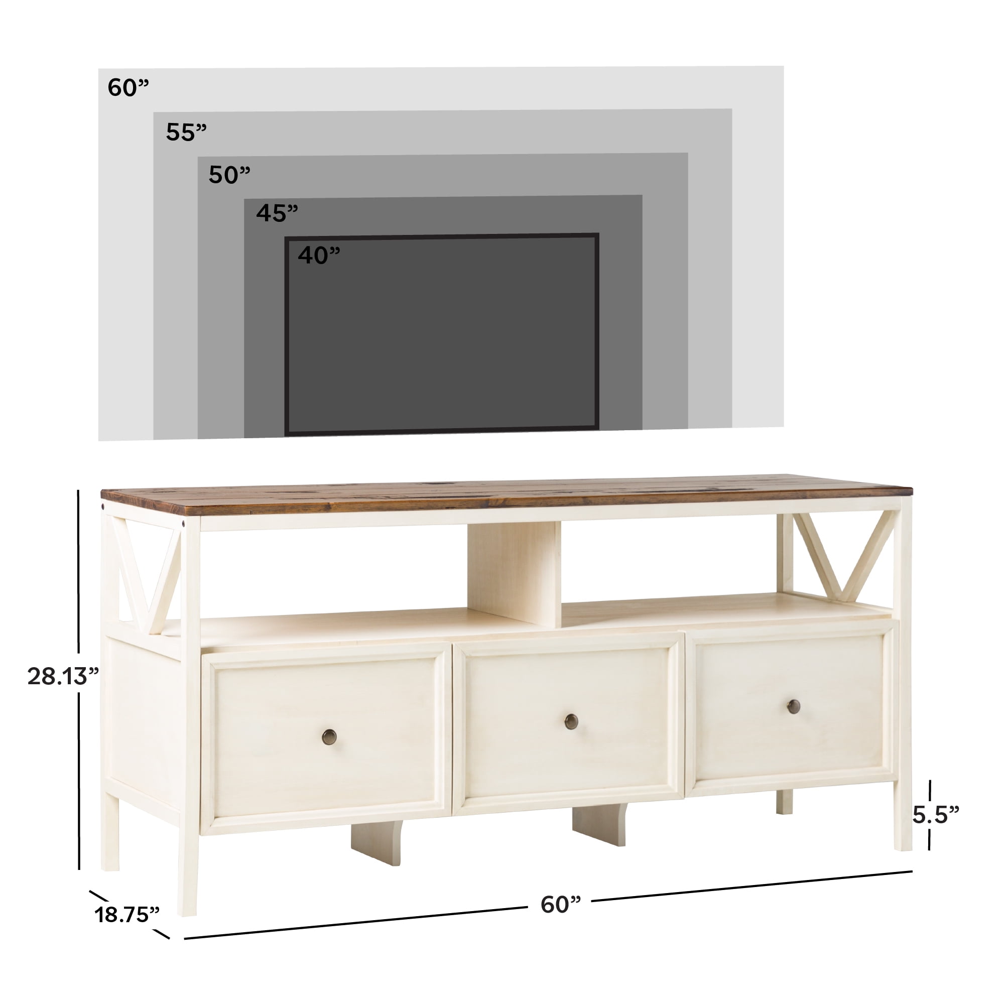 Farmhouse TV stand 3 large drawers on smooth wood runners 2 open storage cubbies compatible with a sound bar Attractive side V accents Solid pine wood frame Ships ready-to-assemble with step-by-step instructions Sleek steel hardware Two-tone design Assembled Dimensions: 28.13″ H x 60″ L x 18.75″ W 72LBS