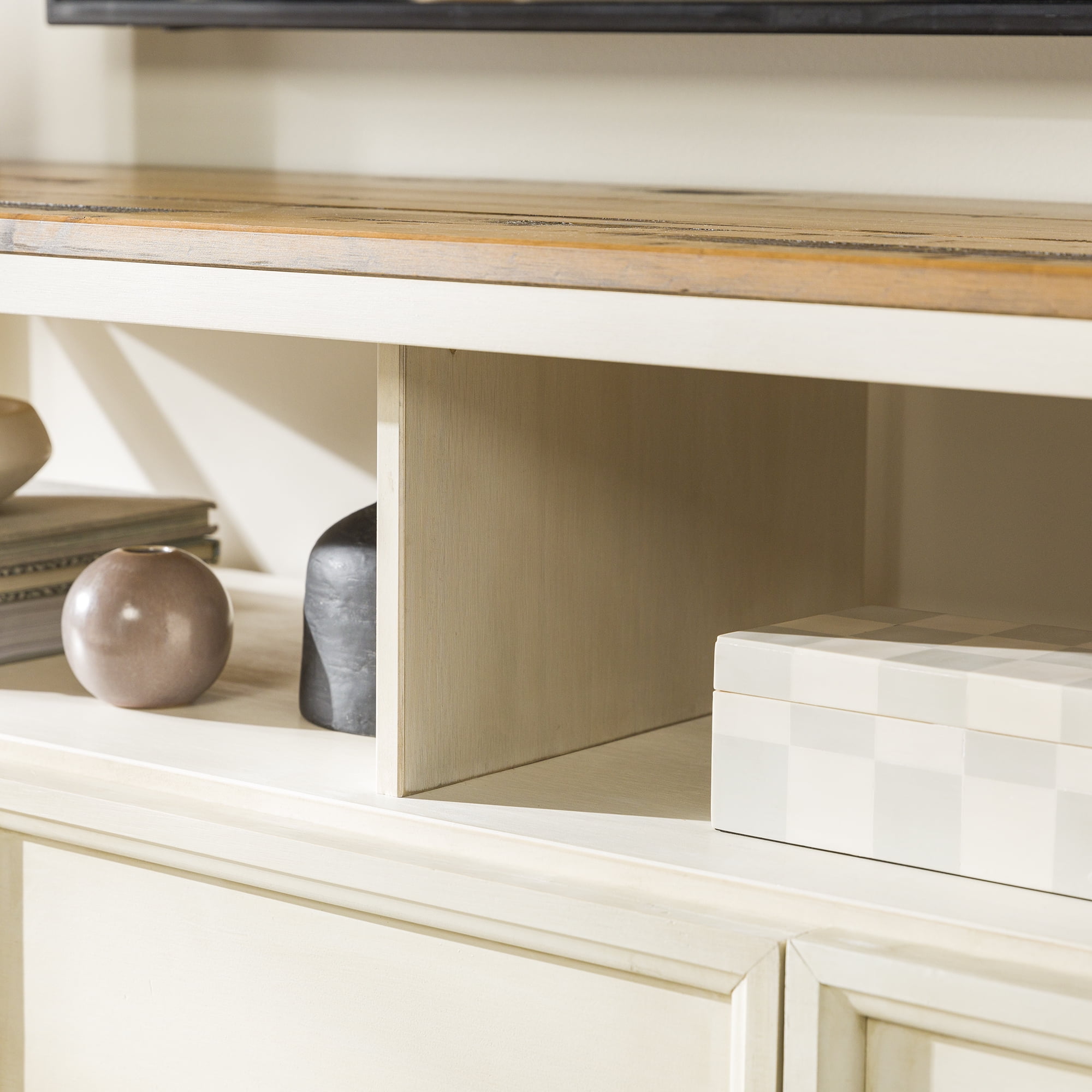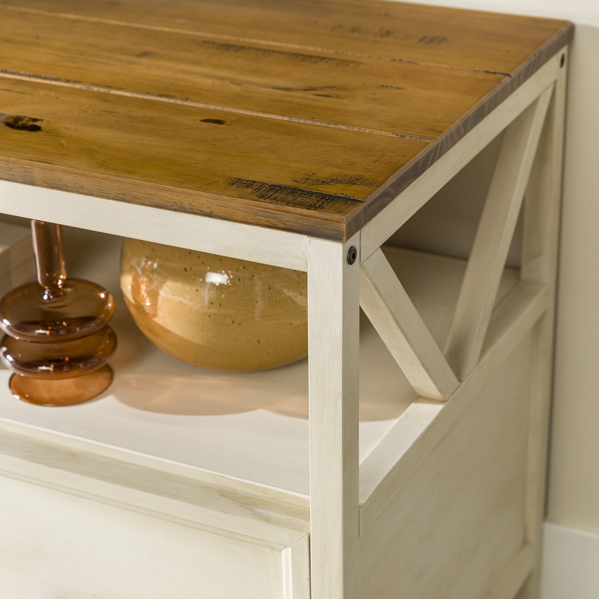 Implement a sense of family in your home with signs of “Gather” and “Live, Laugh, Love” displayed on this farmhouse TV stand by Walker Edison. The attractive side V accents add an extra rustic touch to the two-tone design. Place your TV up to 65 inches on the top and host the family for watch parties. They will love the three, easy-open, large drawers which hold games, blankets, and movies. The open display space provides the perfect spot for a sound bar, so everyone can enjoy the gatherings in your living room.