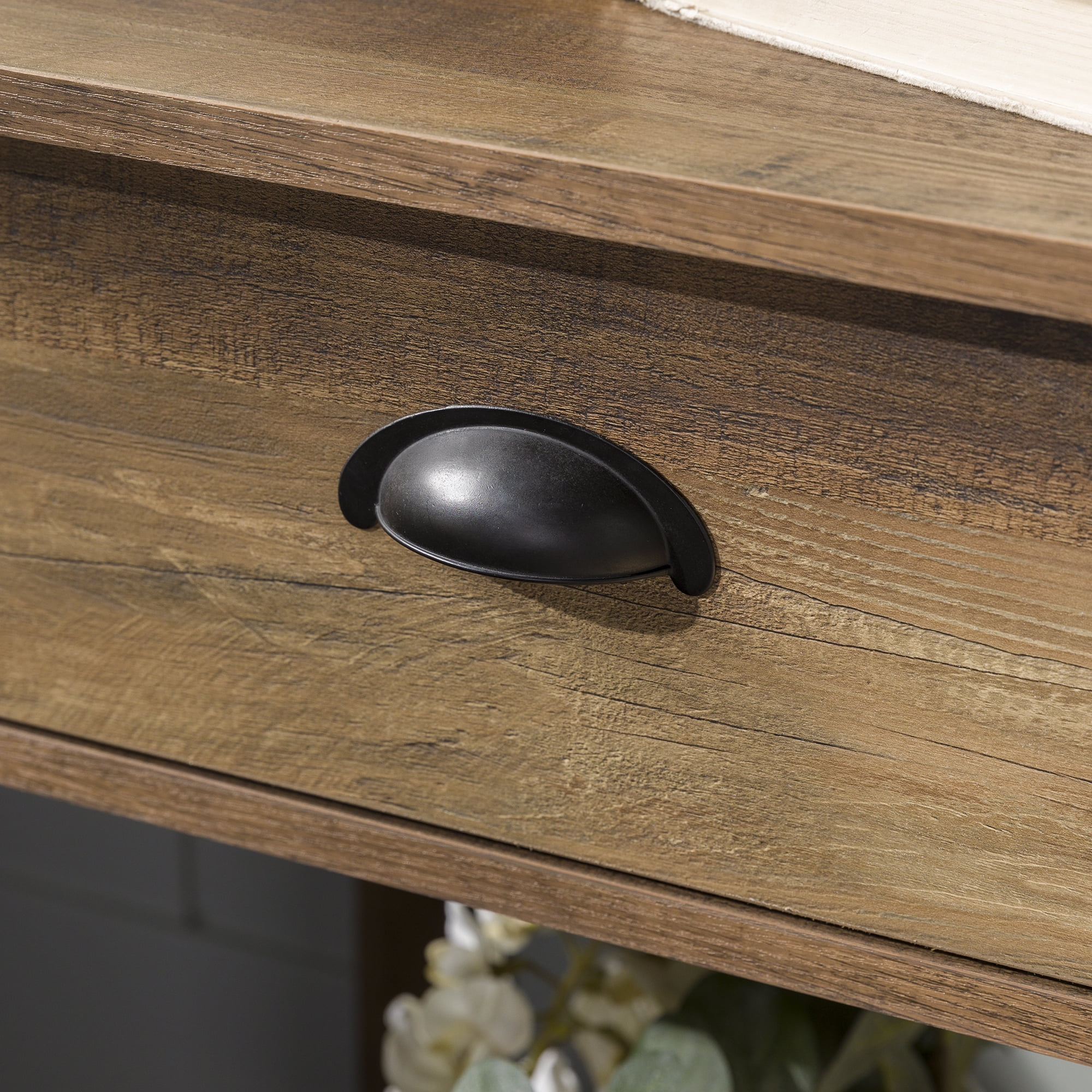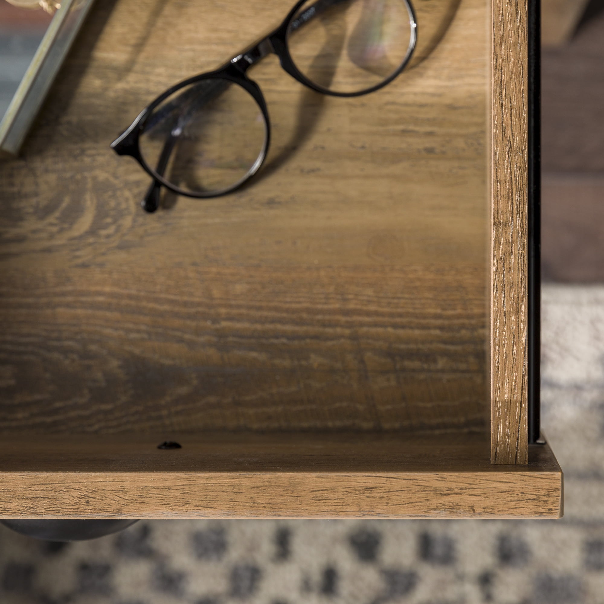 1 drawer farmhouse style end table Painted metal half circle handle Open and closed storage Lower slat style shelf Telescoping metal drawer glides Ships ready-to-assemble with step-by-step instructions