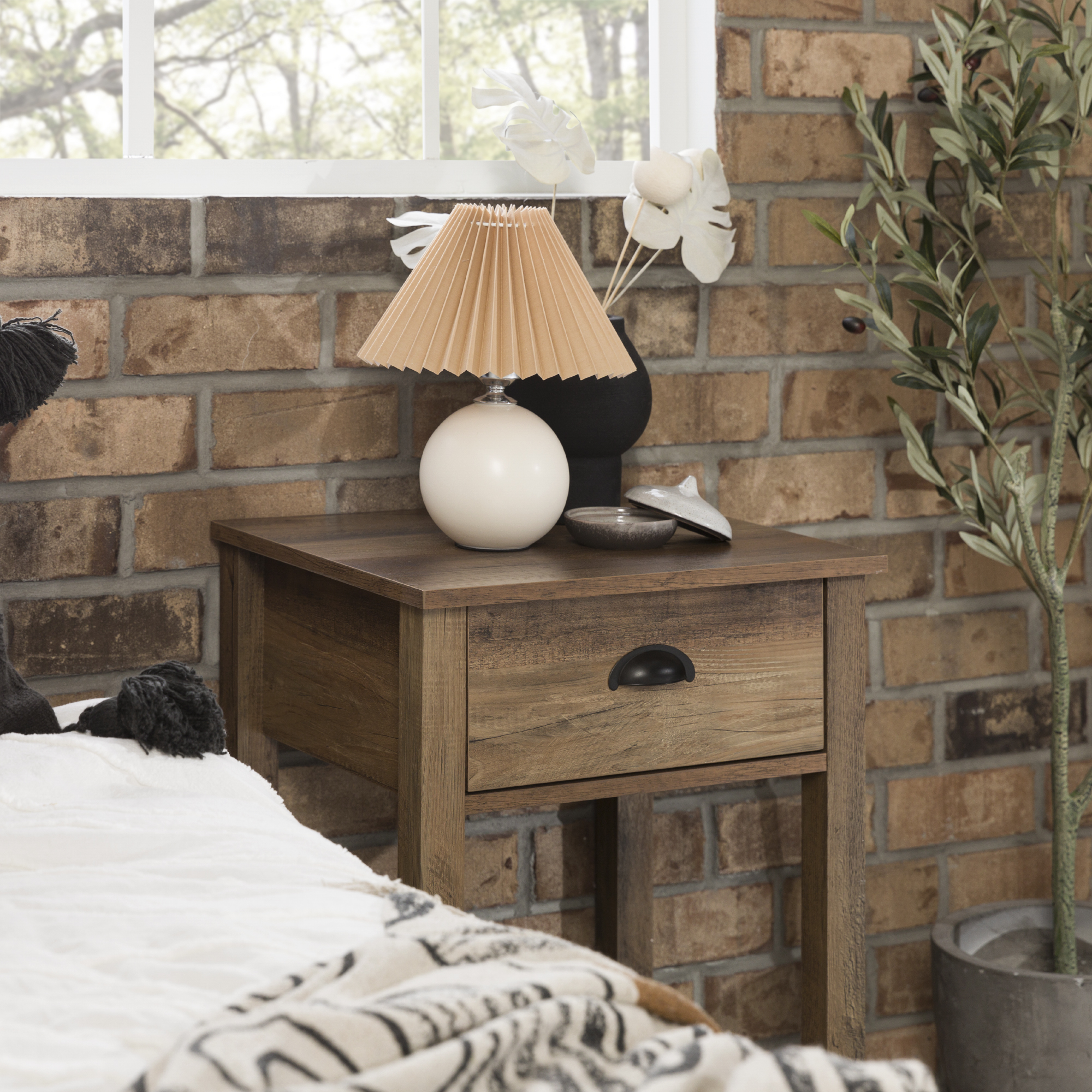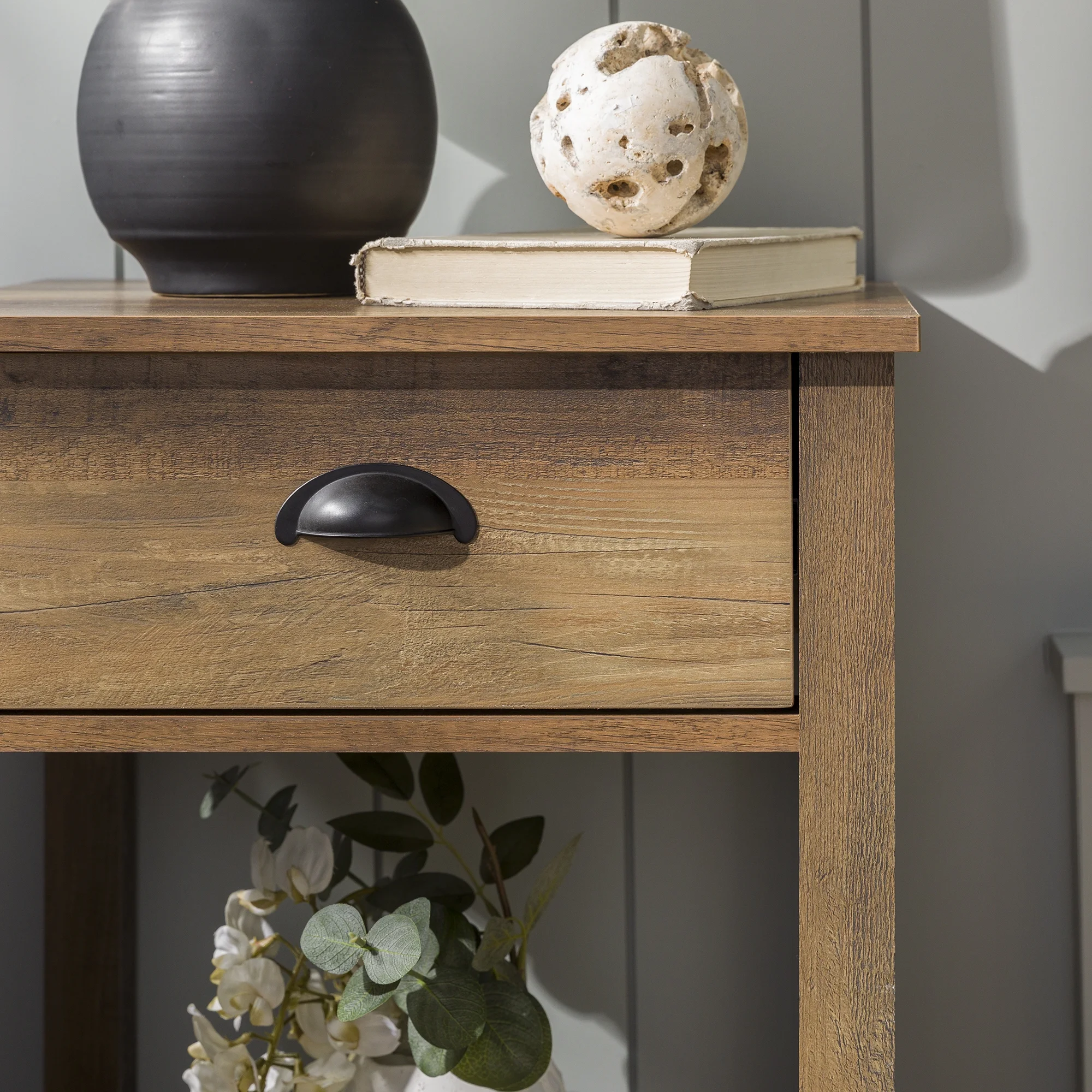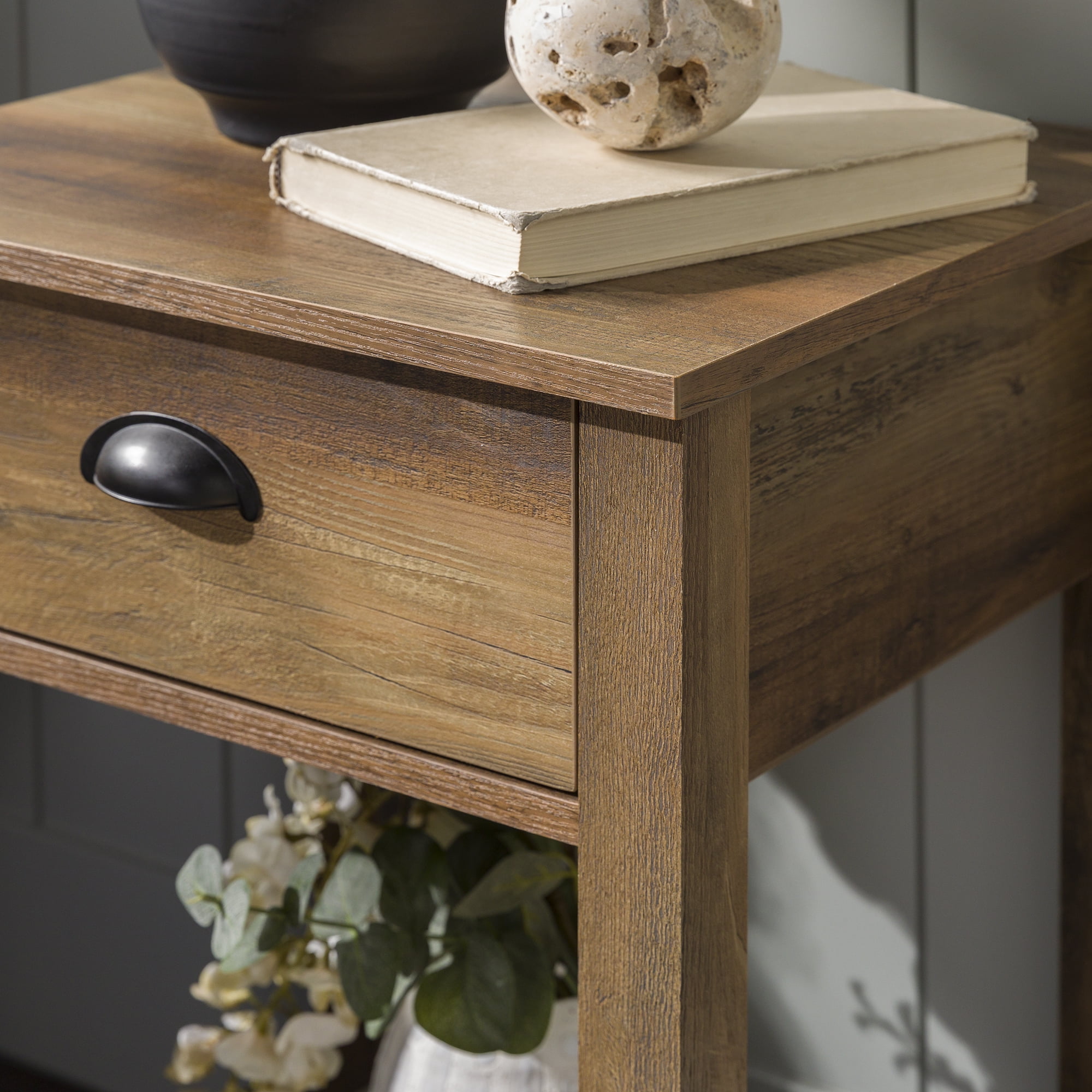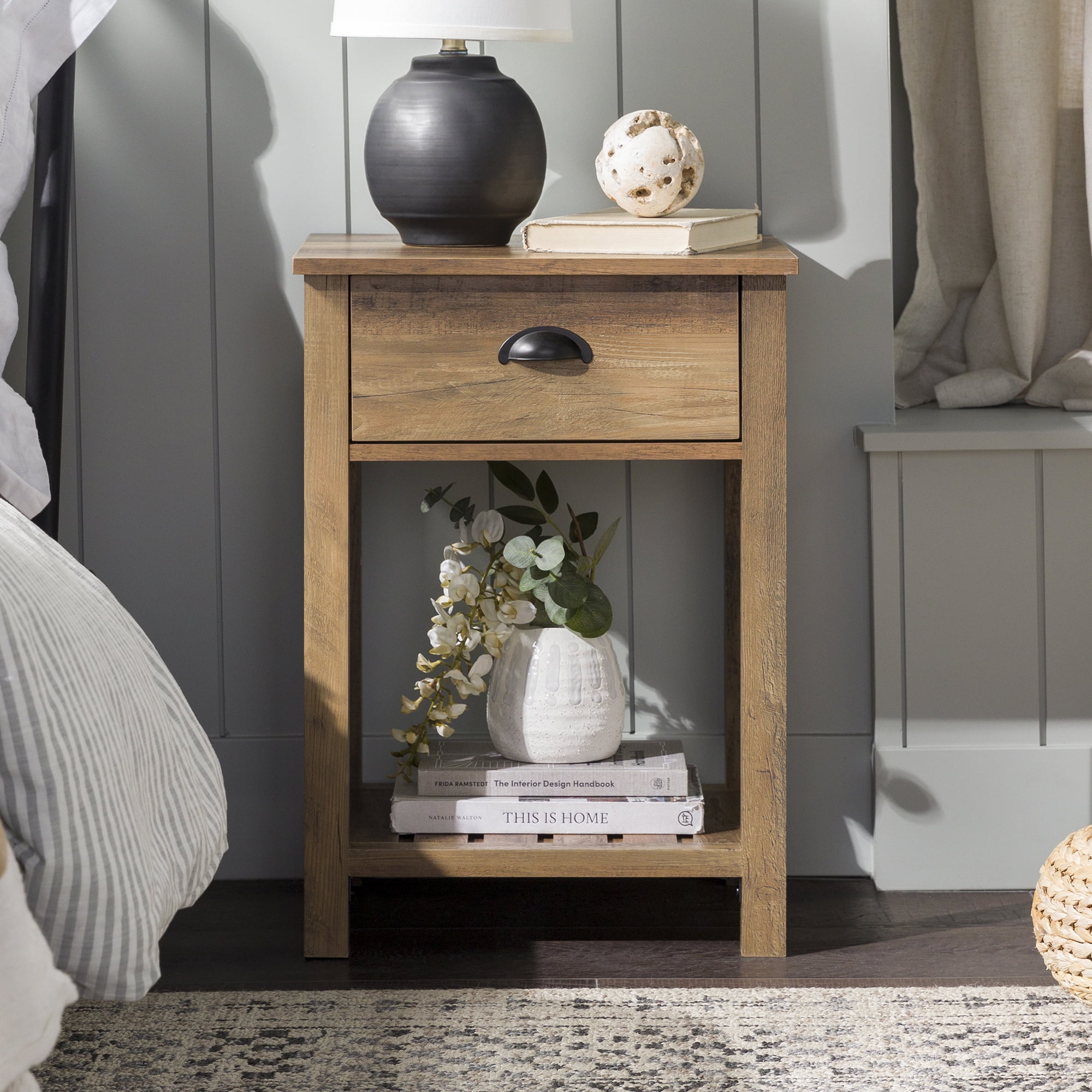 Whether you’re looking to keep things quaint and country or simply organize your home, this Walker Edison one-drawer farmhouse nightstand will satisfy your design desires. The single top drawer with a cup handle features telescoping metal drawer glides for a smooth push and pull track for convenient closed storage. The lower slat style shelf creates open storage while infusing farmhouse style. Use this accent table in the living room or home office for some sneaky storage. Pair with the matching entry table to make a complete set in your home.