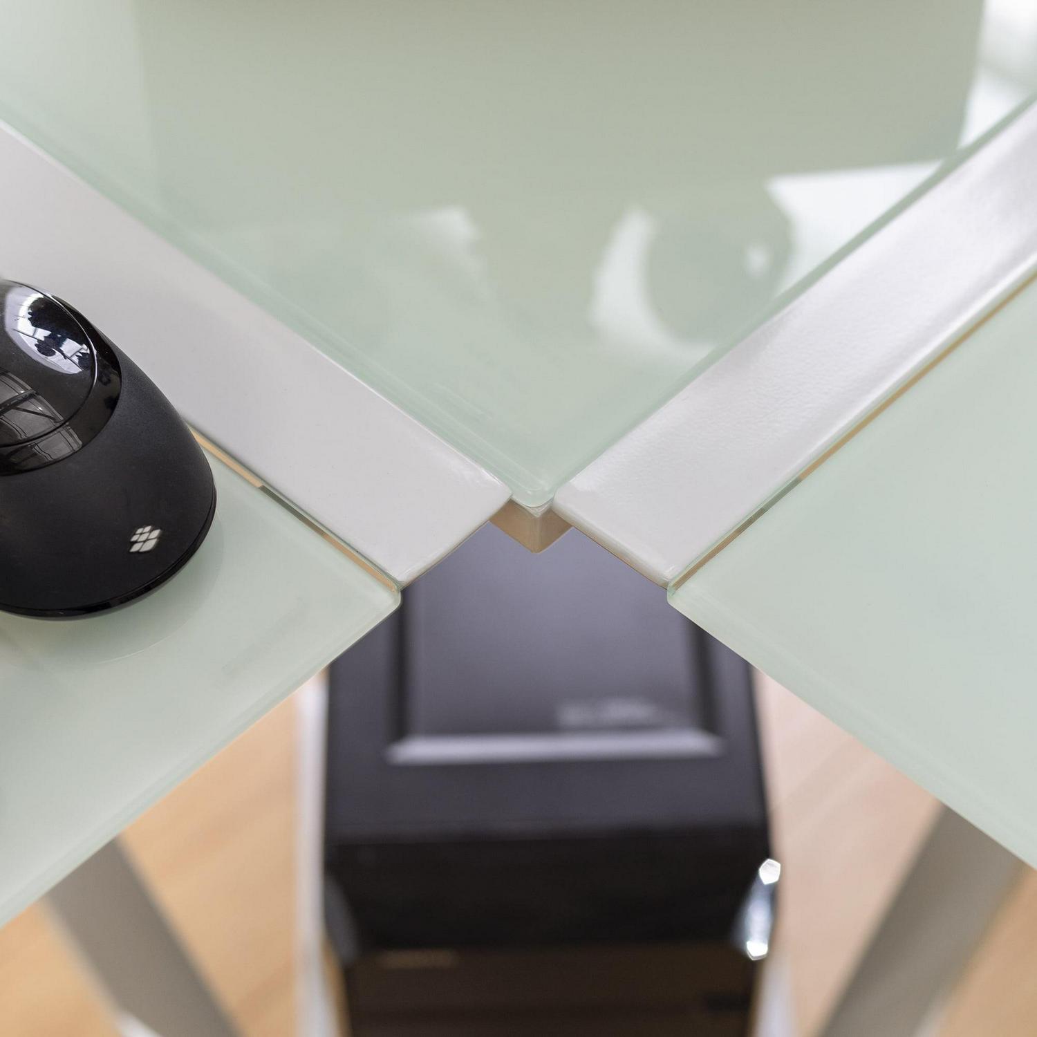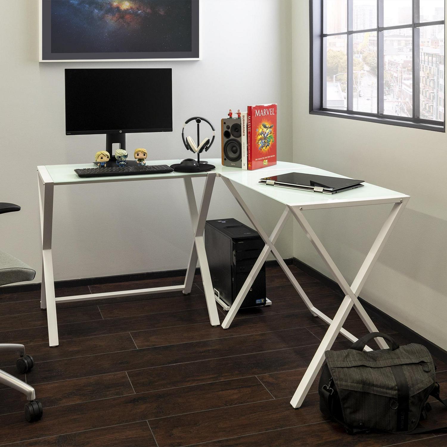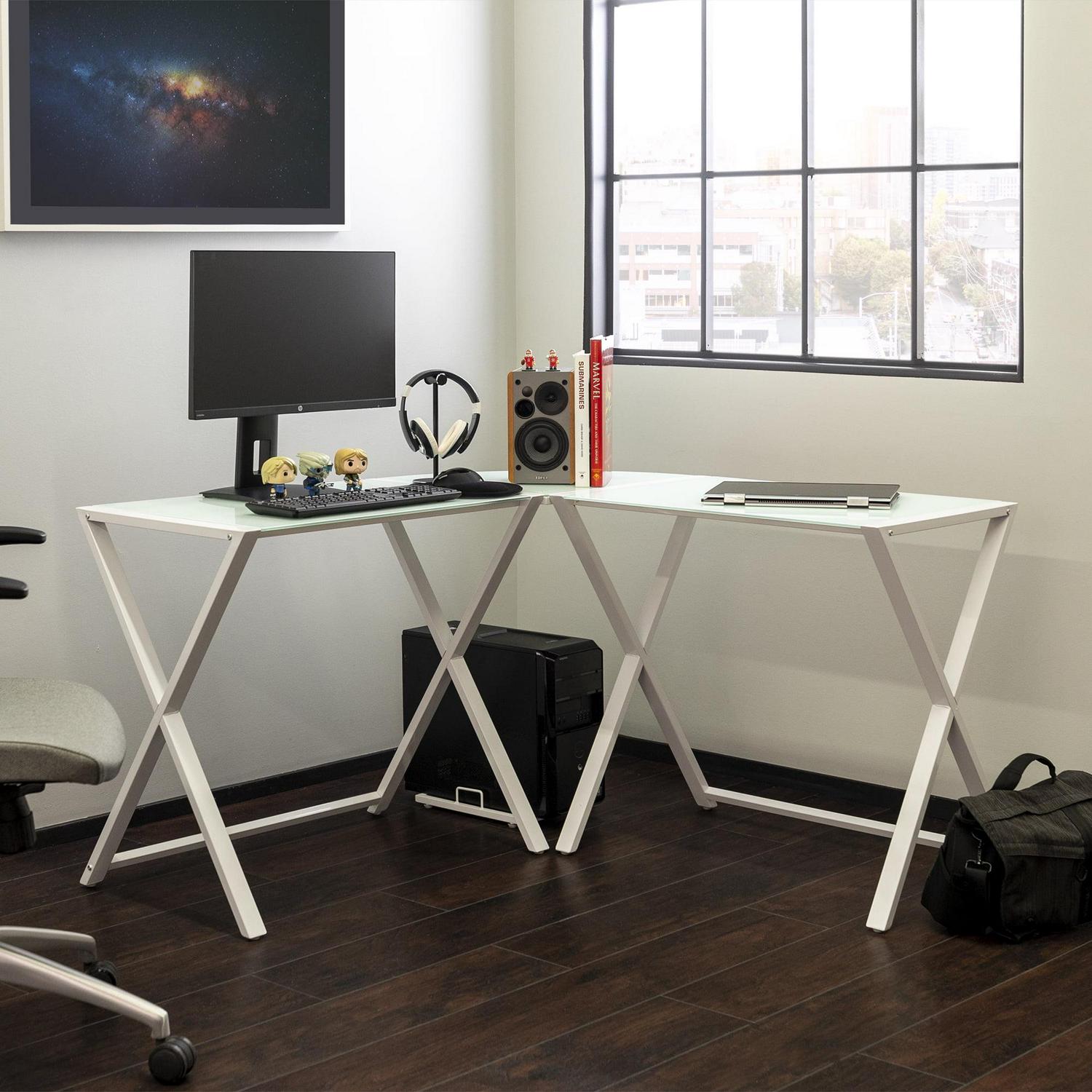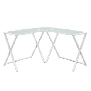 Walker Edison Glass and Metal X-Frame Corner Computer Desk, White