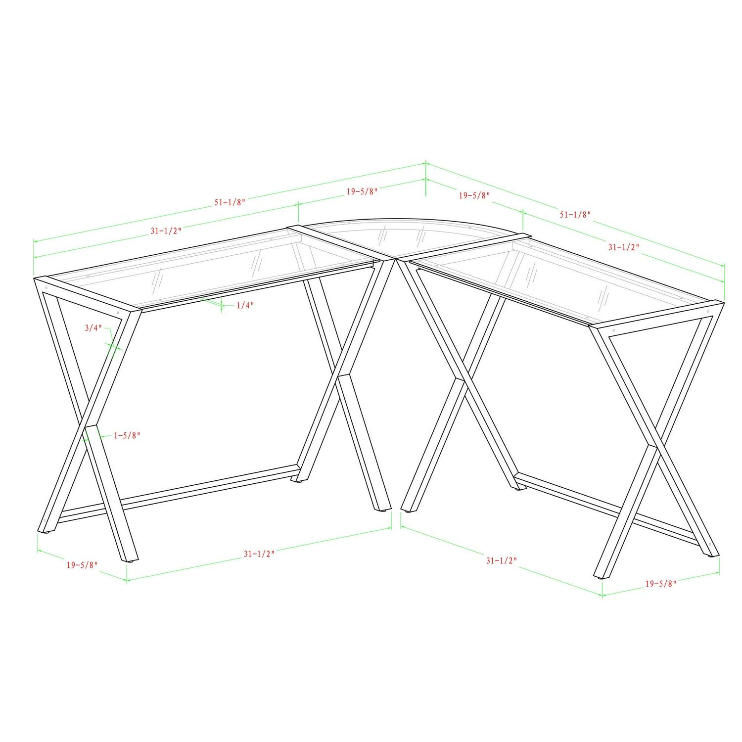 Unfettered by excessive drawers and shelves, the simple design of this three-piece computer desk exudes sophistication. Its L-shaped setup creates the perfect corner wedge to save you space and optimize your home office. Features a powder-coated steel frame and tempered safety glass shelves with beveled edges for a soft, smooth finish. Features: Polished and beveled, tempered safety glass, Steel frame with powder-coated finish, Space-saving L-shape design, Unique X-frame with flat metal tubing, All glass is 6 mm thick, Ships ready-to-assemble with step-by-step instructions, Dimensions: 29 H x 51 W x 20 D Inch, Weight: 57 lbs.