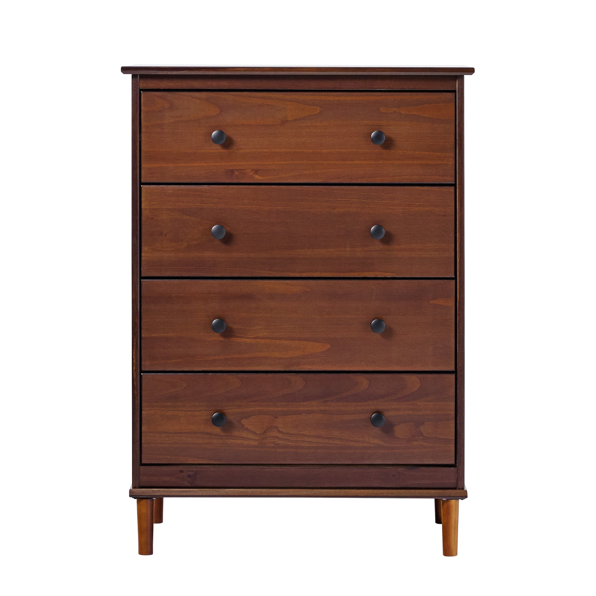 A clean and modern take on the classic wood dresser comes to life in this 40” tall vertical dresser. Its tapered legs give just the right amount of mid-century design to be the perfect subtle starting point moving into your retro redesign. Its simple silhouette makes this Walker Edison 4-drawer dresser timeless without feeling stuffy or old. This piece transitions well with a wide range of styles and stages of life so whether you put it in a colorful children’s room or a traditional guest room, you’ll be pleased with its performance. The solid pine wood that is used in the piece is responsibly harvested from renewable forests, finished in a beautiful caramel color, and paired with black hardware handles.