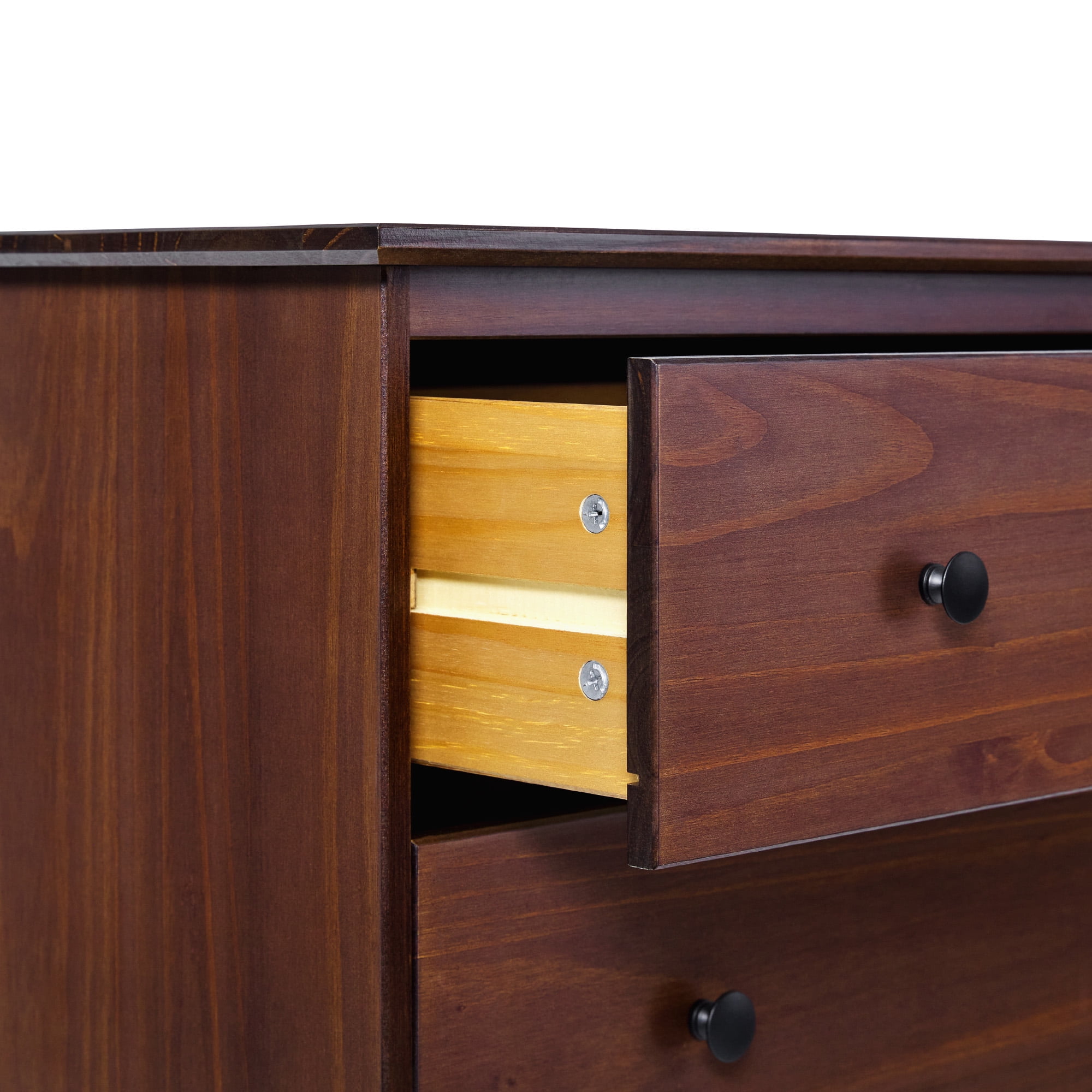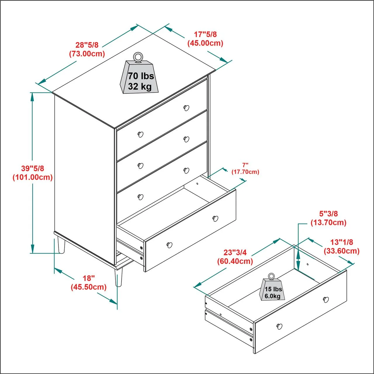 Number of drawers: 4 Wall fastening hardware included Sustainably sourced pine wood Packaged dimensions: 8″ H x 38″ L x 18″ W Assembled Dimensions: 39.63″ H x 28.63″ L x 17.63″ W Materials: Solid Pine Wood, MDF, Plastic, Metal Hardware Assembly: Some assembly required Wood Finish: Walnut Hardware Finish: Black