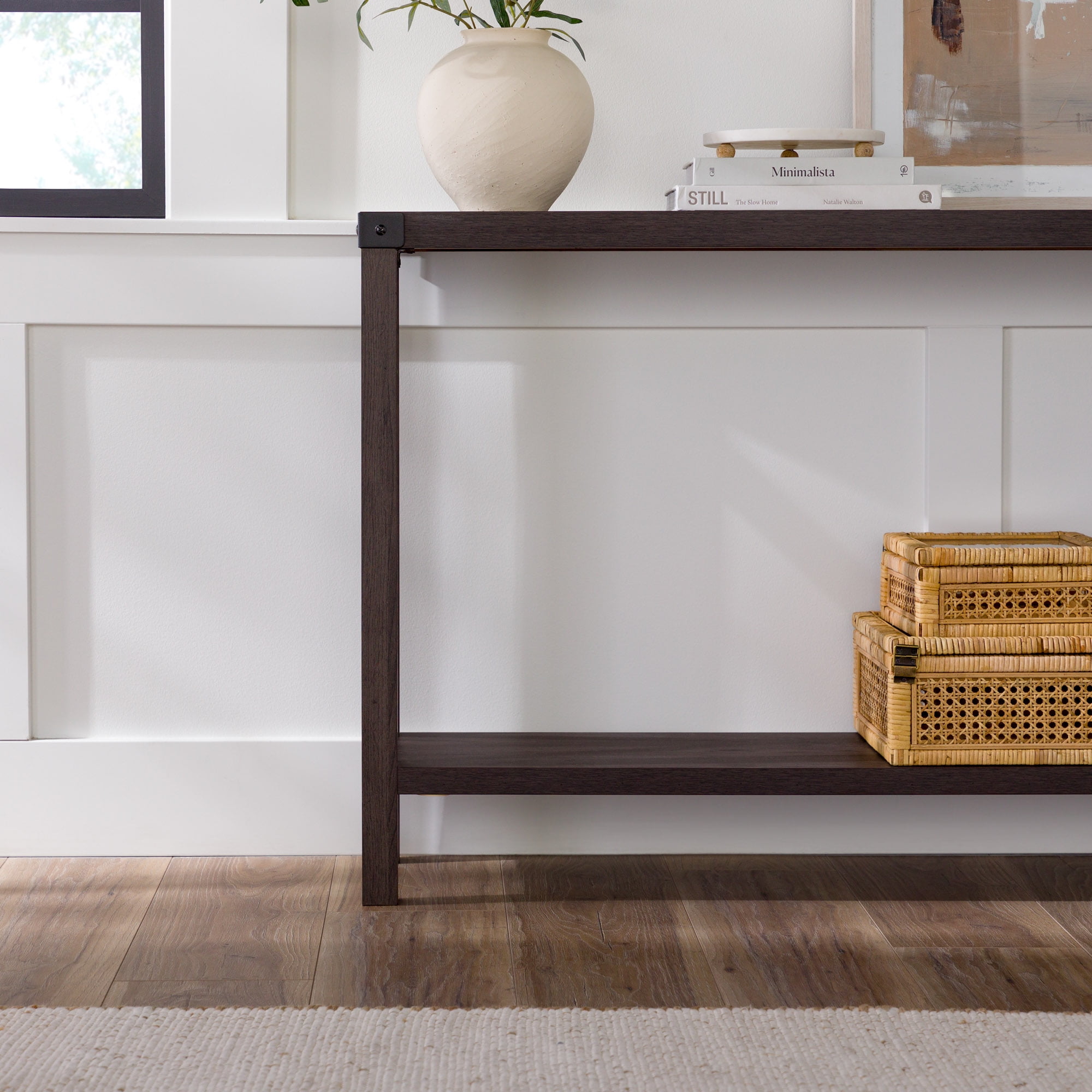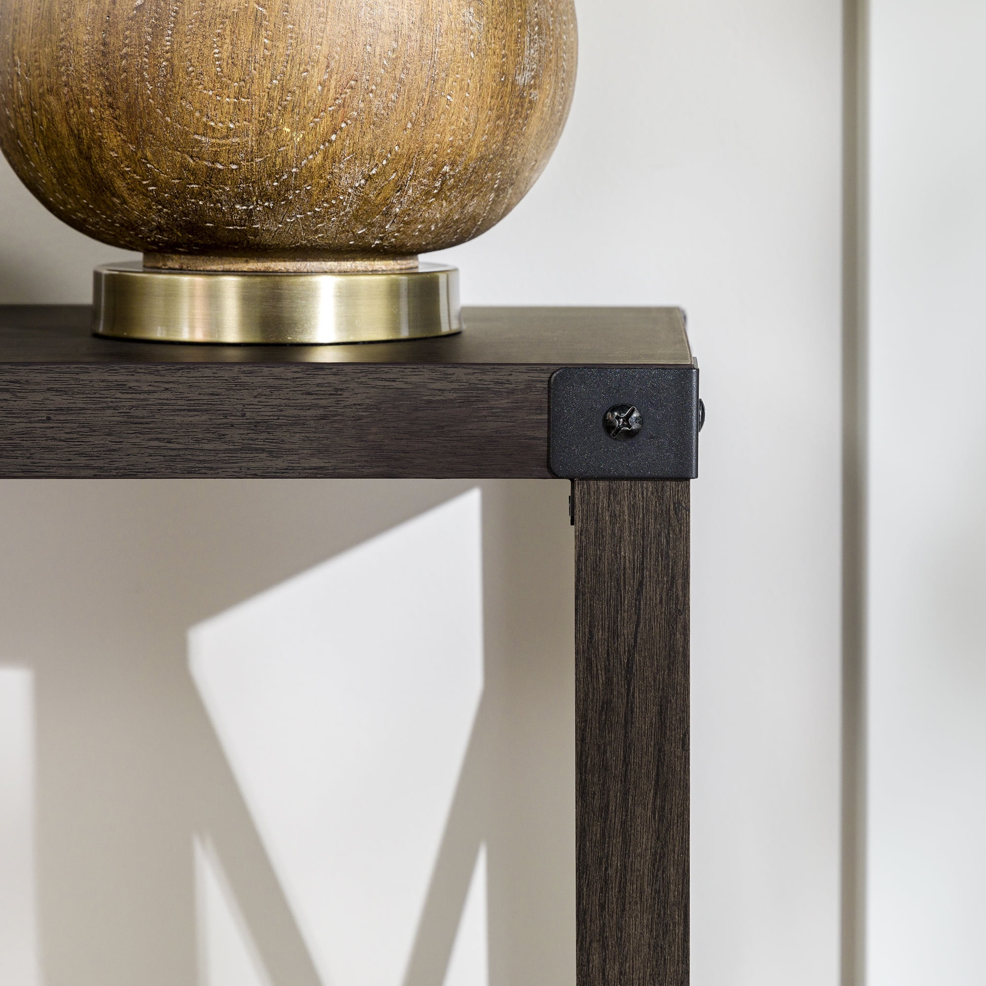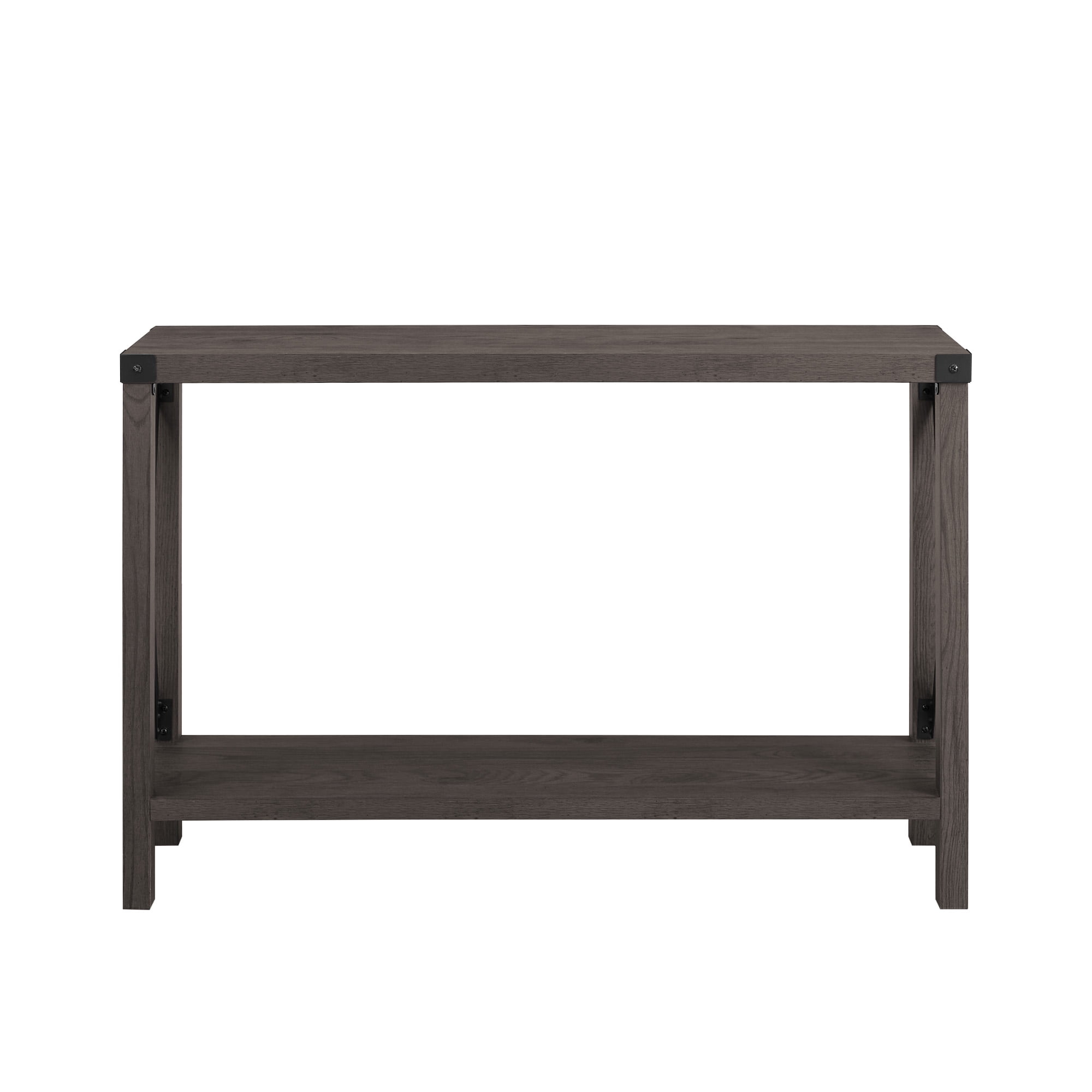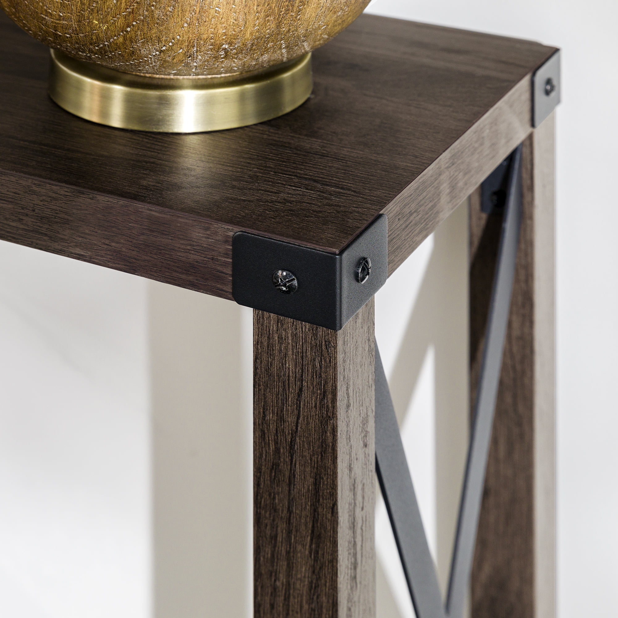Light and relaxed is how all your guests will feel upon encountering the Magnolia Metal X Dark Walnut Entry Table by Walker Edison in your hallway. You will also feel its calming effects when used in any room of the house, whether living room, kitchen, or bedroom. This sofa table gives the opportunity to display your new house plants or other decoration while also providing a storage shelf out of the line of sight. A table like this can change how you organize your home no matter where it is placed. The metal X detailing on either side of the table and top corner brackets really bring a rustic feel to your already naturally characterized home.