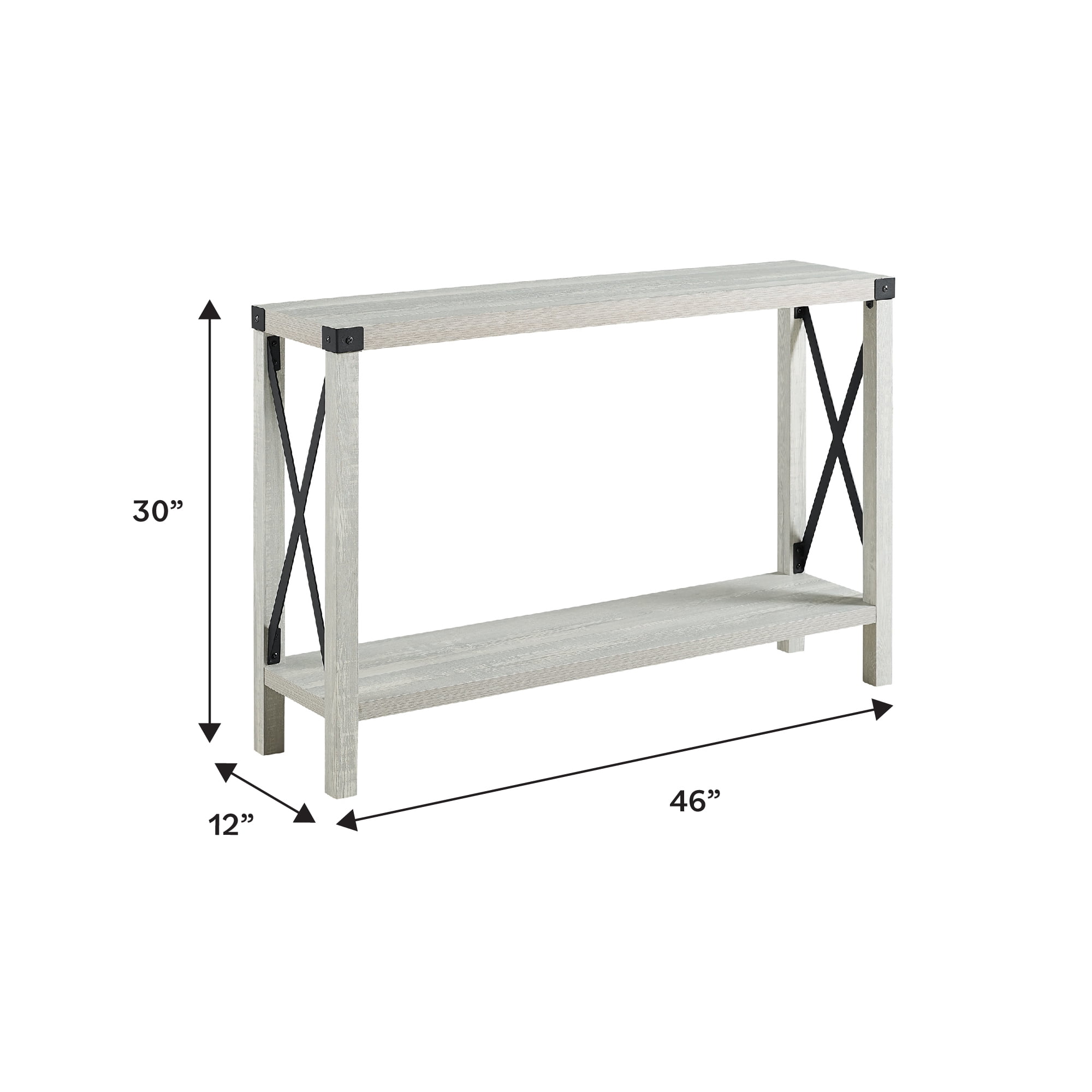 Black, powder-coated metal X accents Open storage Natural boho style Attractive top corner brackets Sable finish Lower fixed storage shelf Packaged dimensions: 6″ H x 51″ L x 15″ W Assembled Dimensions: 30” H x 46” L x 35” W Materials: Warp-resistant MDF, durable laminate, metal Assembly: Some assembly required