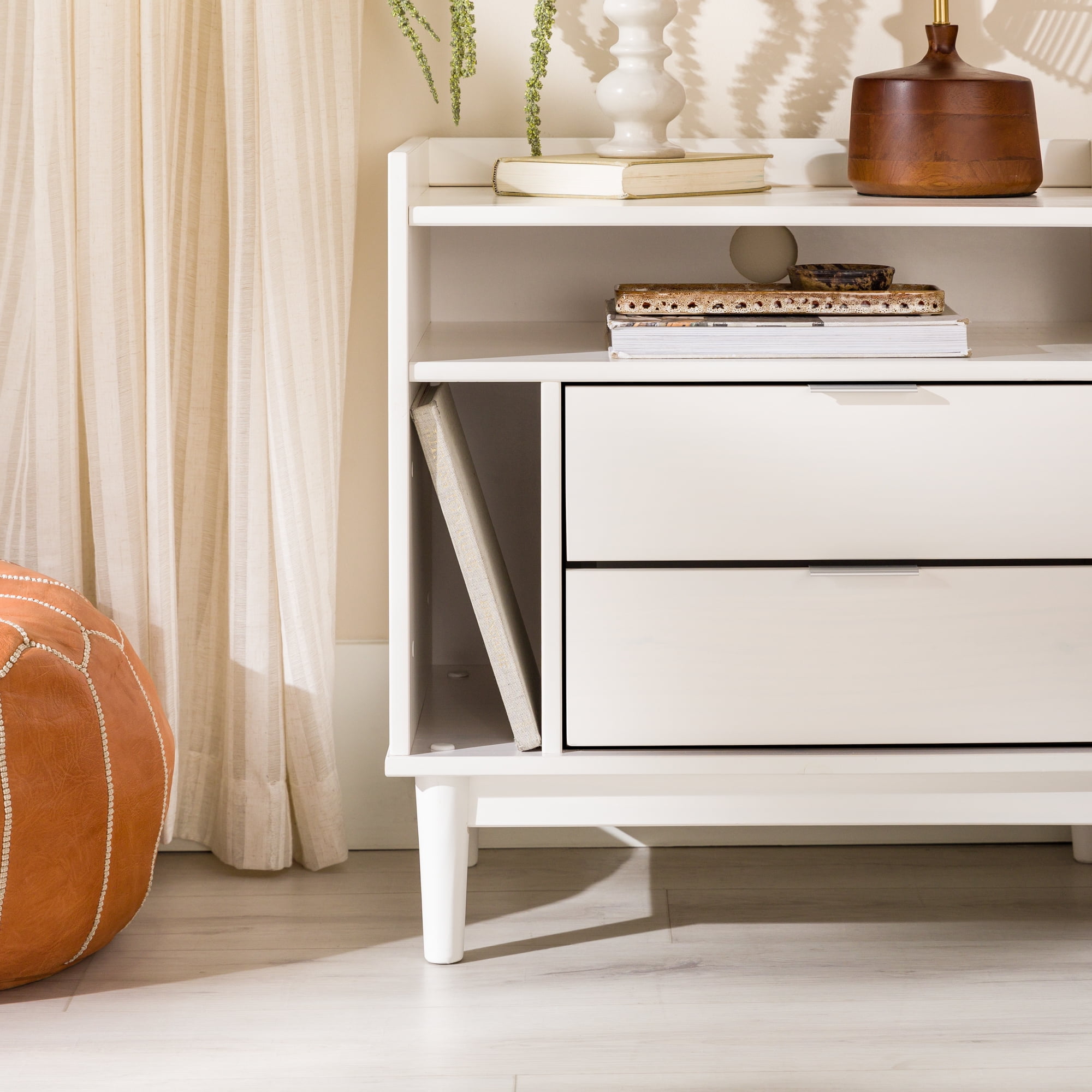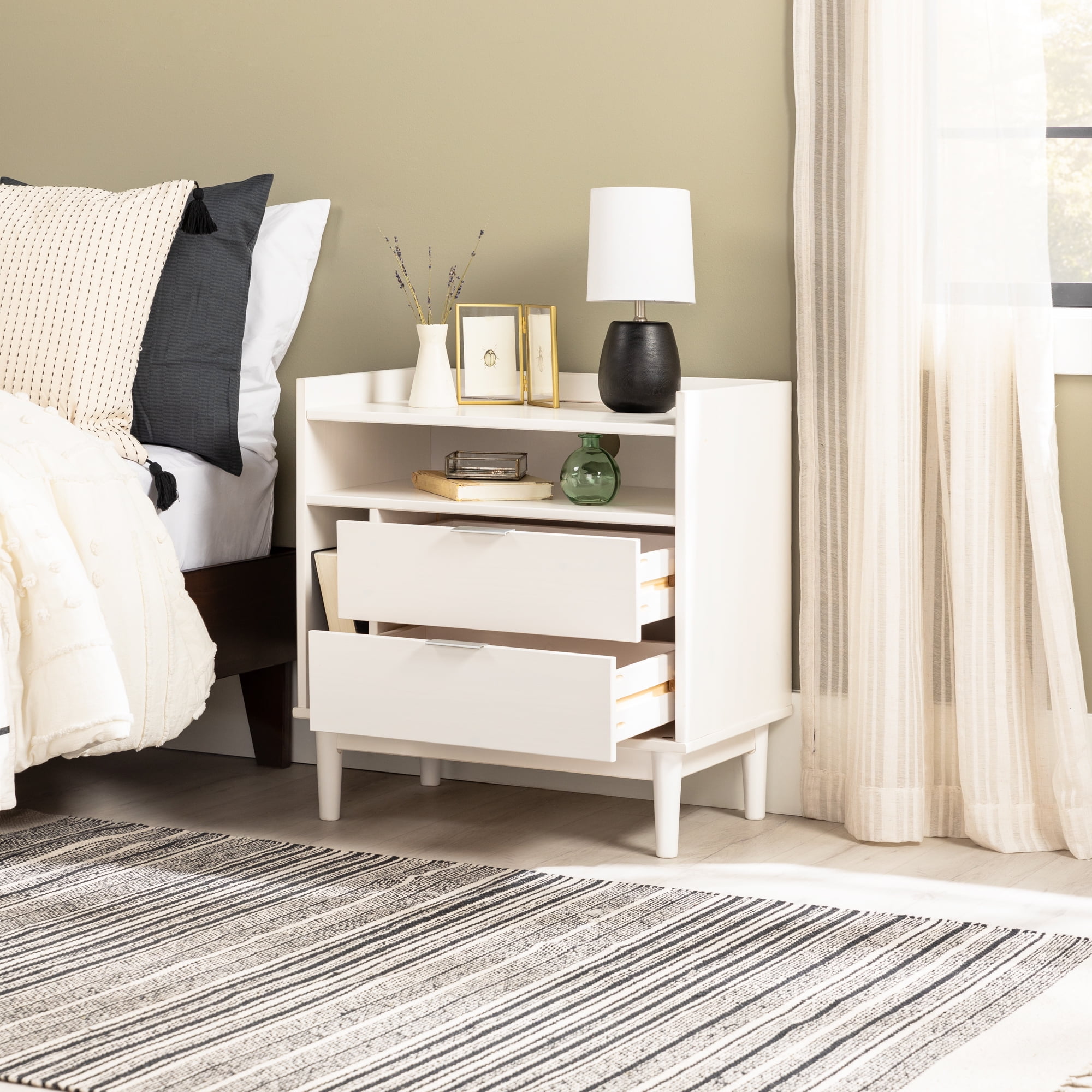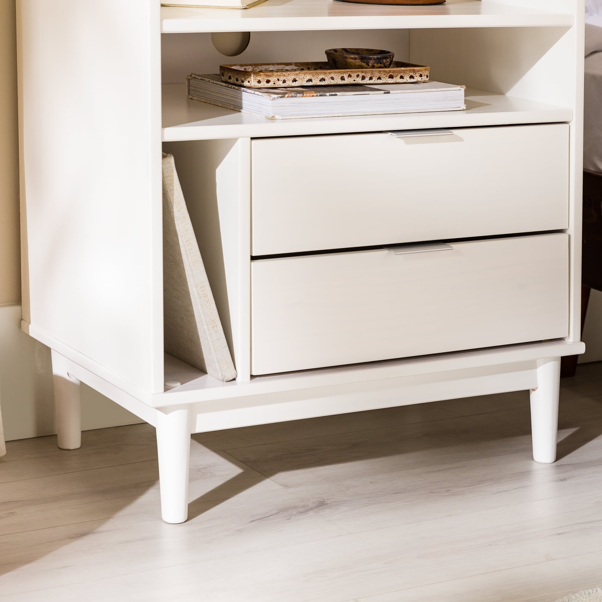 Create a bedroom that matches your style with the Walker Edison Mid-Century Modern 2-Drawer Wood Nightstand. Use the vertical open shelf to store your favorite novels and the horizontal shelf for jewelry or remotes. The two closed-storage drawers are perfect for tucking away the items you want out of sight. Invite a mid-century modern feel with the retro-inspired metal hardware and tapered legs. This piece also functions as an end table for those looking to elevate their living room. You can upgrade the look of your home in sustainable style, due to this piece’s construction of responsibility harvested pine wood. Pair with the Walker Edison Mid-Century Modern 6-Drawer Wood Dresser for a cohesive look.