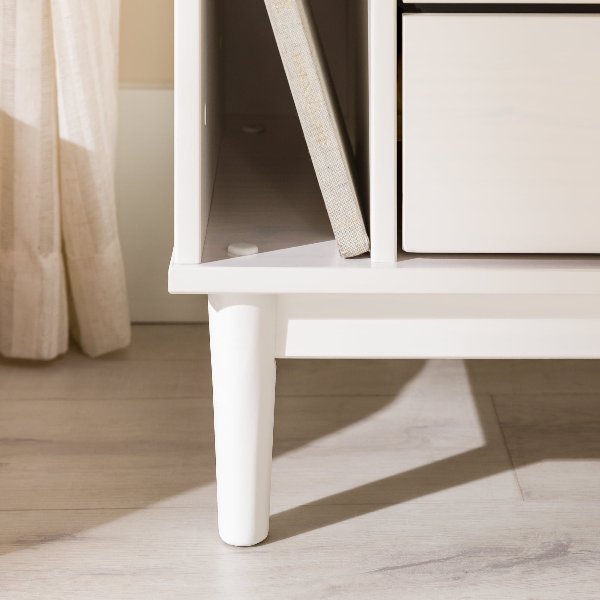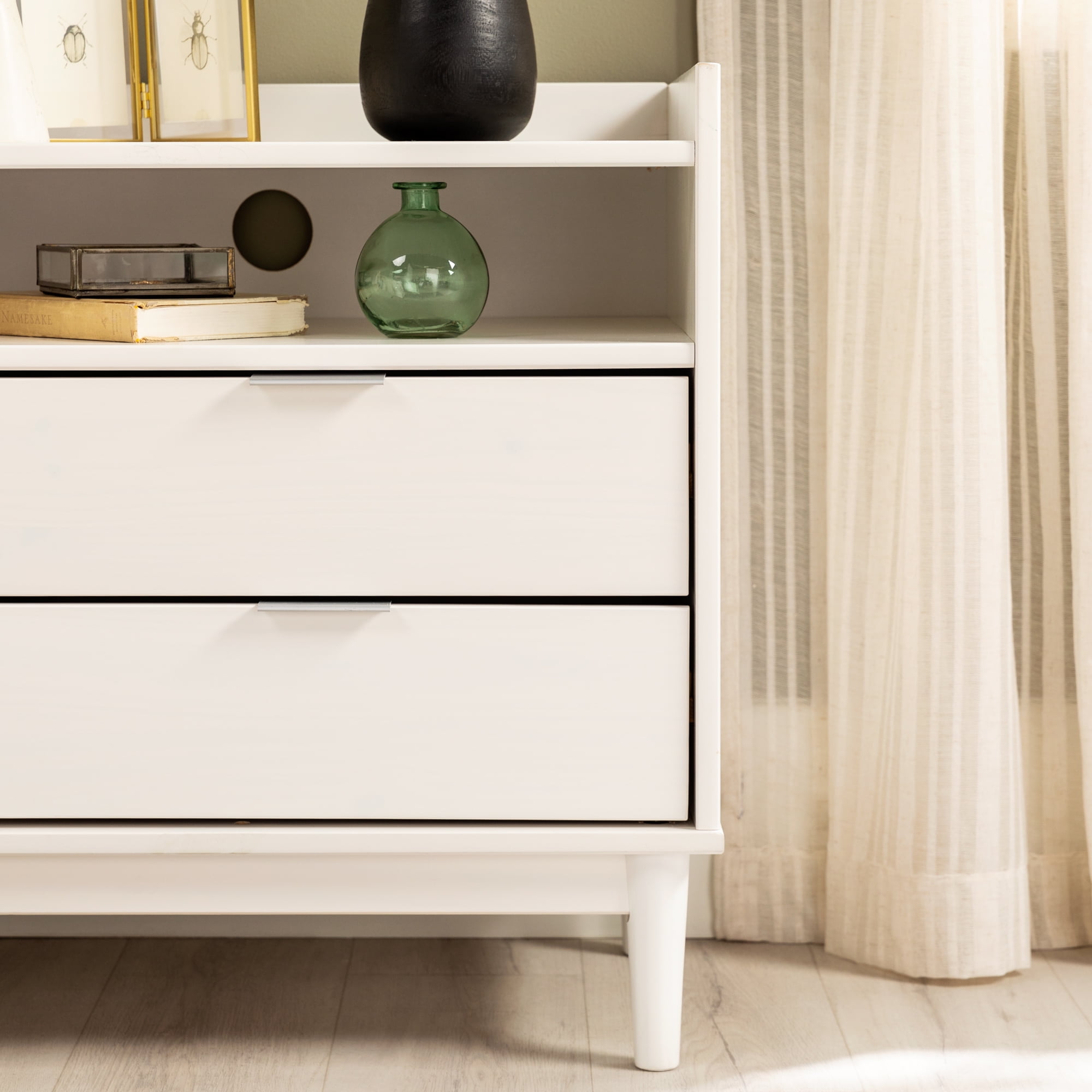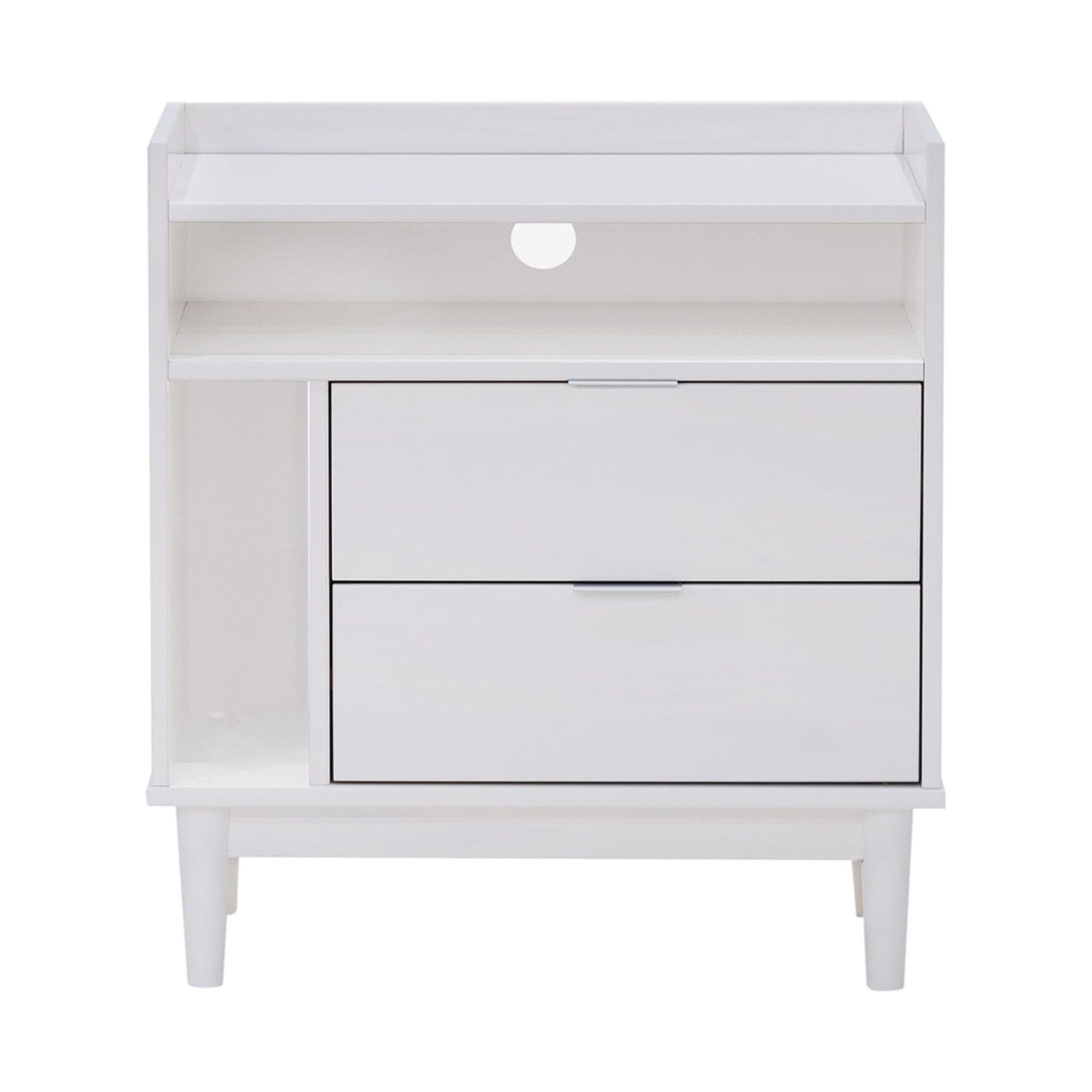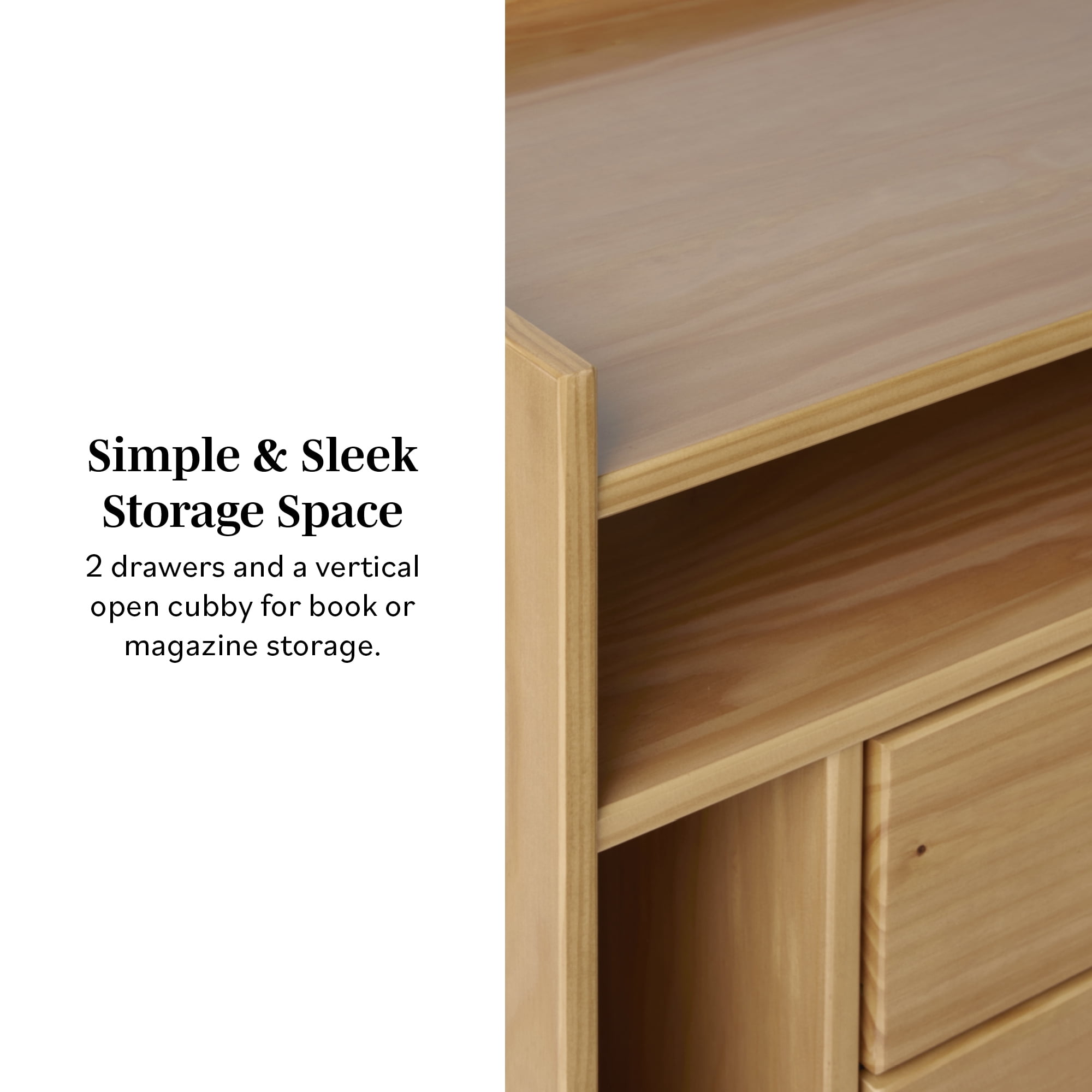 Create a bedroom that matches your style with the Walker Edison Mid-Century Modern 2-Drawer Wood Nightstand. Use the vertical open shelf to store your favorite novels and the horizontal shelf for jewelry or remotes. The two closed-storage drawers are perfect for tucking away the items you want out of sight. Invite a mid-century modern feel with the retro-inspired metal hardware and tapered legs. This piece also functions as an end table for those looking to elevate their living room. You can upgrade the look of your home in sustainable style, due to this piece’s construction of responsibility harvested pine wood. Pair with the Walker Edison Mid-Century Modern 6-Drawer Wood Dresser for a cohesive look.