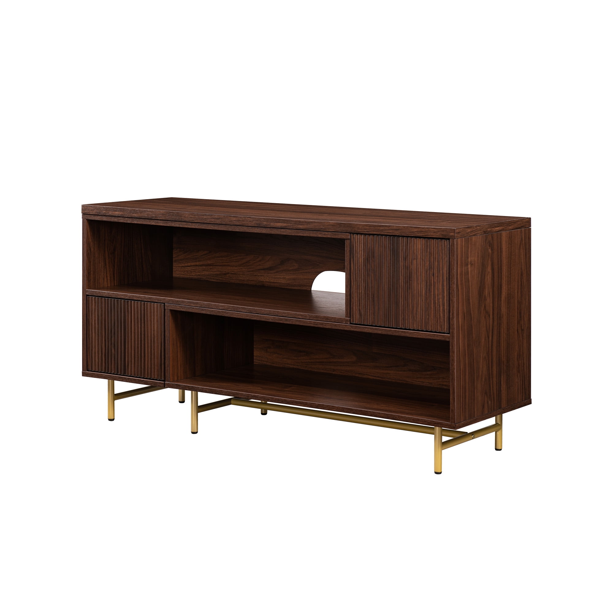 Enjoy a balance between modern style and contemporary storage function with this extendable TV stand by Walker Edison. Keep the TV stand in a condensed state to save on space or extend the frame to get an elegant and elongated look. The classic silhouette will remain timeless as your style evolves. Featuring cord management ports, this piece can keep the cords of your tech and gadgets tidy. The versatile design will look right at home in mid-century modern, modern, and contemporary aesthetics.