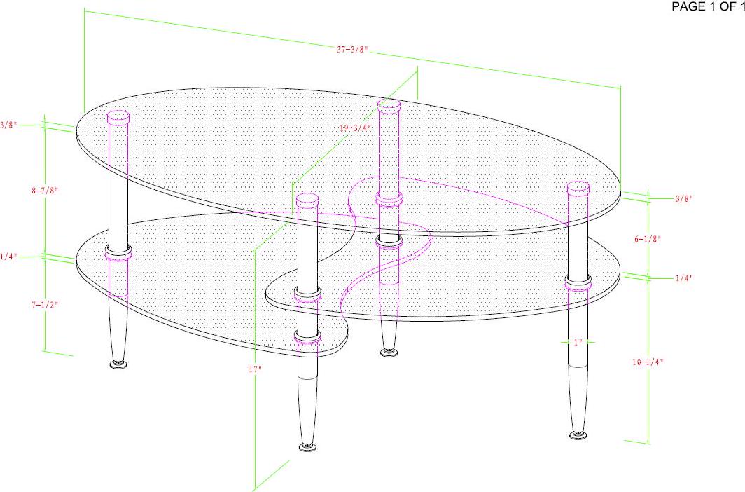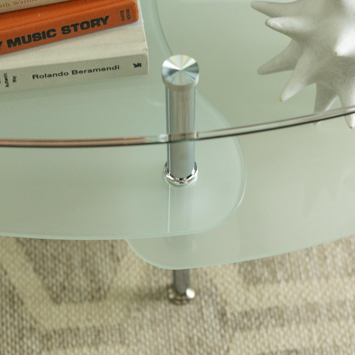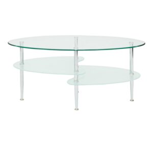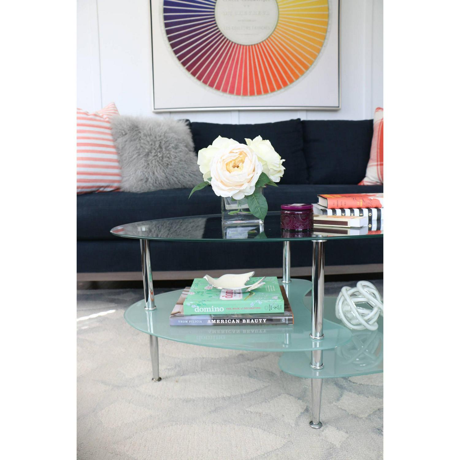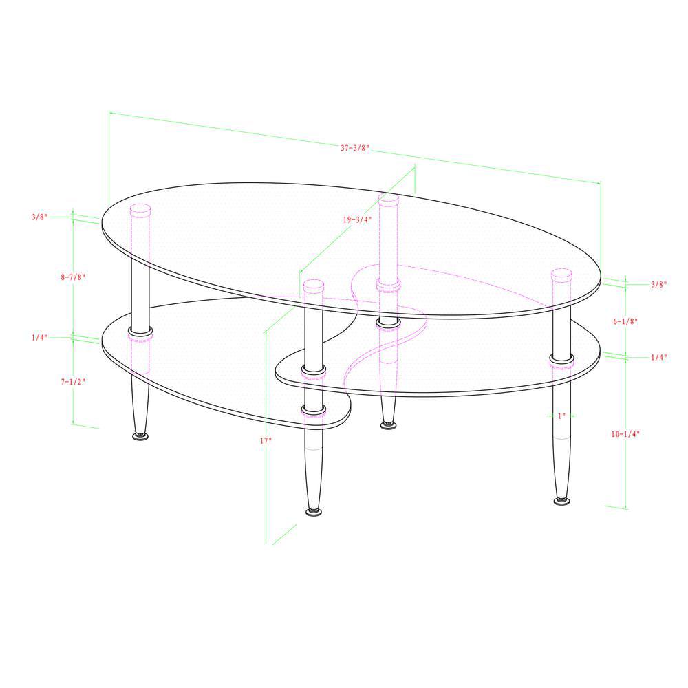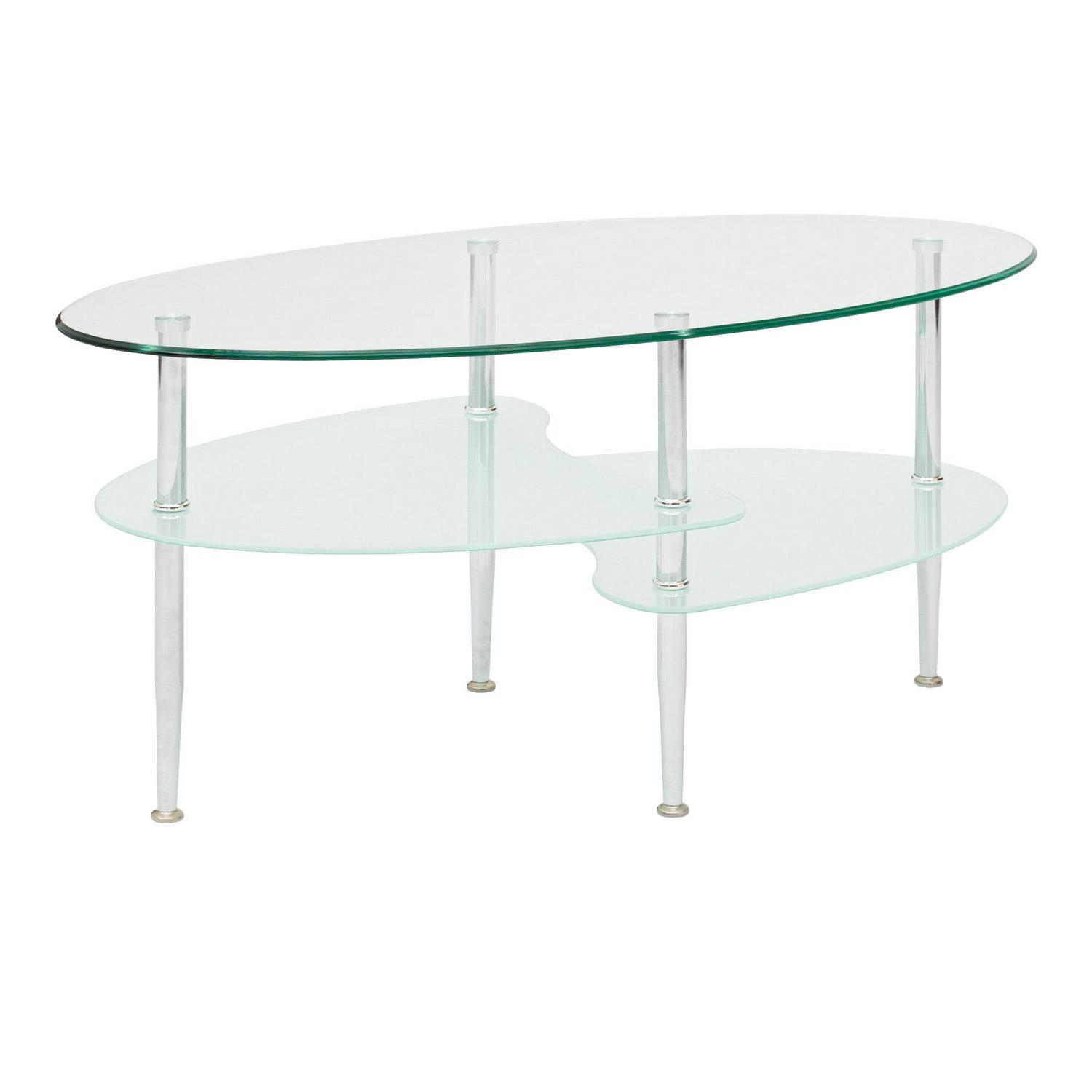 This stylish Mid-Century Modern Oval Glass Coffee Table offers multiple levels to showcase your magazines and books and provides a durable foundation for your morning coffee in your living room. Its distinct metal tapered legs support the three tempered safety glass shelves. The layered glass shelves give a subtle sleek and elegant appeal to your living space, while also having a mid-century modern design. Features two frosted lower shelves, each having beveled edges for a soft, smooth look.