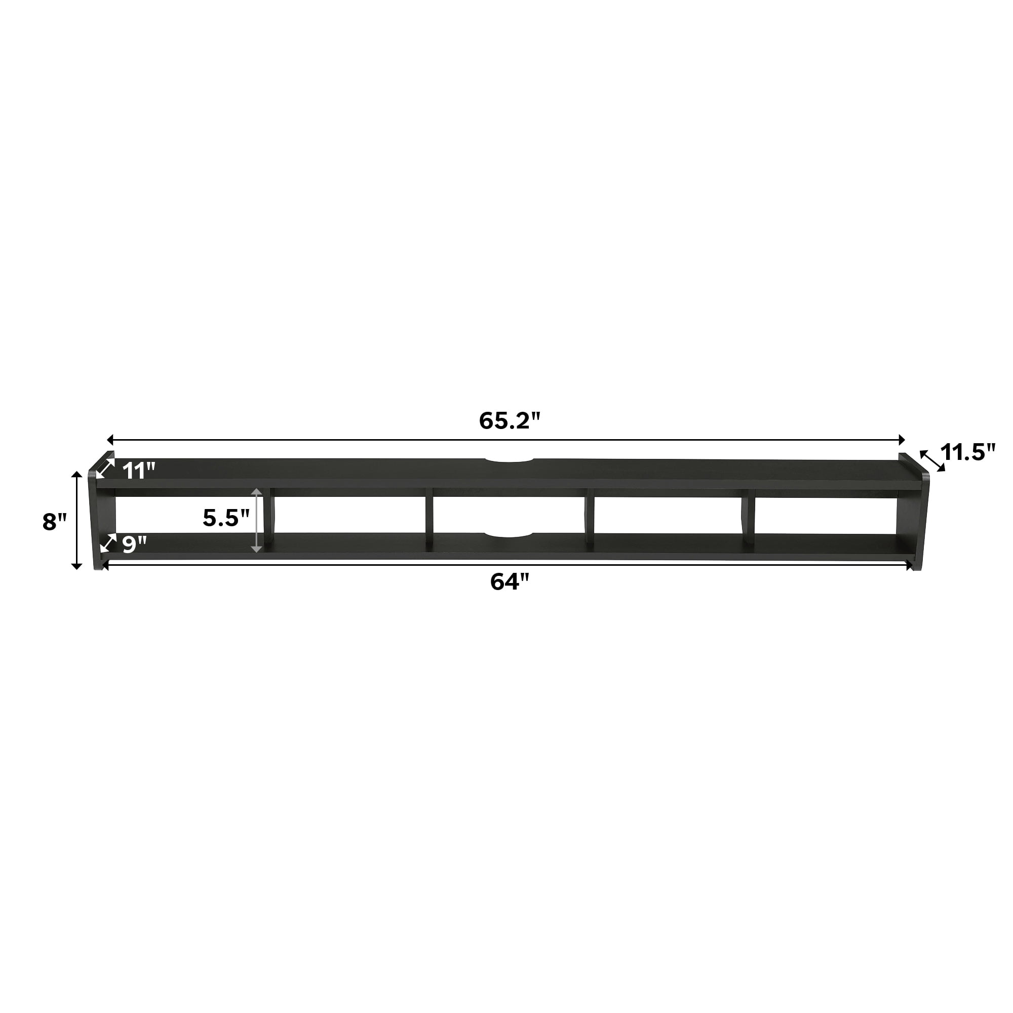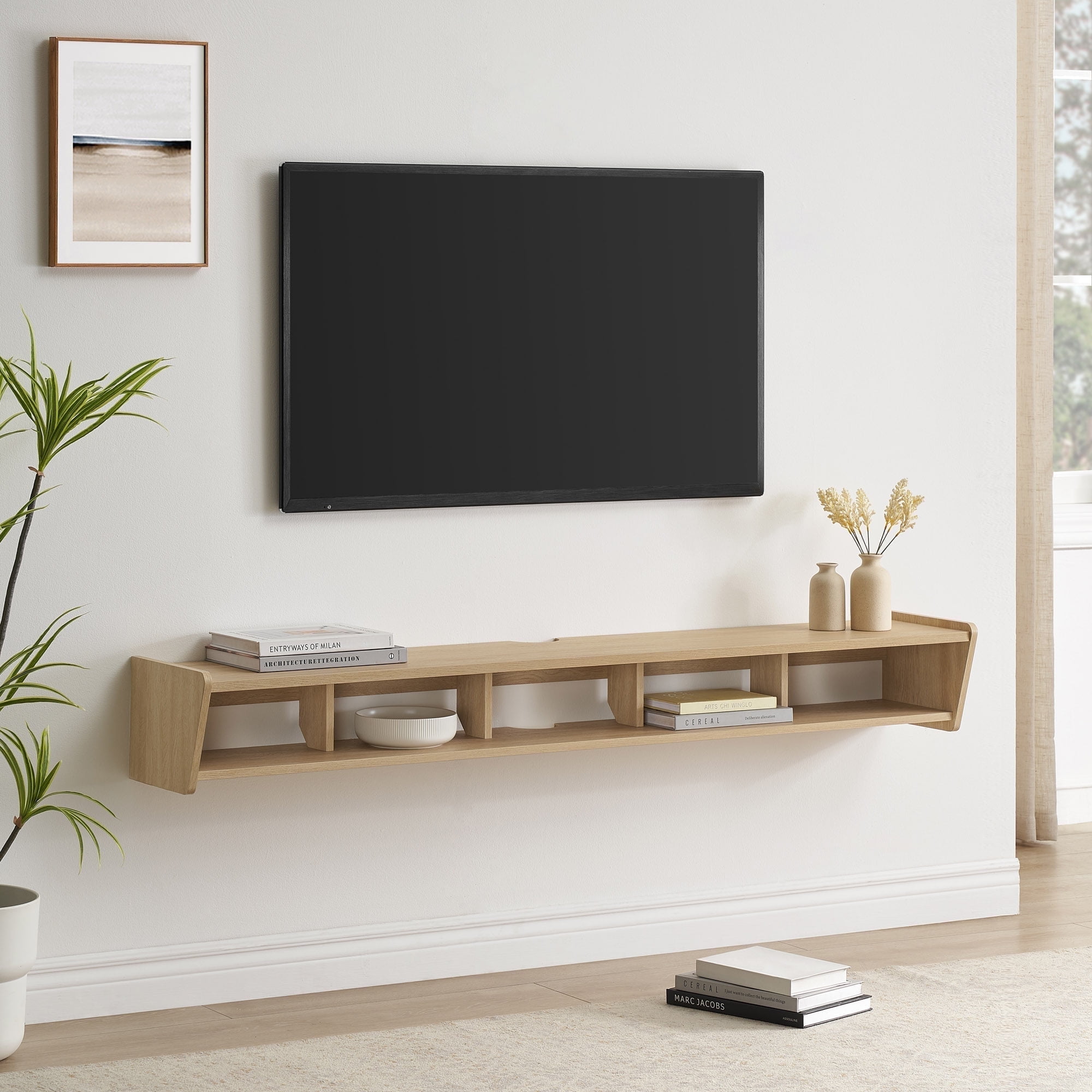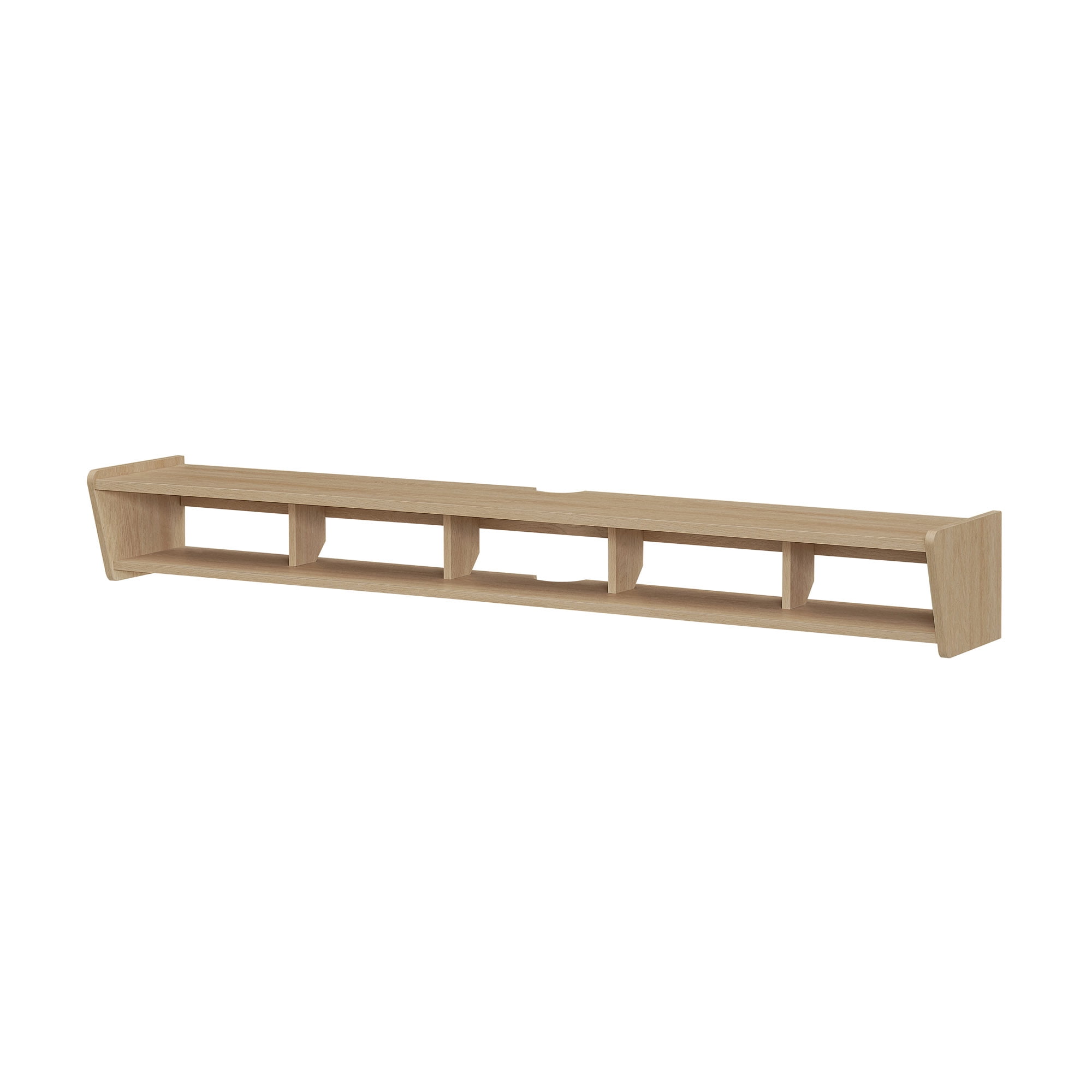 Minimalist style Coastal oak finish 4 open storage cubbies within 1 shelf Wall-mounting hardware included Floating design frees up space in your home Made from warp-resistant MDF and durable laminate Assembled dimensions: 8” H x 65” L x 11” W Packaged dimensions: 4″ H x 69″ L x 14″ W