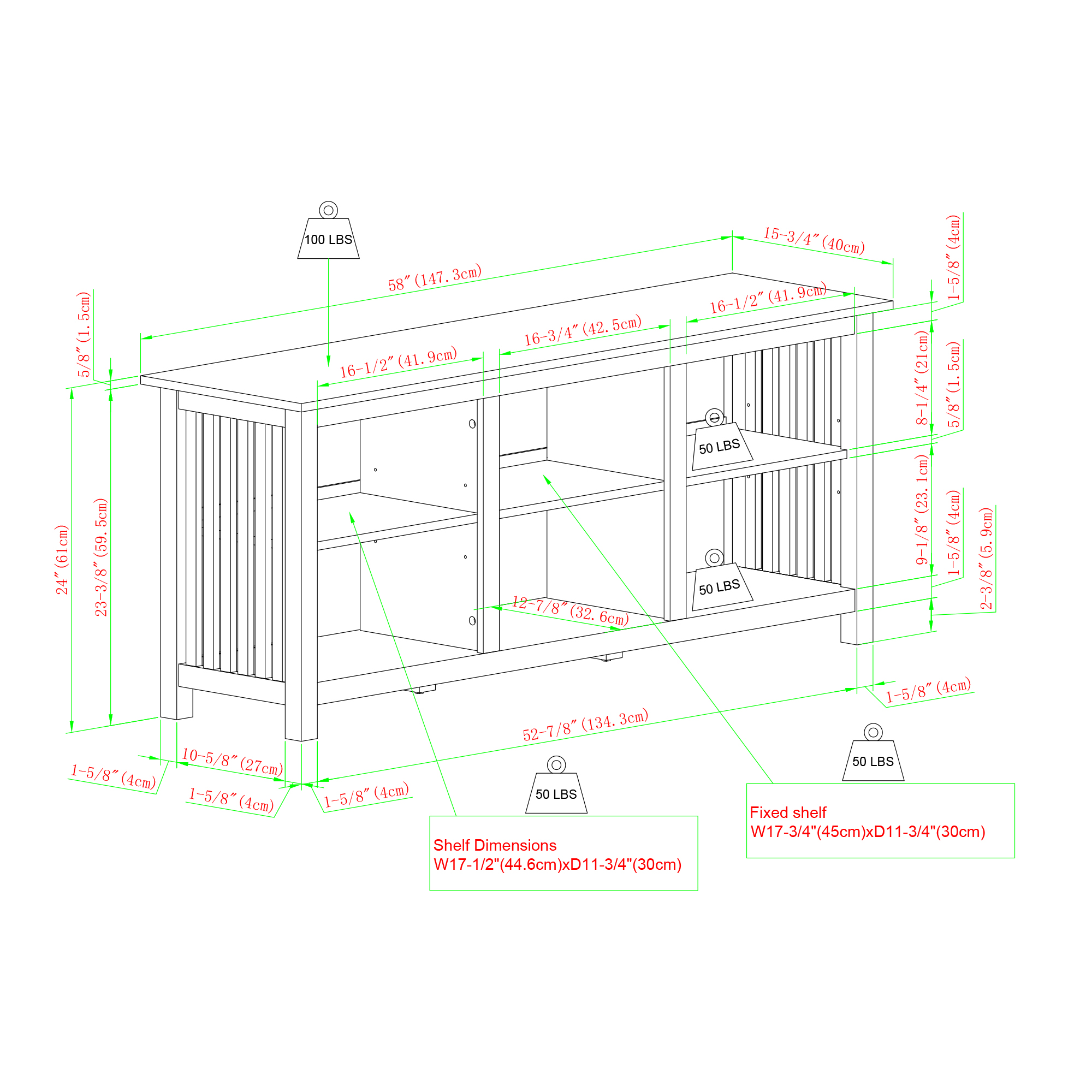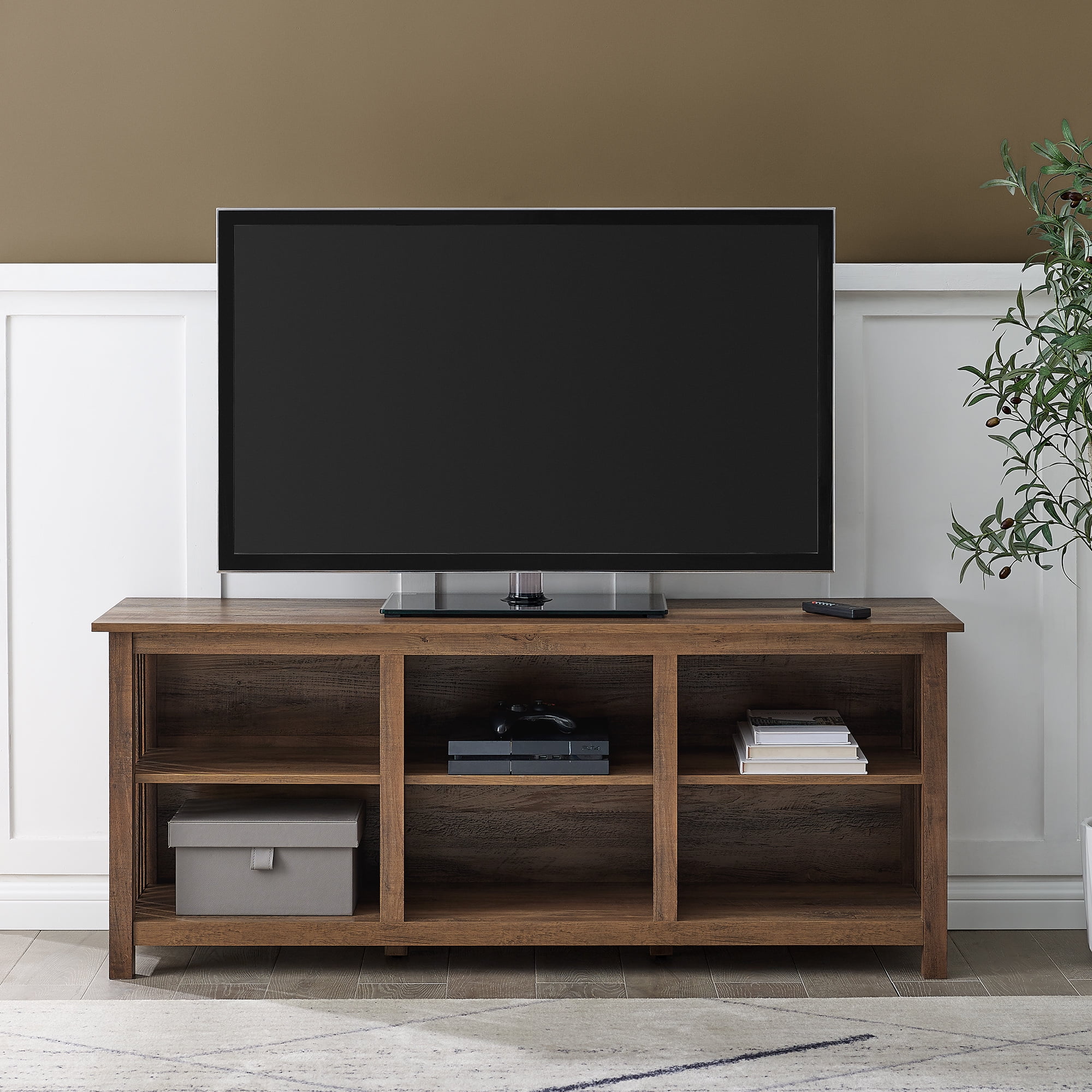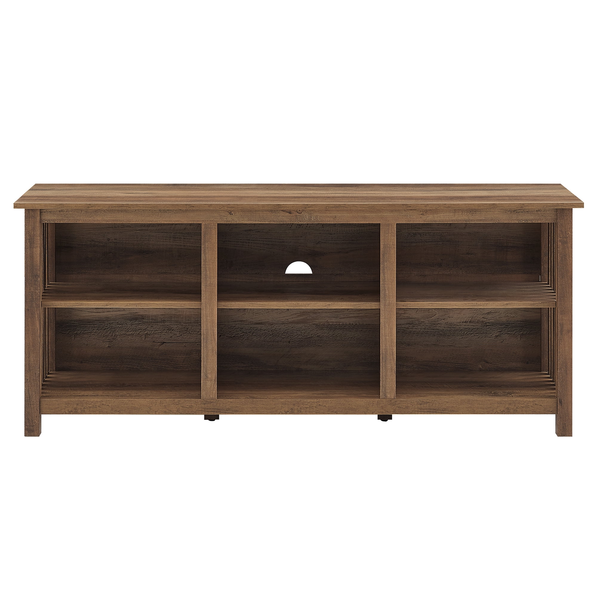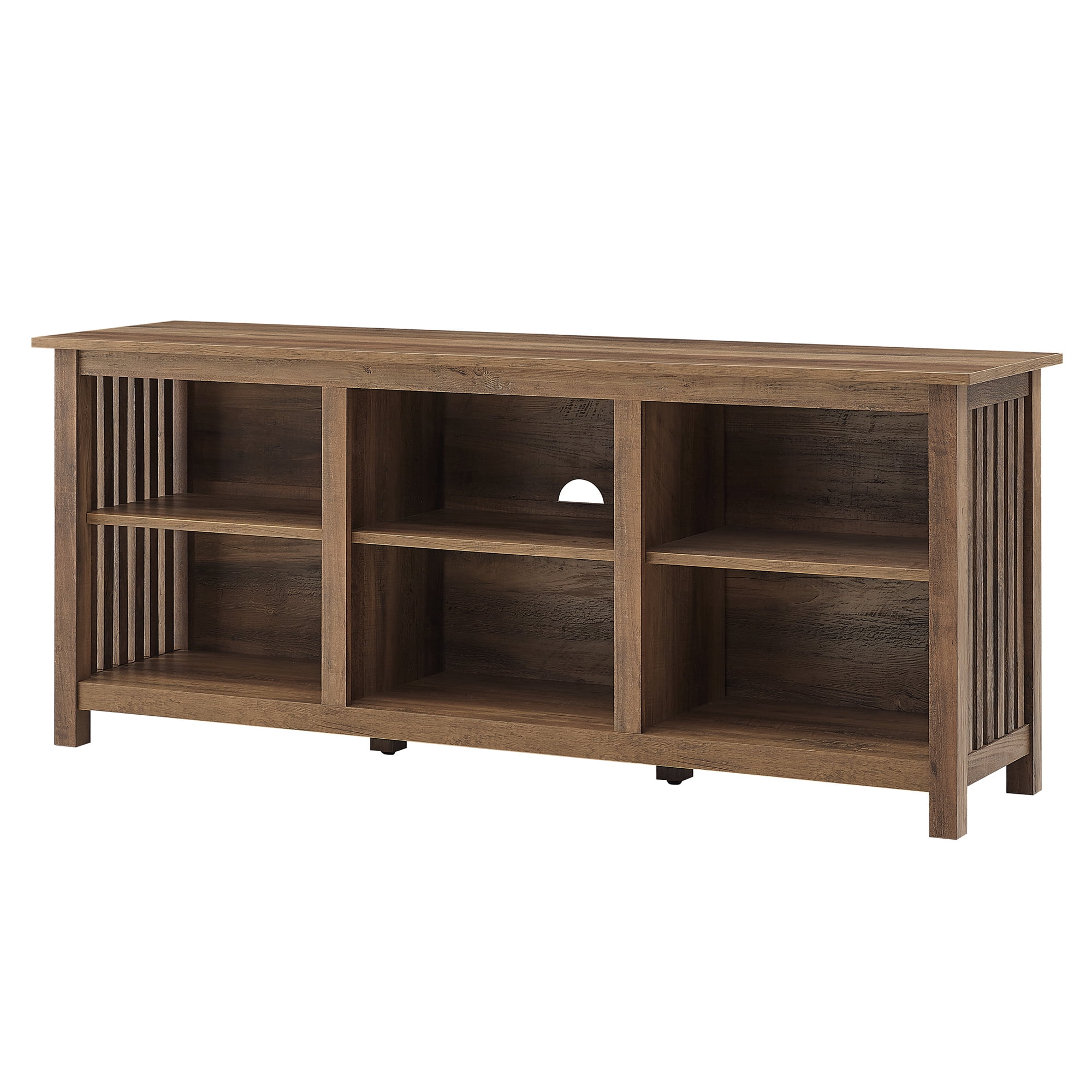 Traditional, mission style Rustic oak finish Slatted side detailing for an eye-catching design 6 spacious open-storage cubbies Featuring cord management ports for easy organization Versatile silhouette that fits in with mission, modern, and rustic-styled homes. Made from warp-resistant MDF wood and durable laminate Ships ready-to-assemble with step-by-step instructions Assembled dimensions: 24” H x 58” L x 16” W Packaged dimensions: 6″ H x 63″ L x 19″ W