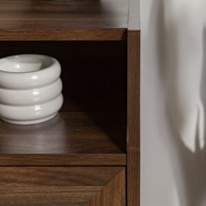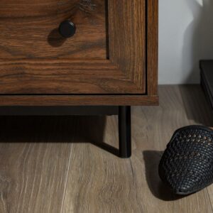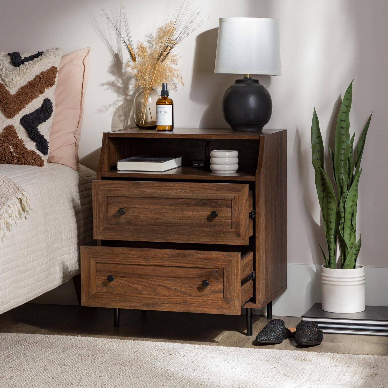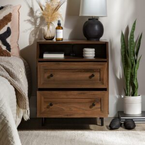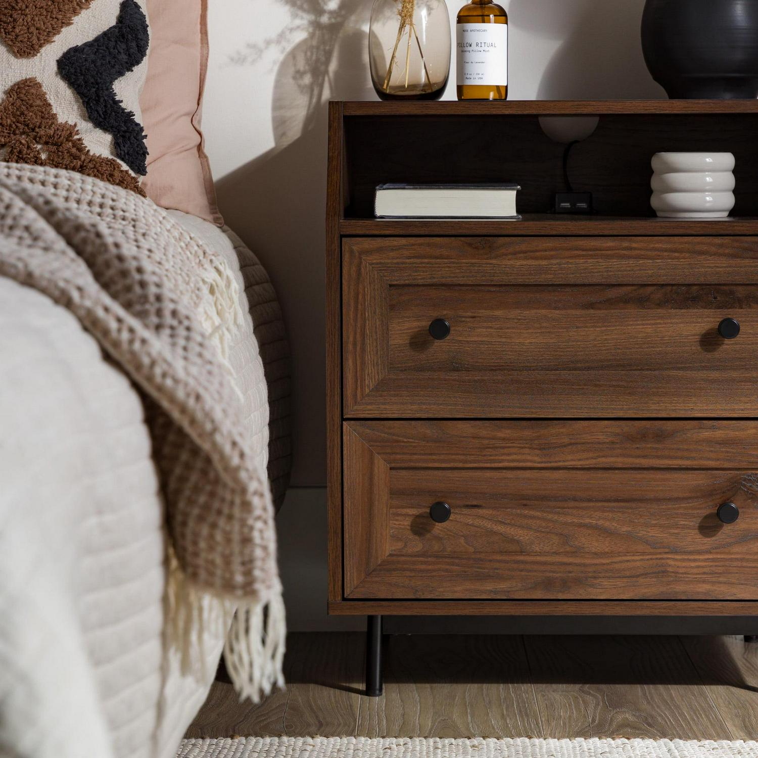 Add some vintage vibes to your bedroom or living room with the Walker Edison Modern 2 Drawer Nightstand with USB Port. Two framed drawers and the curved top cubby create a sophisticated aesthetic to elevate any home decor style. No matter where you place them, the two included USB ports come in handy when your devices need charging. The warp-resistant MDF wood build and attractive metal legs create a contemporary look to fit all your needs.