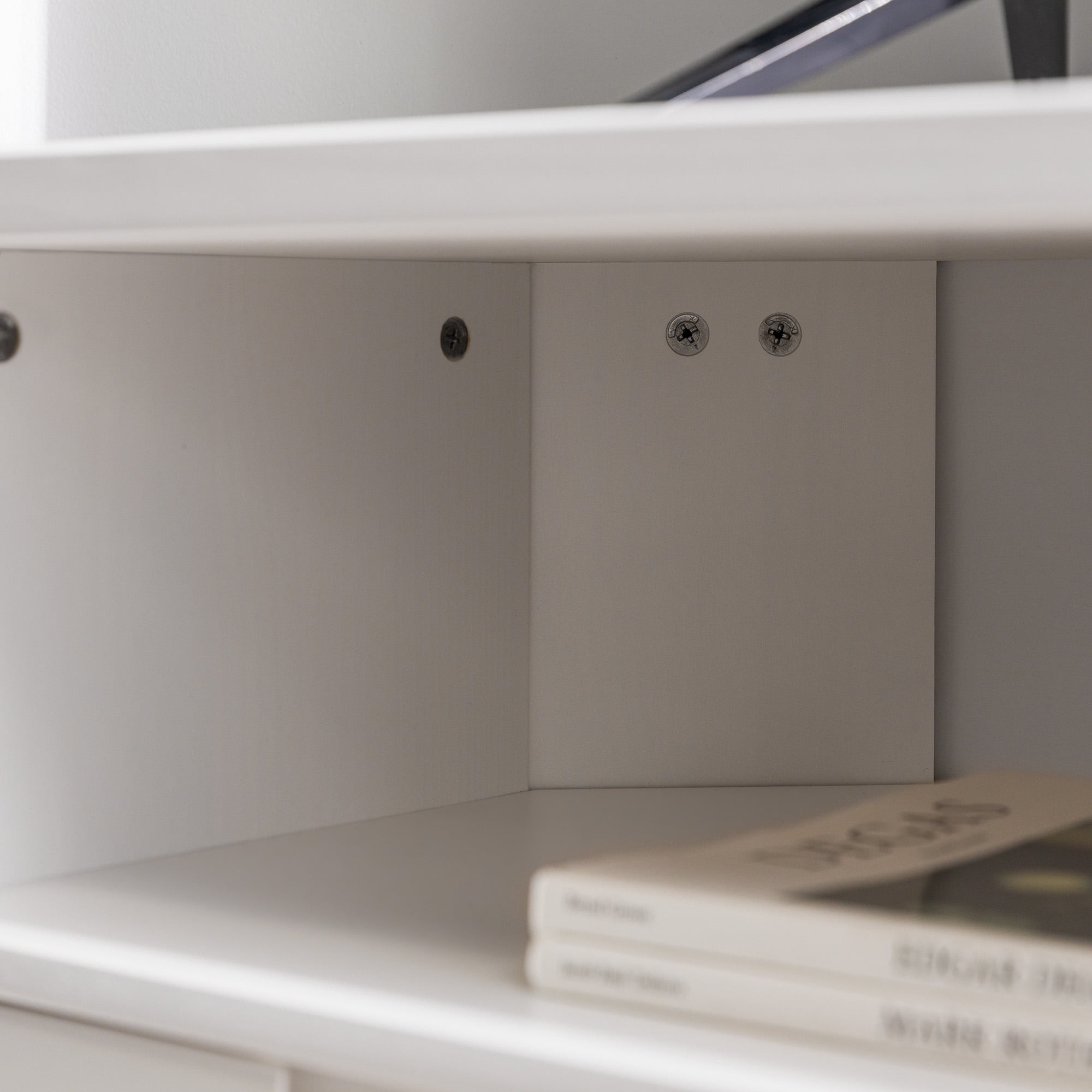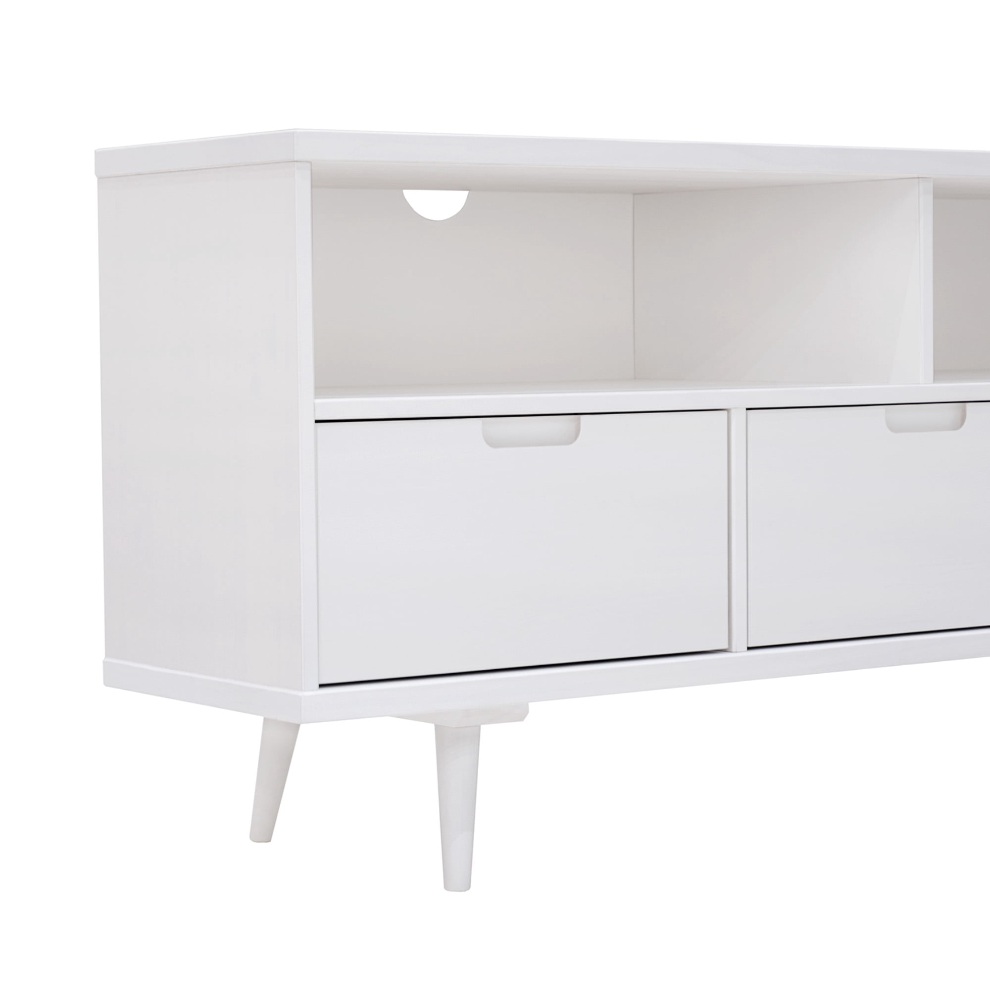 Mid-century modern TV stand White painted finish 3 drawers on telescoping metal slides Angled sides to fit corners easily Cut-out handles for a natural look Choose from three attractive finishes to match your style Solid wood construction Ships ready-to-assemble with step-by-step instructions Assembled Dimensions: 23.5″ H x 52″ L x 25.75″ W Packaged Dimensions: 7.09” H x 55” L x 18.31” W