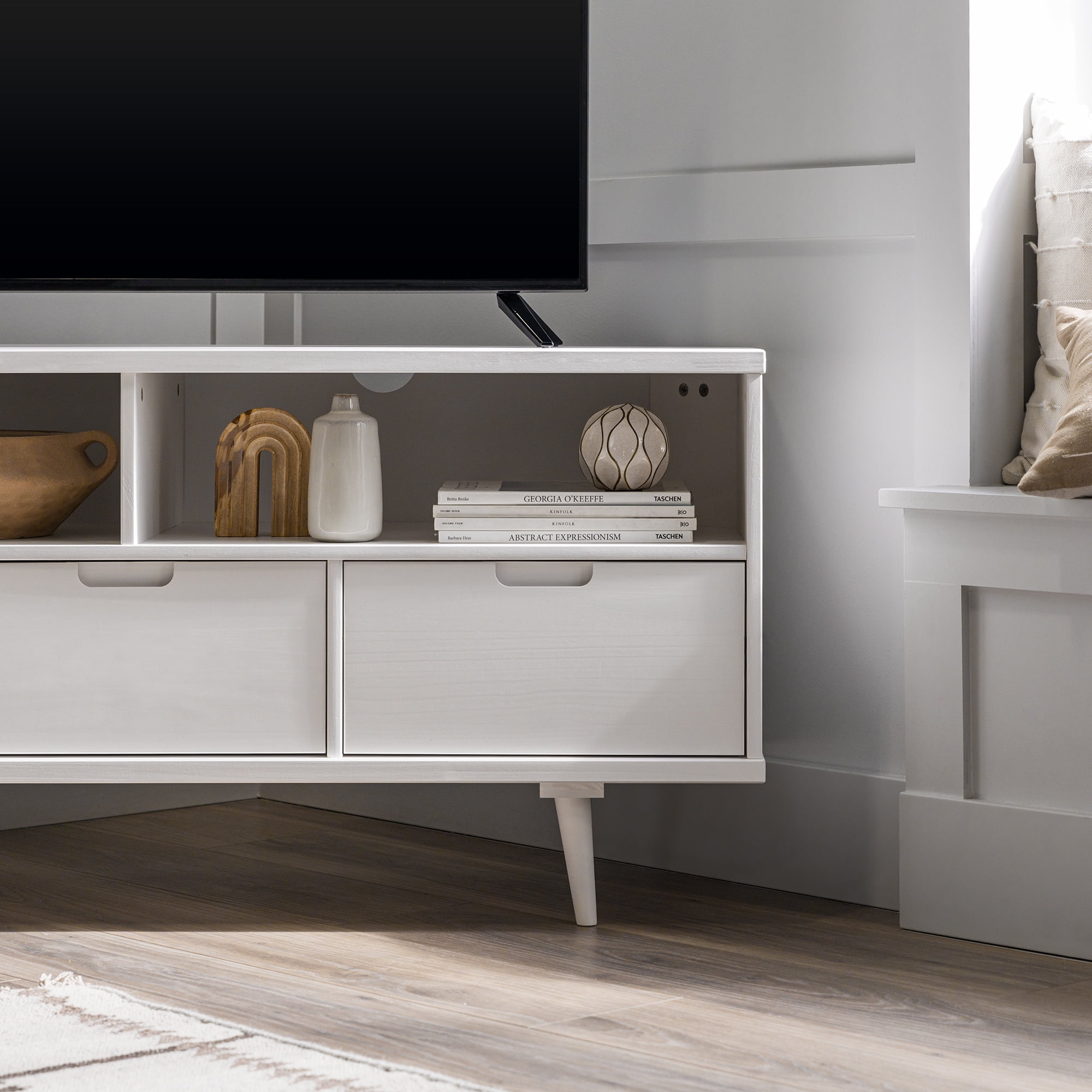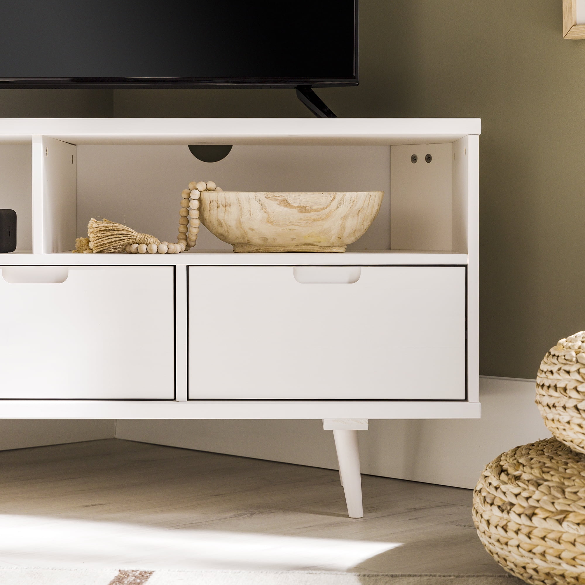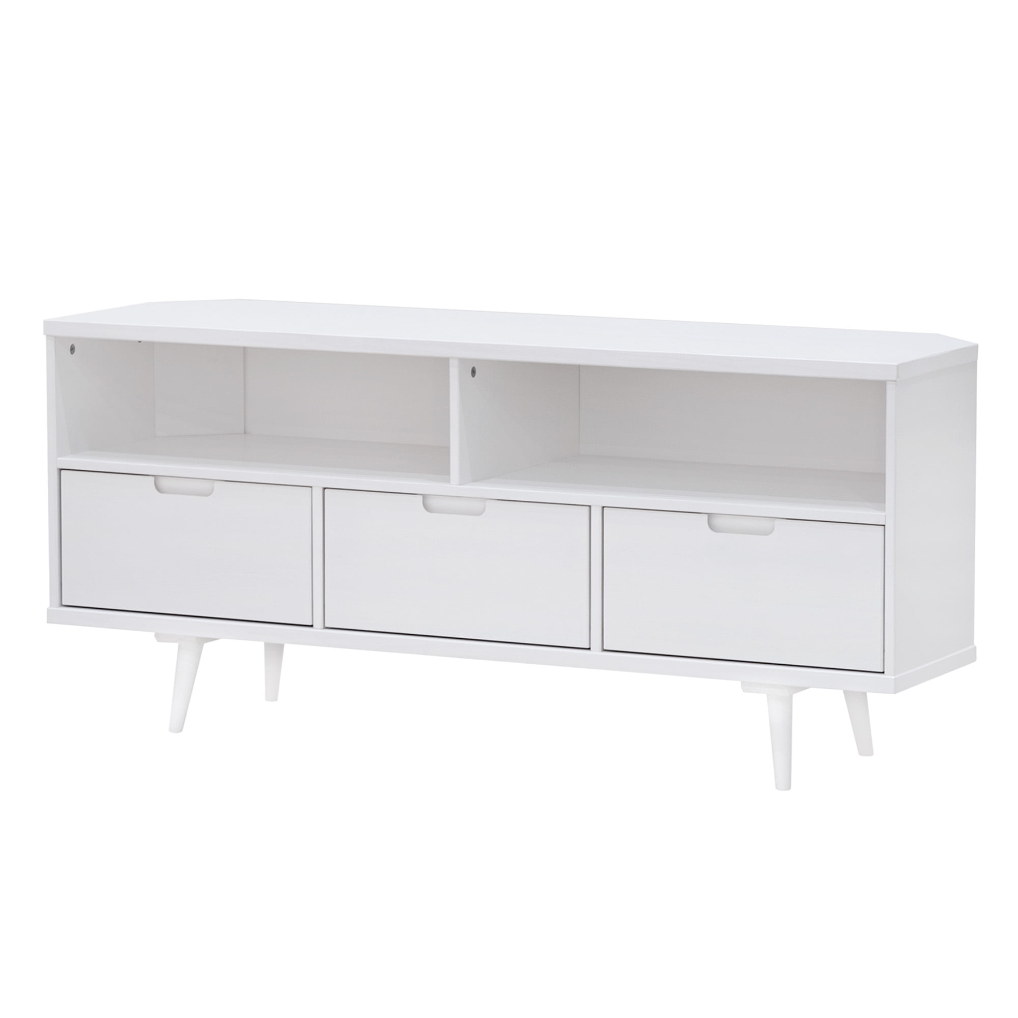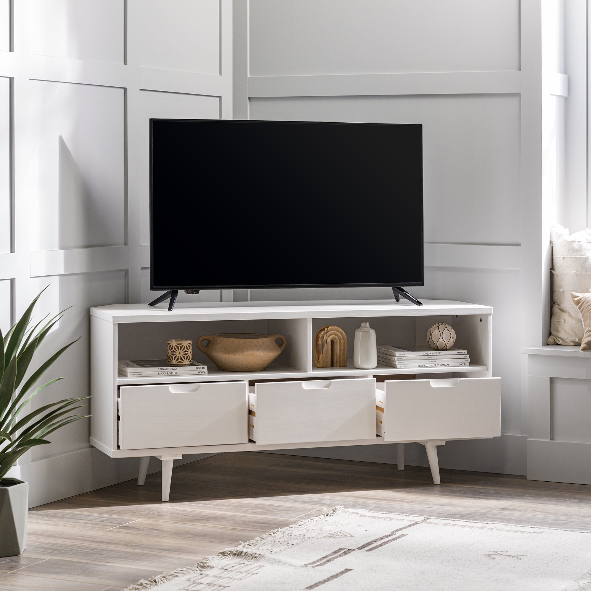 Keep your space organized and in style with the Walker Edison Modern 3-Drawer Solid Wood Corner TV Console. Made from solid pine wood, this TV console is ready to bring a modern vibe to your home. This piece features both open and closed storage, giving you options to tuck belongings out of sight and organize the items you want to put on display. The angled sides enable this console to fit easily into the corner of your office or living room. Choose from three attractive finishes to match your style. This console is for TVs up to 58” inches.