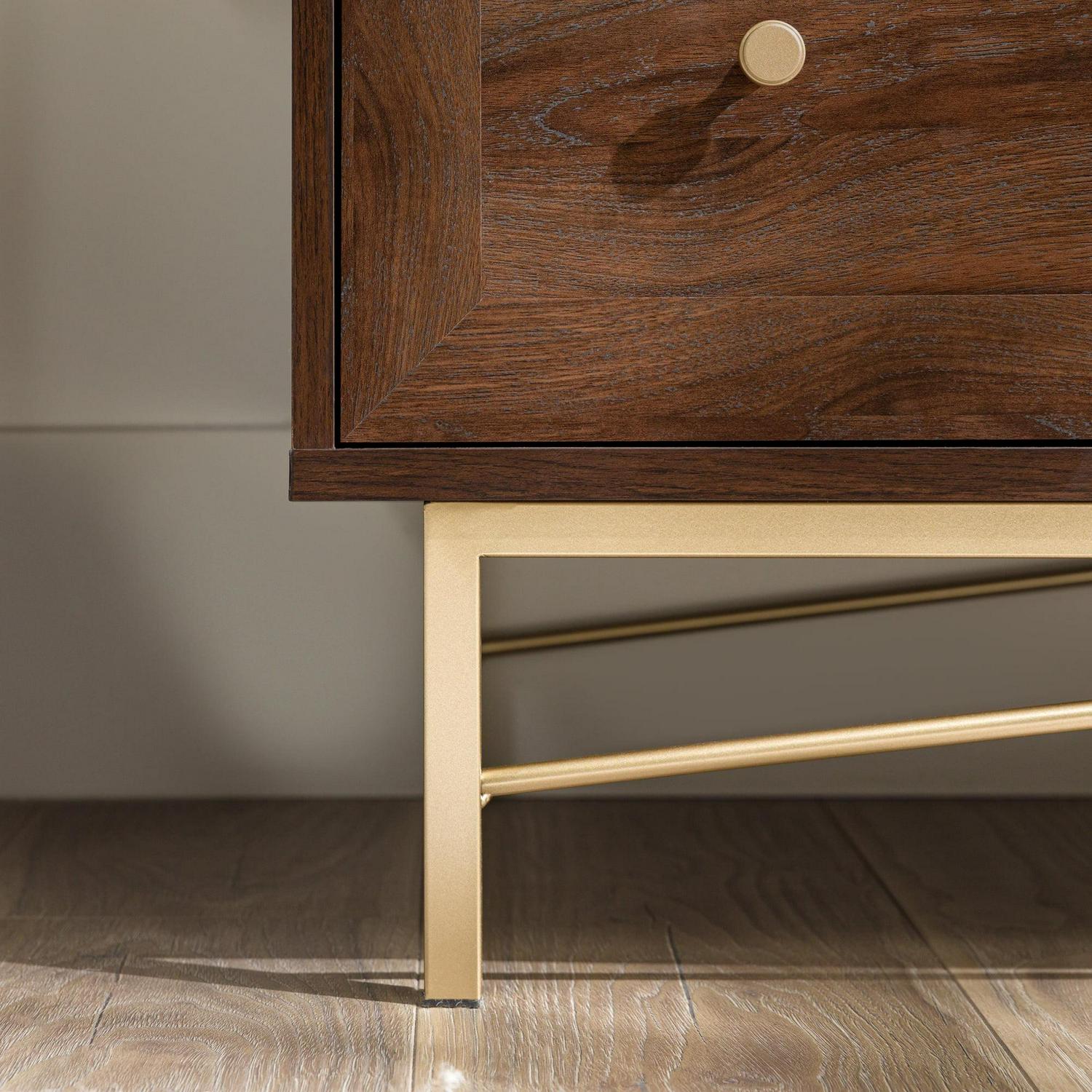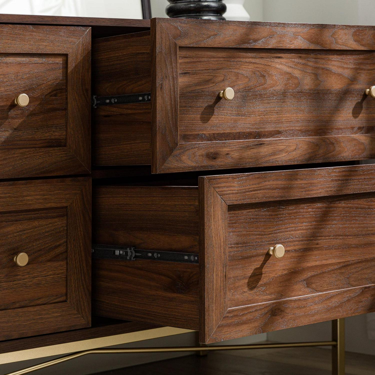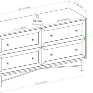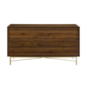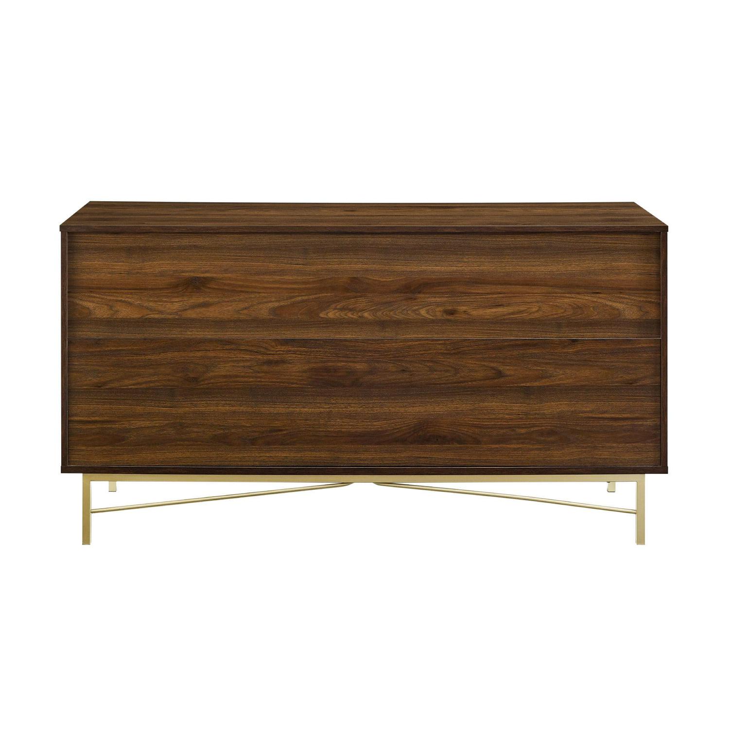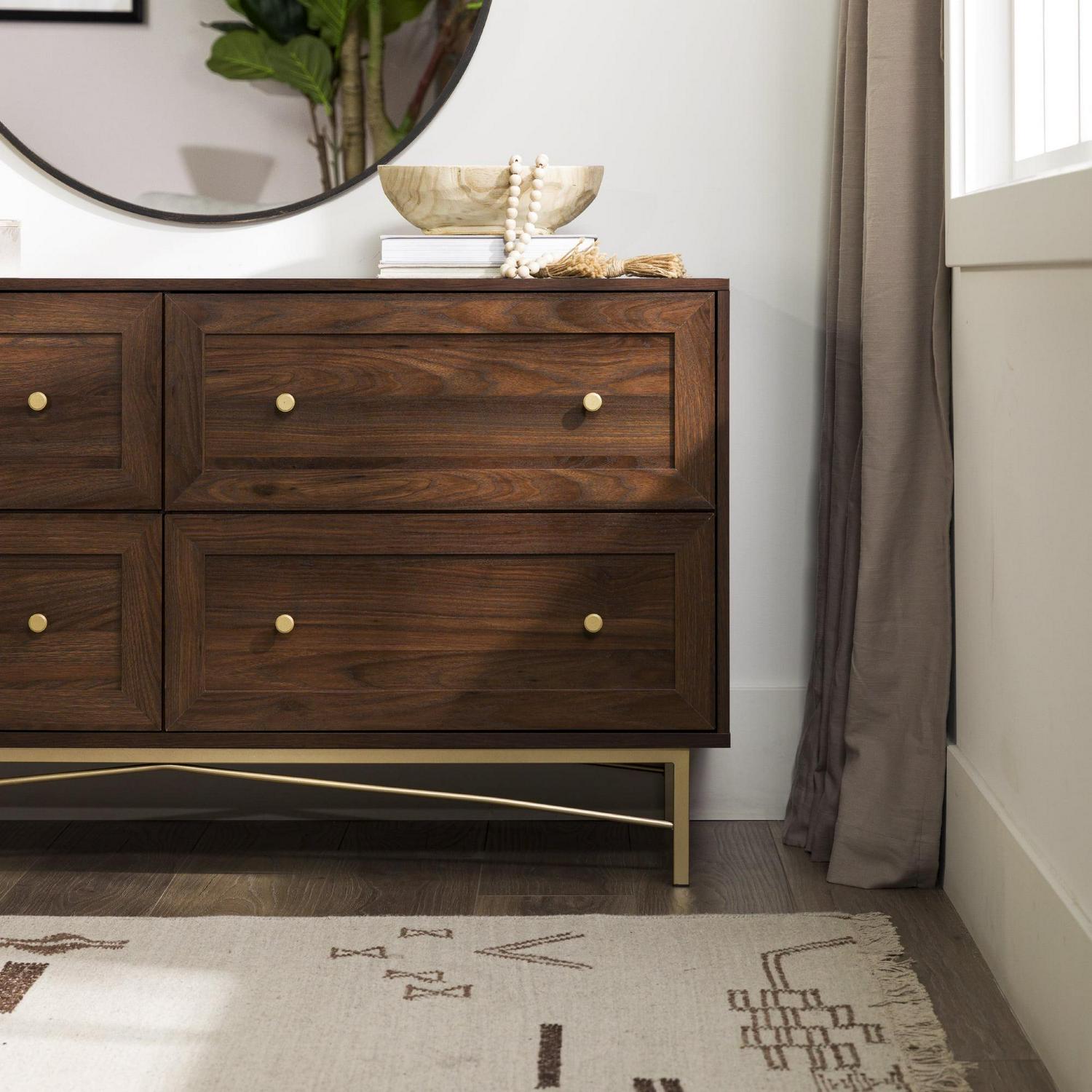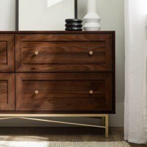 Incorporate the Walker Edison Modern 4 Drawer Dresser into your bedroom or guest room for sophisticated style. The painted gold hardware and eclectic base provide a contemporary look to elevate your private sanctuary. Tuck clothing, jewelry, and other essentials within the four large drawers on telescoping metal glides for easy access whenever you need. Capped feet protect your flooring from scratches. The warp-resistant MDF wood, durable laminate, and powder-coated steel build is made to last in your forever home or first apartment. Pair with the matching nightstand for a full set.