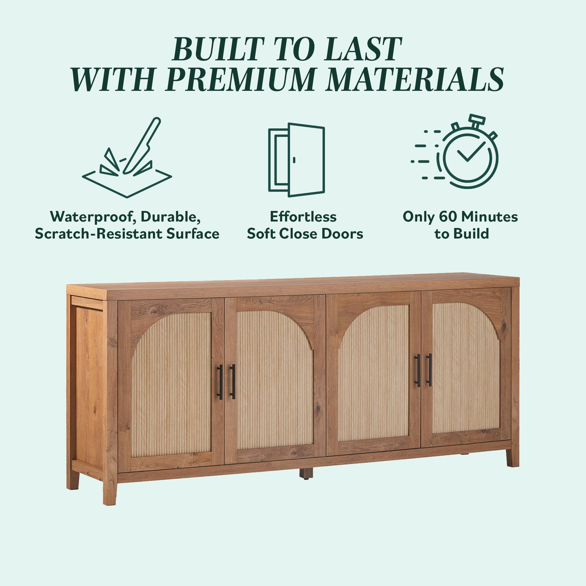 Dine like your favorite influencer with the Walker Edison Modern 70″ Reeded Sideboard with Arch Doors. A piece that’s as pretty as it is functional, this sideboard is ready for storing your dishes, linens, media devices, books, and more. It’s the perfect way to finish off a kitchen or dining area, adding interest with on-trend arched doors and reeded inset panels. The warp-resistent MDF and durable laminate materials ensure your sideboard stands up to everyday use, so you can confidently load shelves and style the spacious surface. Another perk is the cord management cutouts that allow you to discreetly hide away chargers, cables, and more so you get a high-end look that doesn’t sacrifice convenience.
