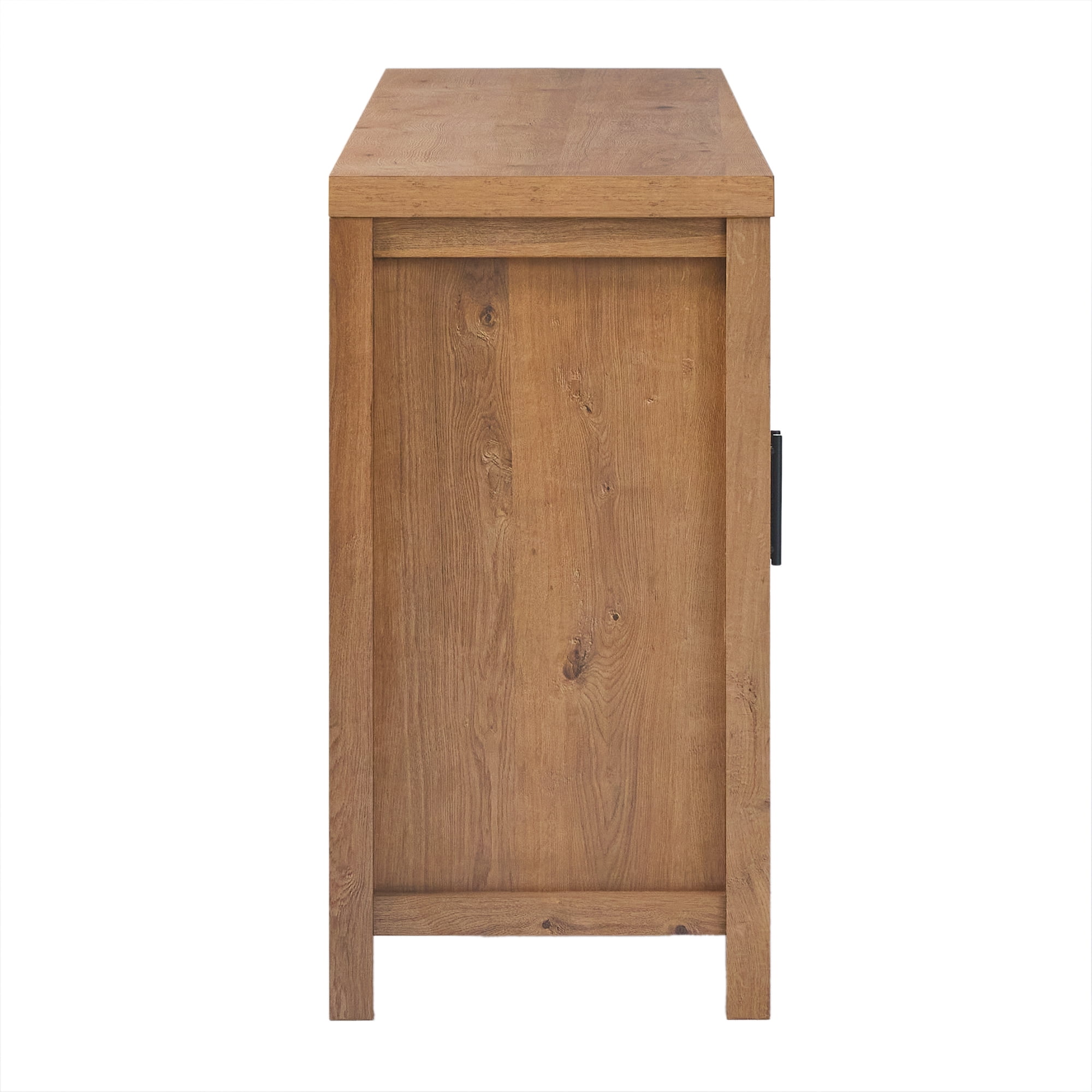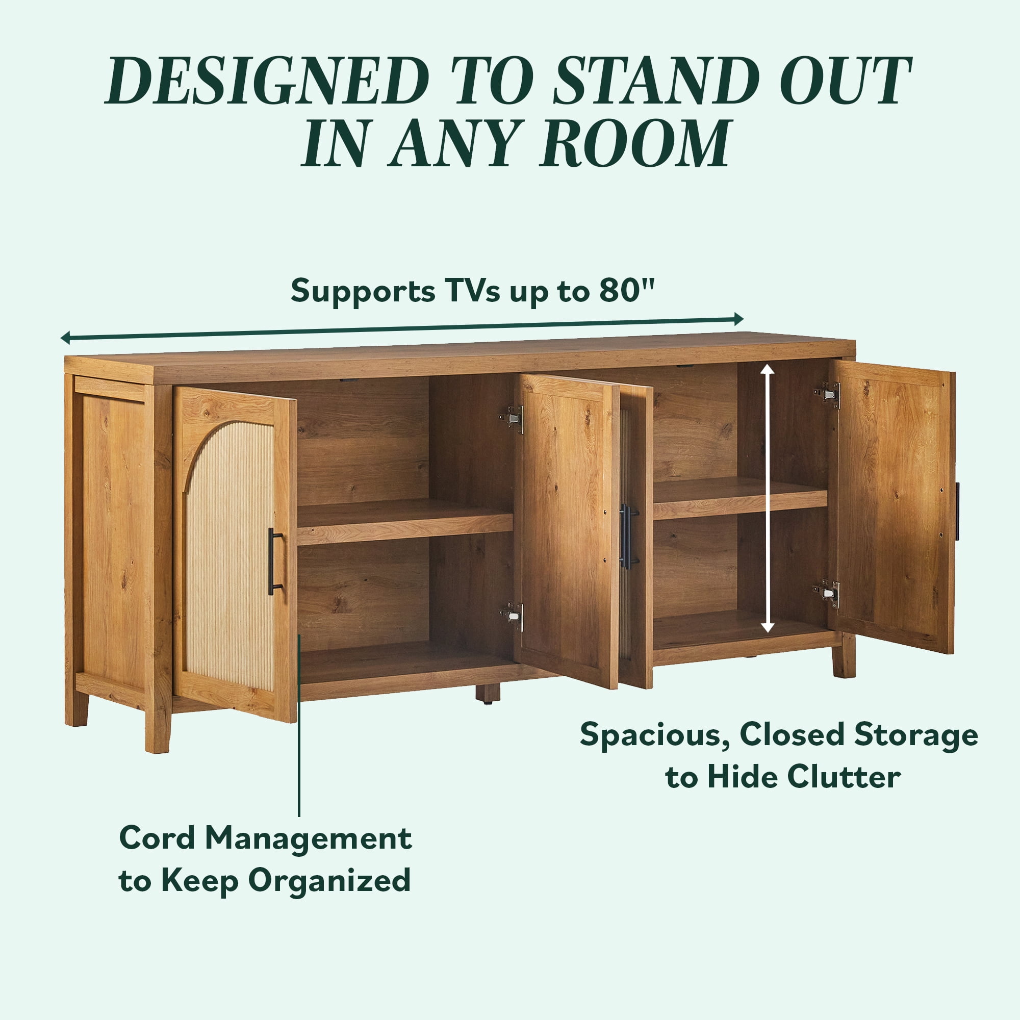 Clean, modern-inspired design style English oak finish On-trend arched doors Reeded inset adds interest Convenient cord management cutout Made warp-resistant MDF and laminate Ships ready-to-assemble with step-by-step instructions Assembled dimensions 28 ½” H x 70” L x 15 ¾” W Packaged dimensions 8.66” H x 75.98” L x 20.07” W