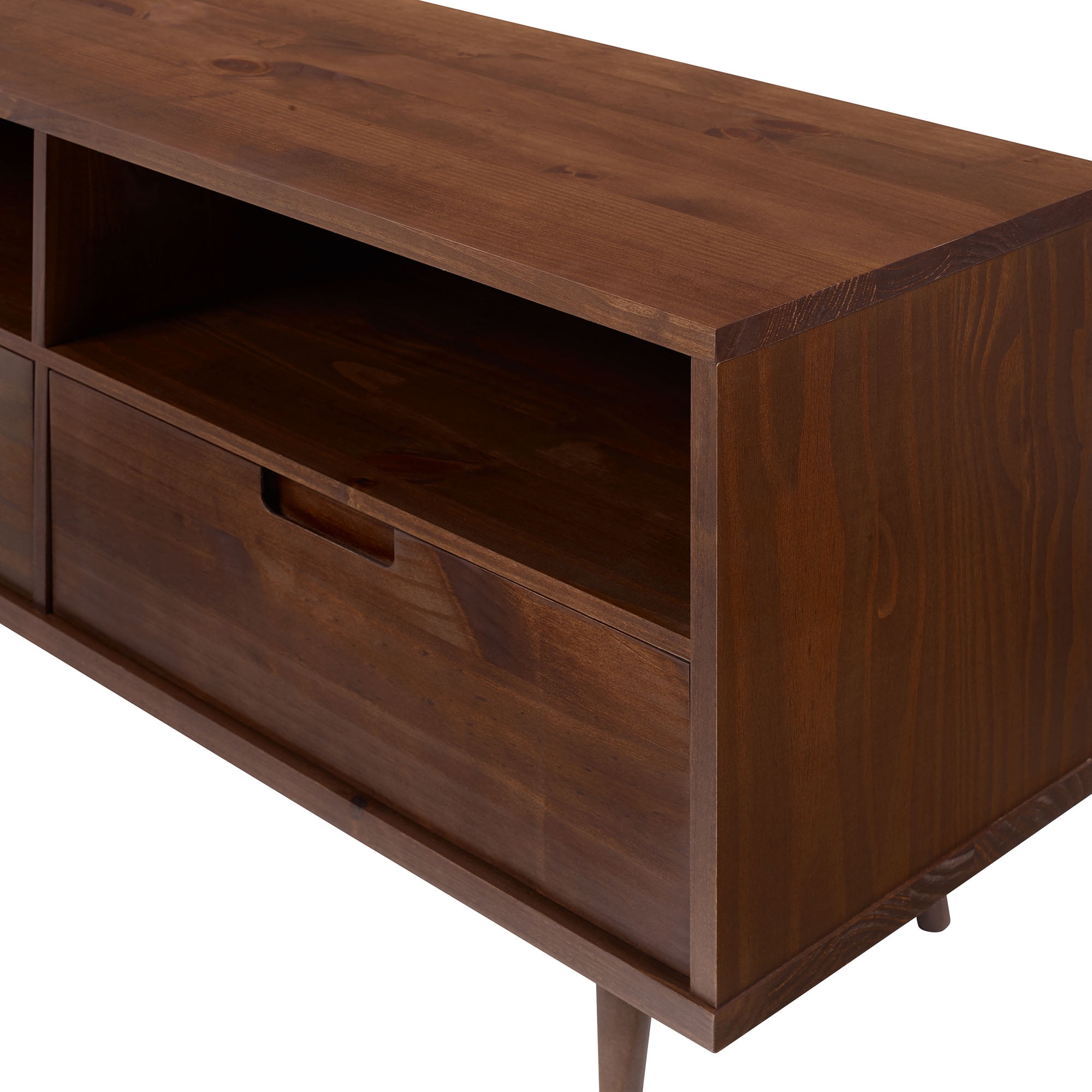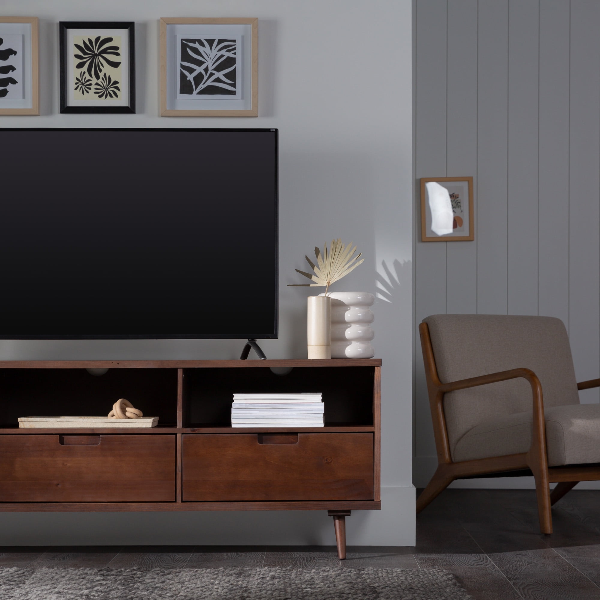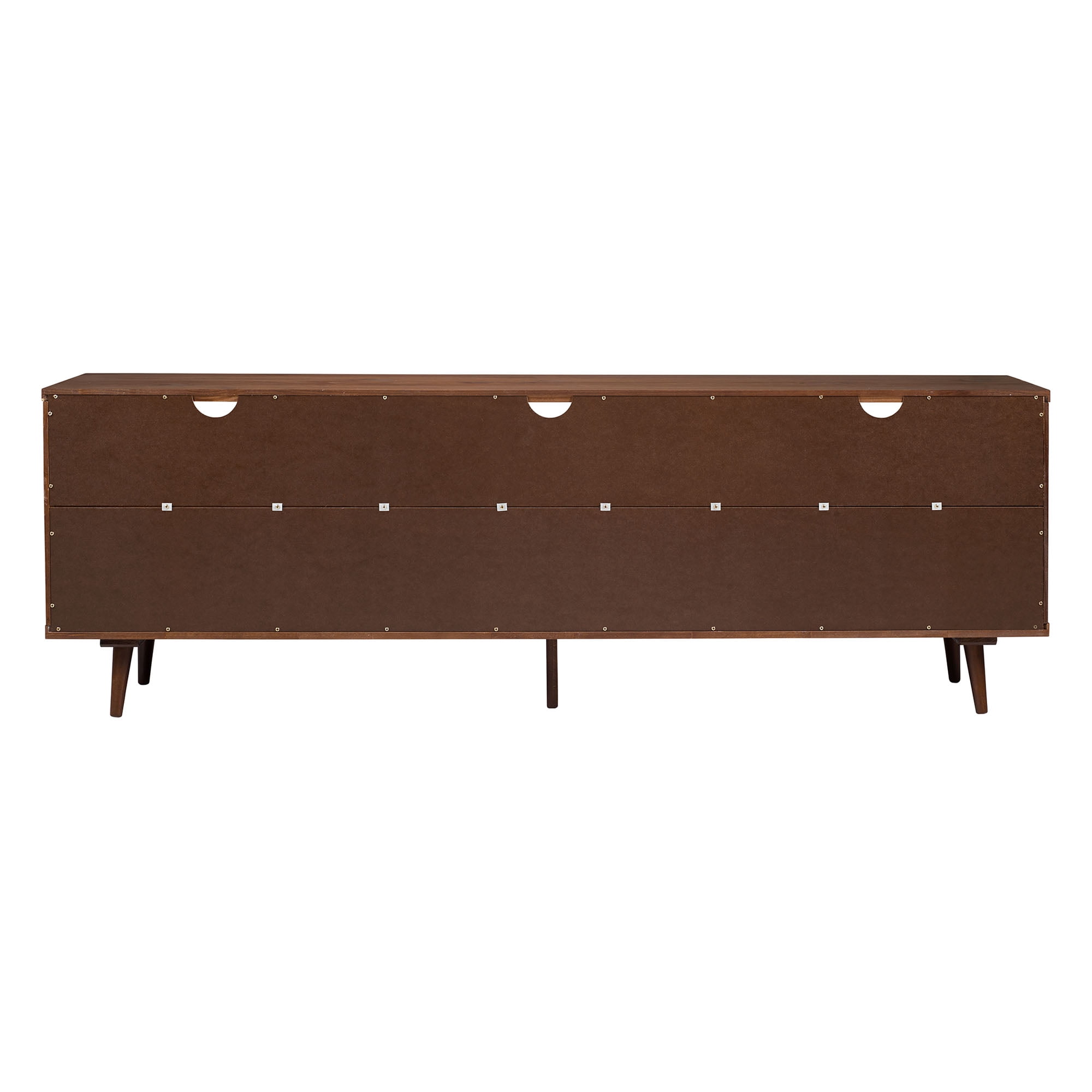Boho, mid-century modern style Walnut finish 3 drawers on smooth wood glides Attractive, tapered angled legs 3 open storage cubbies for display space 3 cord management holes keep cables tidy Accommodates TVs up to 80 inches Warp-resistant MDF back panel and drawer bottoms Made from solid wood responsibly harvested from renewable forests Ships ready-to-assemble with step-by-step instructions Assembled dimensions: 23.5” H x 70.75” L x 15.75” W Shipping dimensions: 6” H x 80” L x 19” W