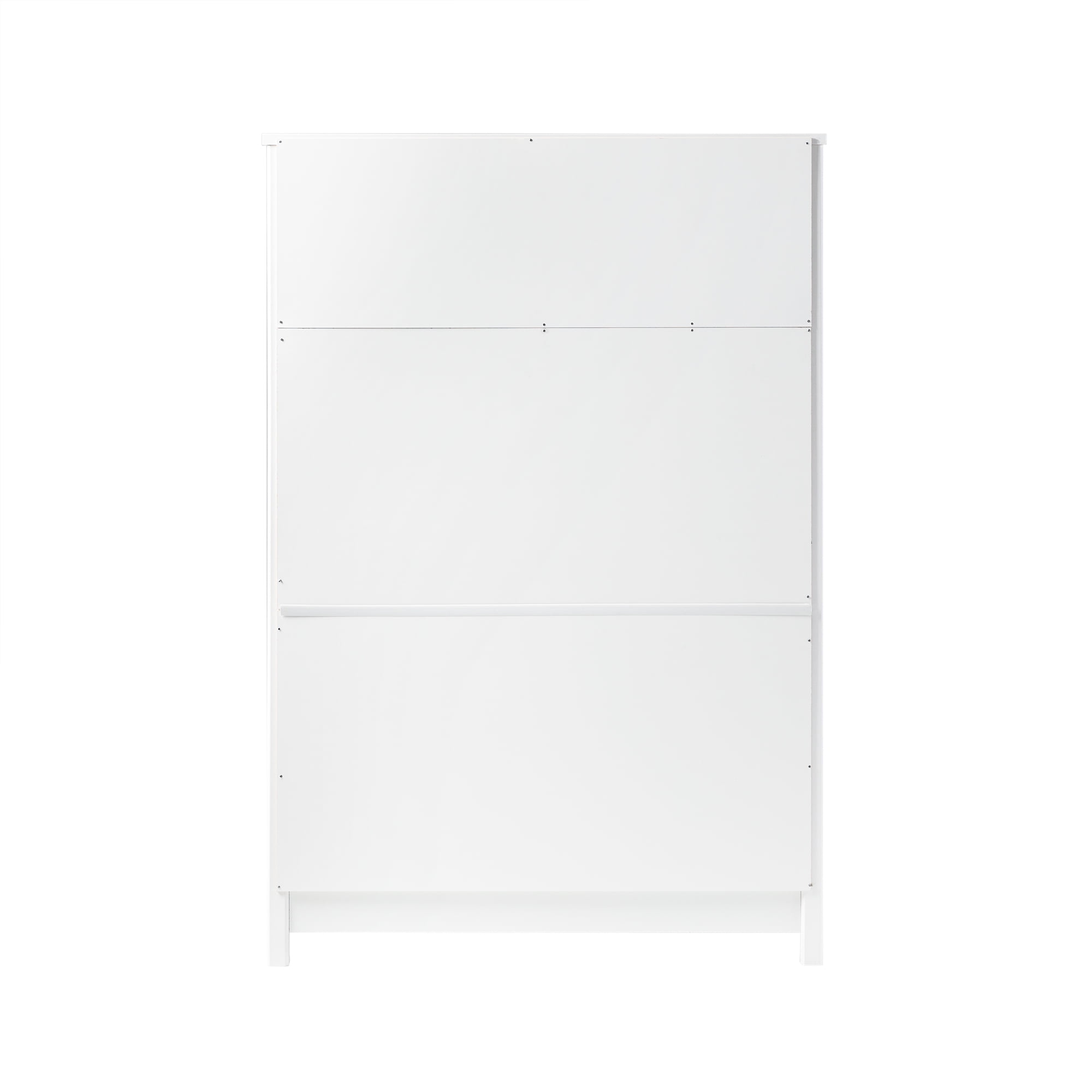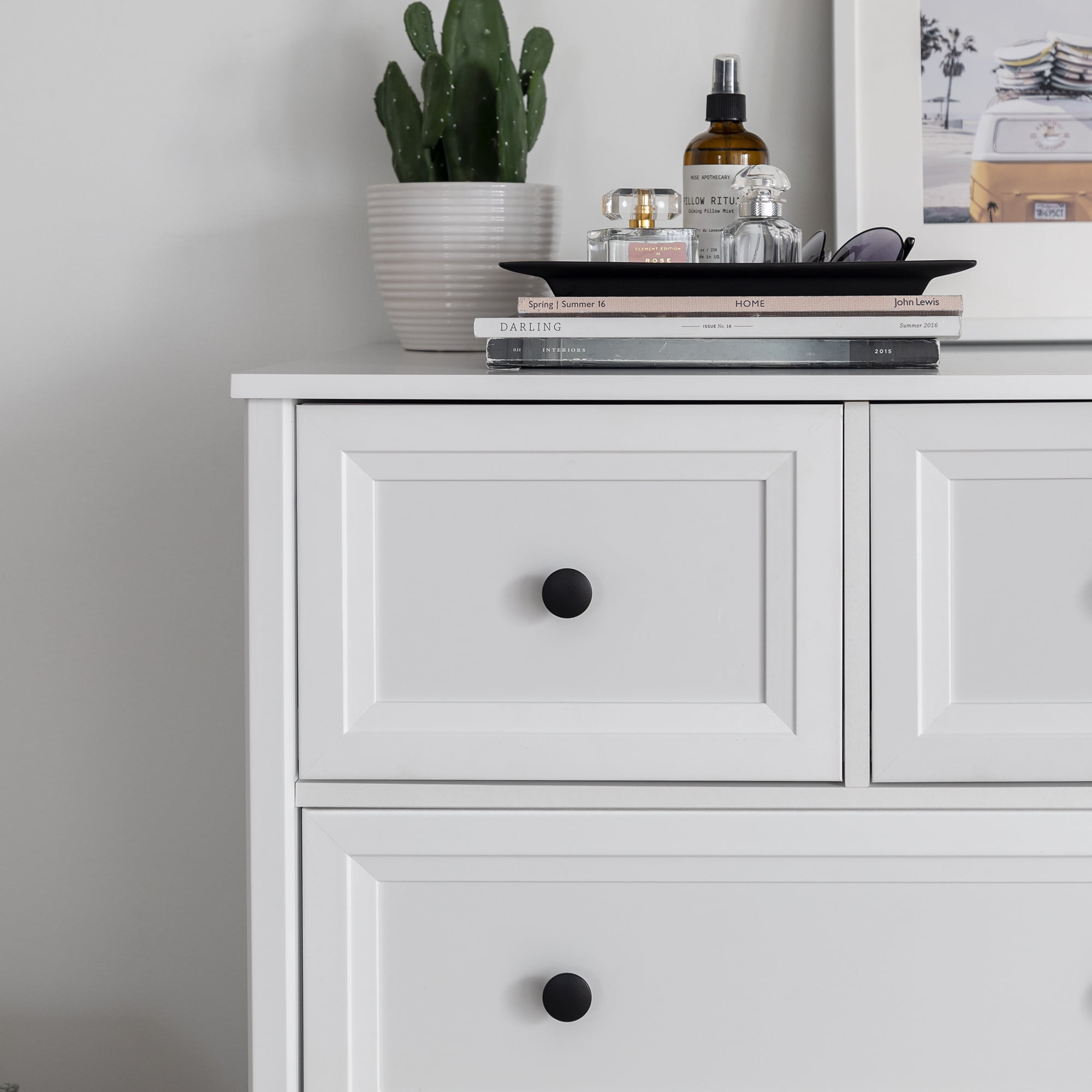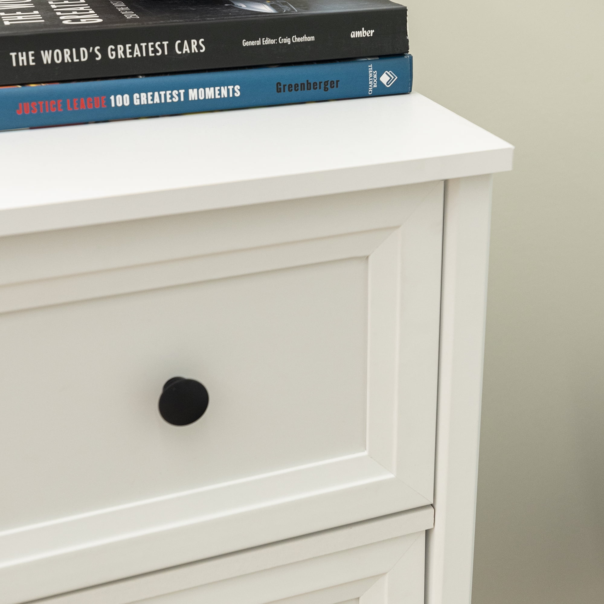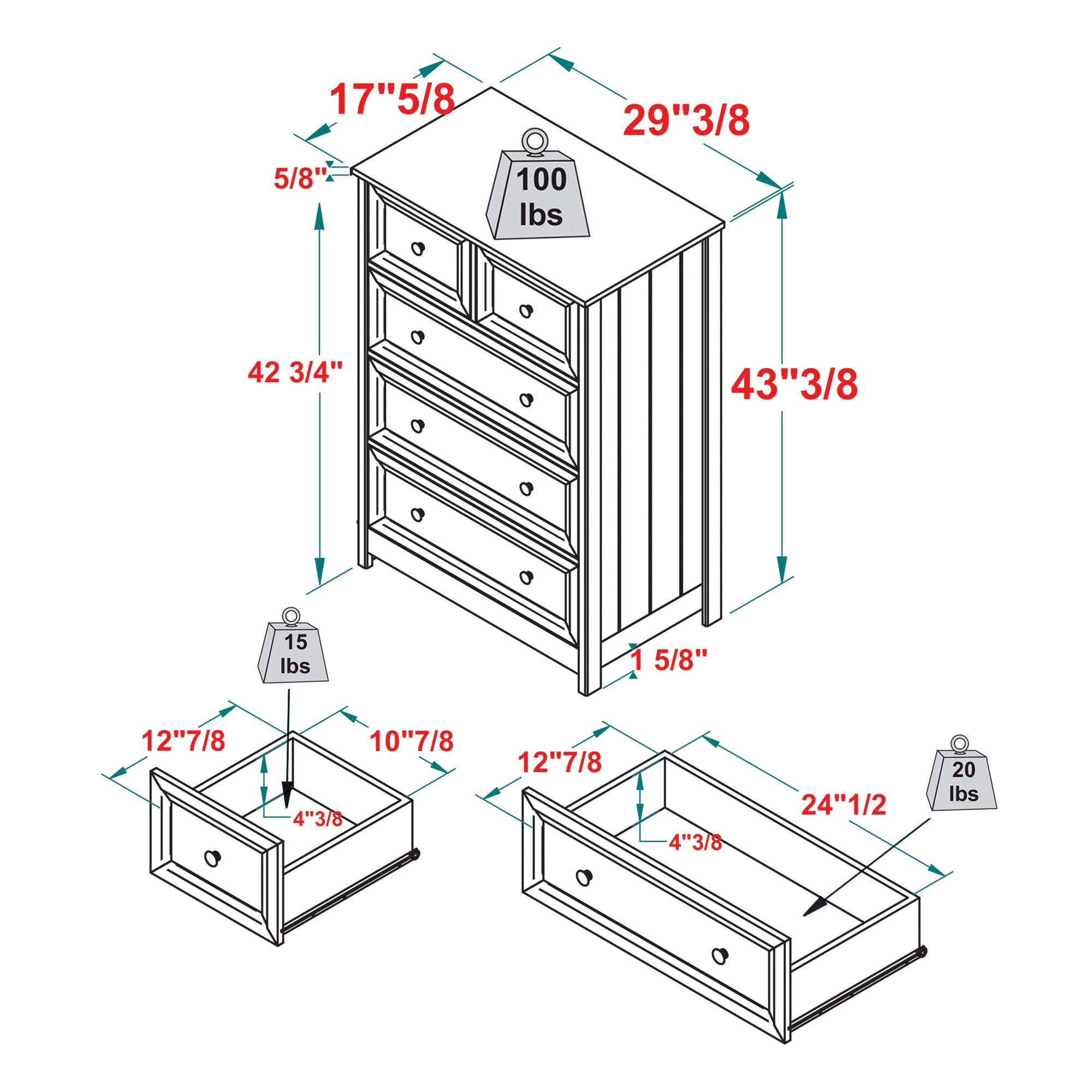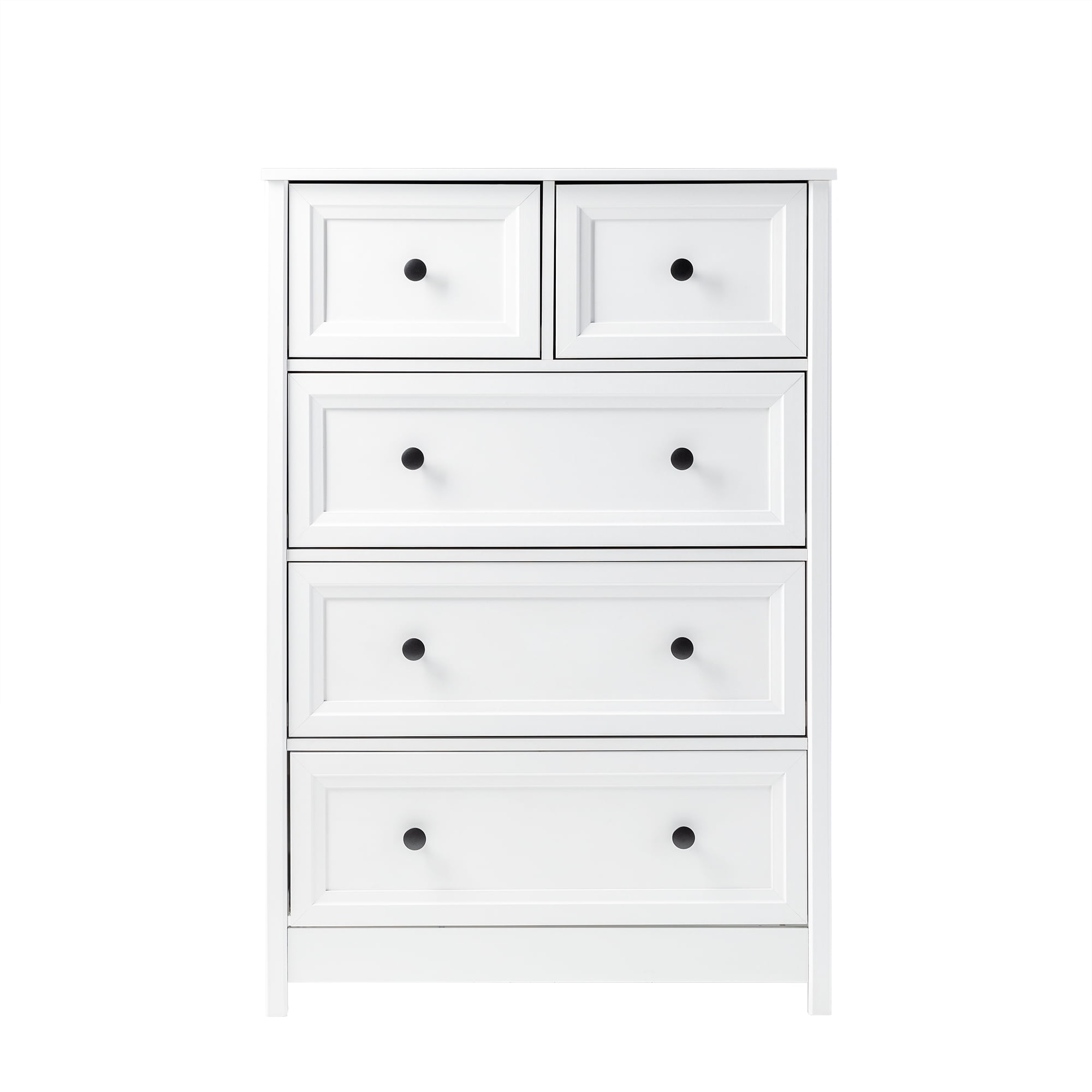 Modern, farmhouse style White finish 5 spacious drawers Grooved side panels Smooth drawer runners Minimalistic metal hardware Made from warp-resistant MDF wood, durable laminate, and powder-coated steel Assembled Dimensions: 43” H x 29” L x 18” W Packaged Dimensions: 8” H x 47” L x 20” W