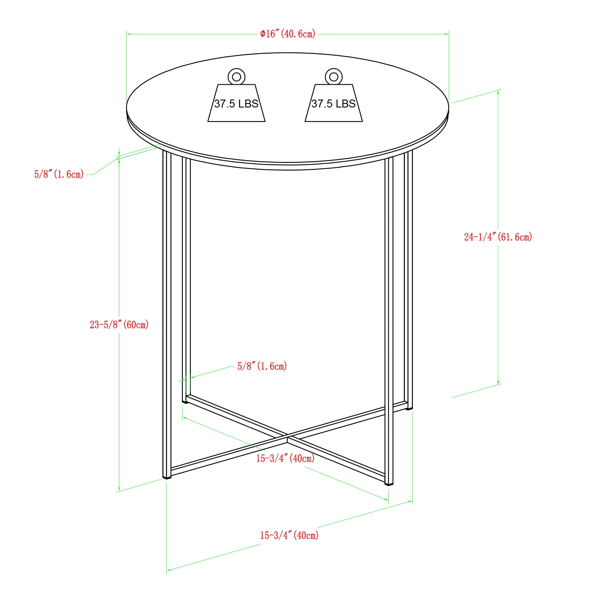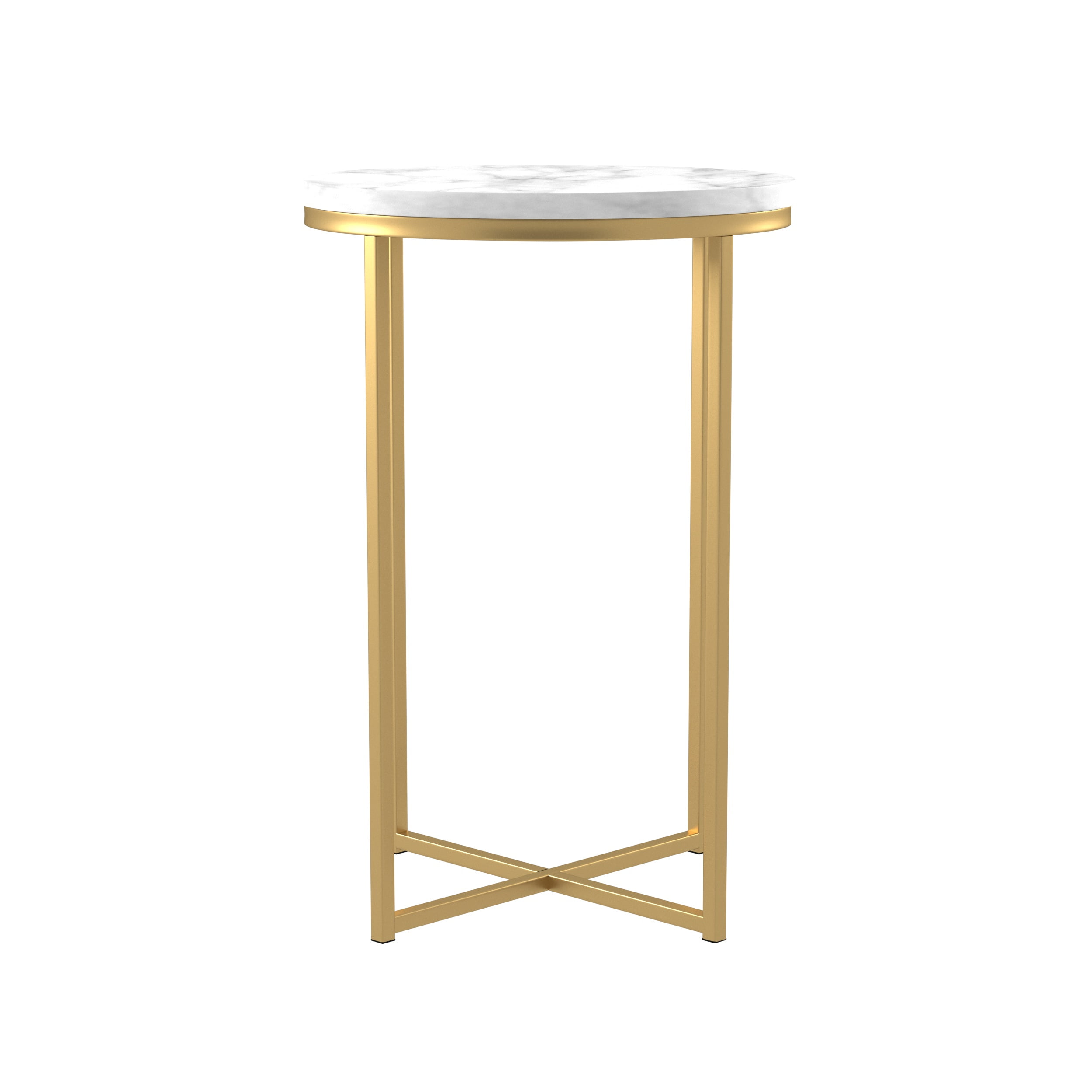 Packaged dimensions: 4″ H x 27″ L x 20″ W Assembled Dimensions: 24” H x 16” L x 16” W Materials: High-quality MDF, durable laminate, and painted metal Assembly: Some assembly required Faux marble tabletop and gold leg finish Modern glam style side table X-base for stability Round tabletop and base