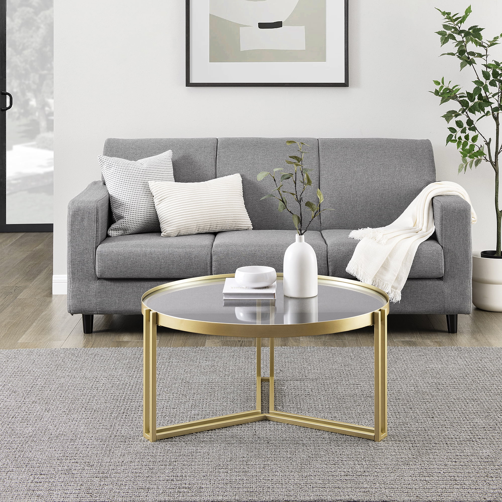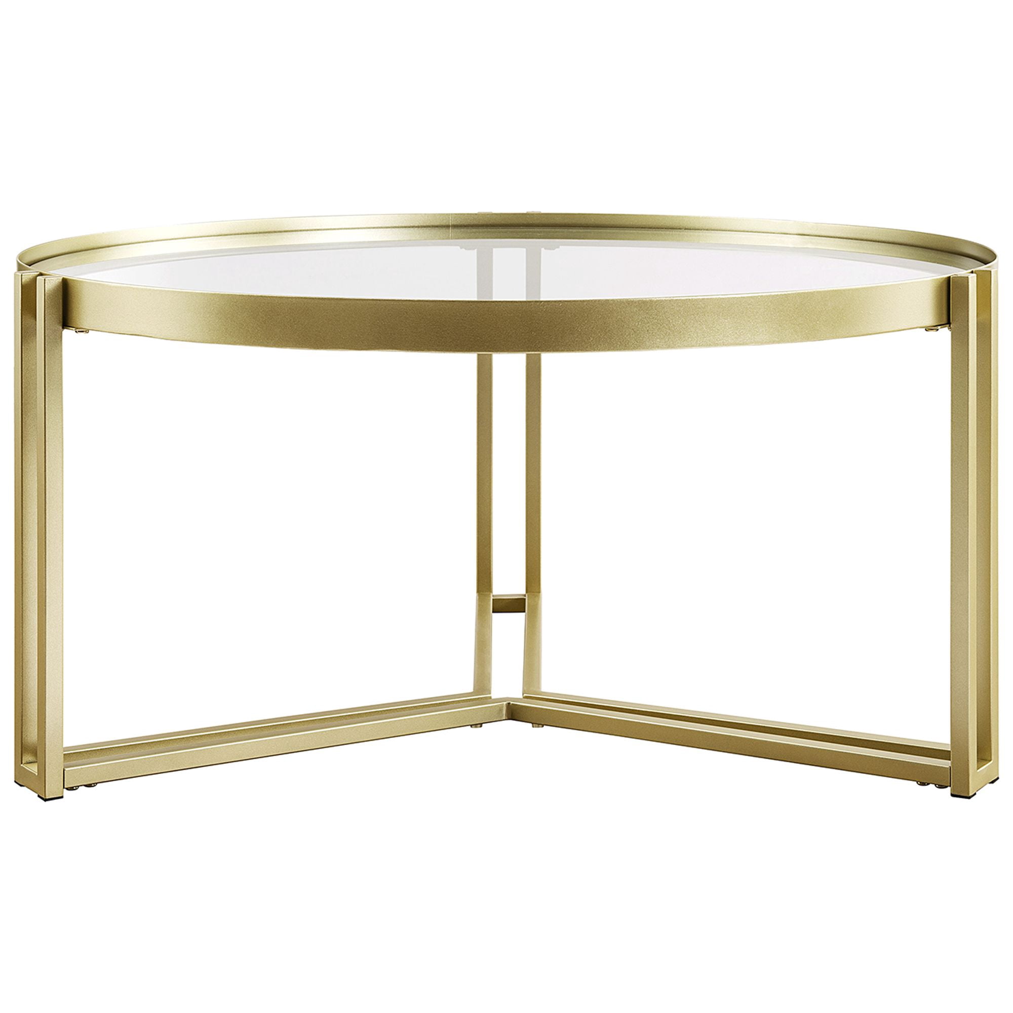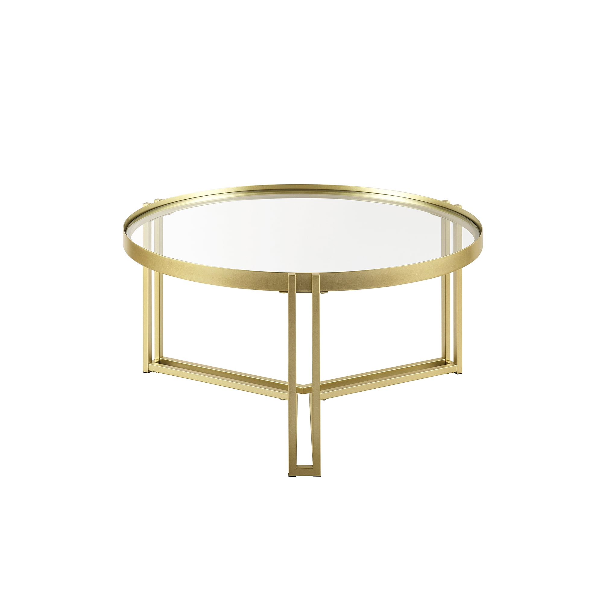 Give your living room an elevated look with this Walker Edison Modern Glam Round Glass Coffee Table. With its stylish gold and glass finishes, this table will stand out as a beautiful focal point in your room. The round tabletop is perfect for displaying your favorite home décor pieces or to rest a glass of wine as you binge your favorite romcom. The Y-shaped metal base adds a touch of glamour to the piece while providing sturdy support. This table is made from painted metal and tempered safety glass, making it durable and eye-catching.