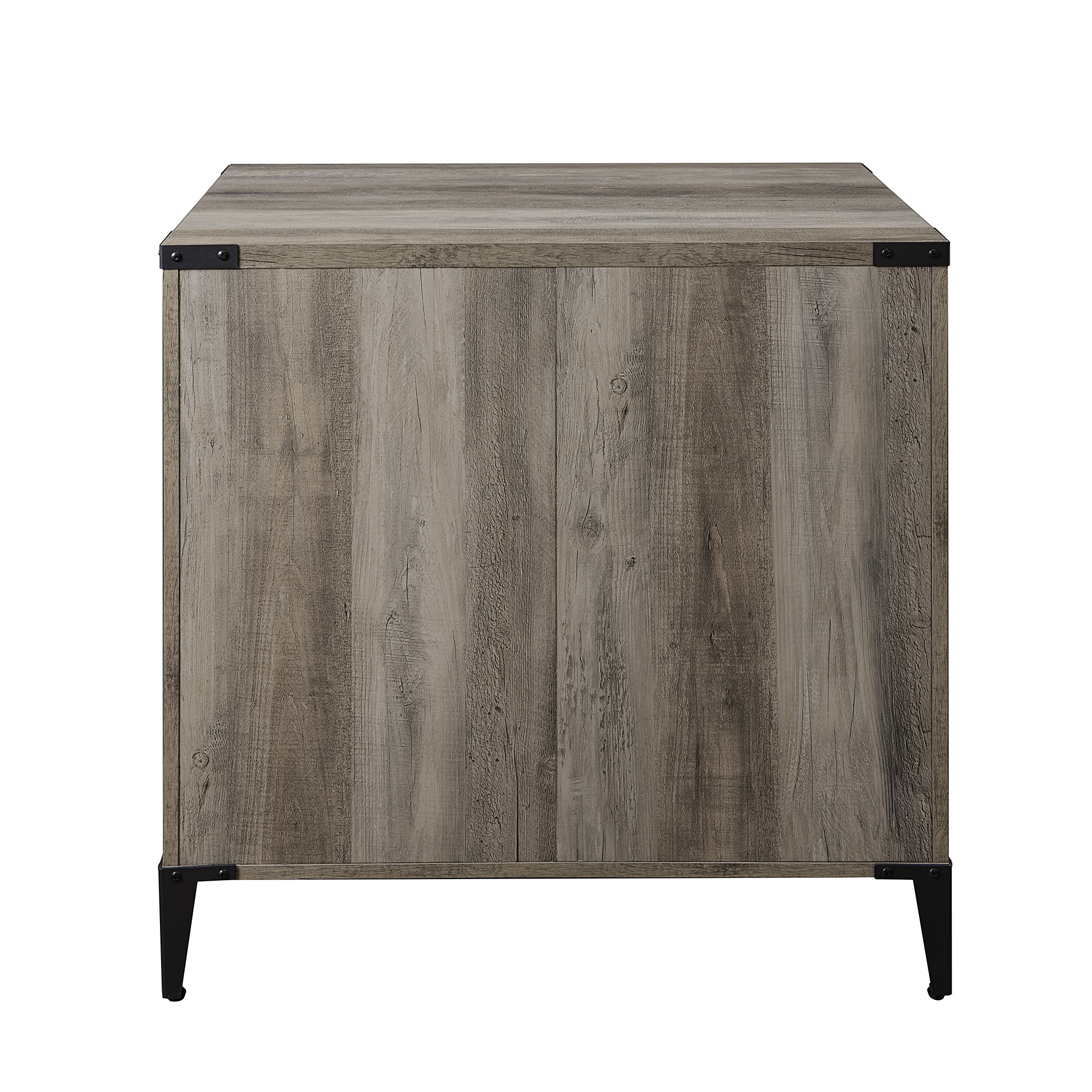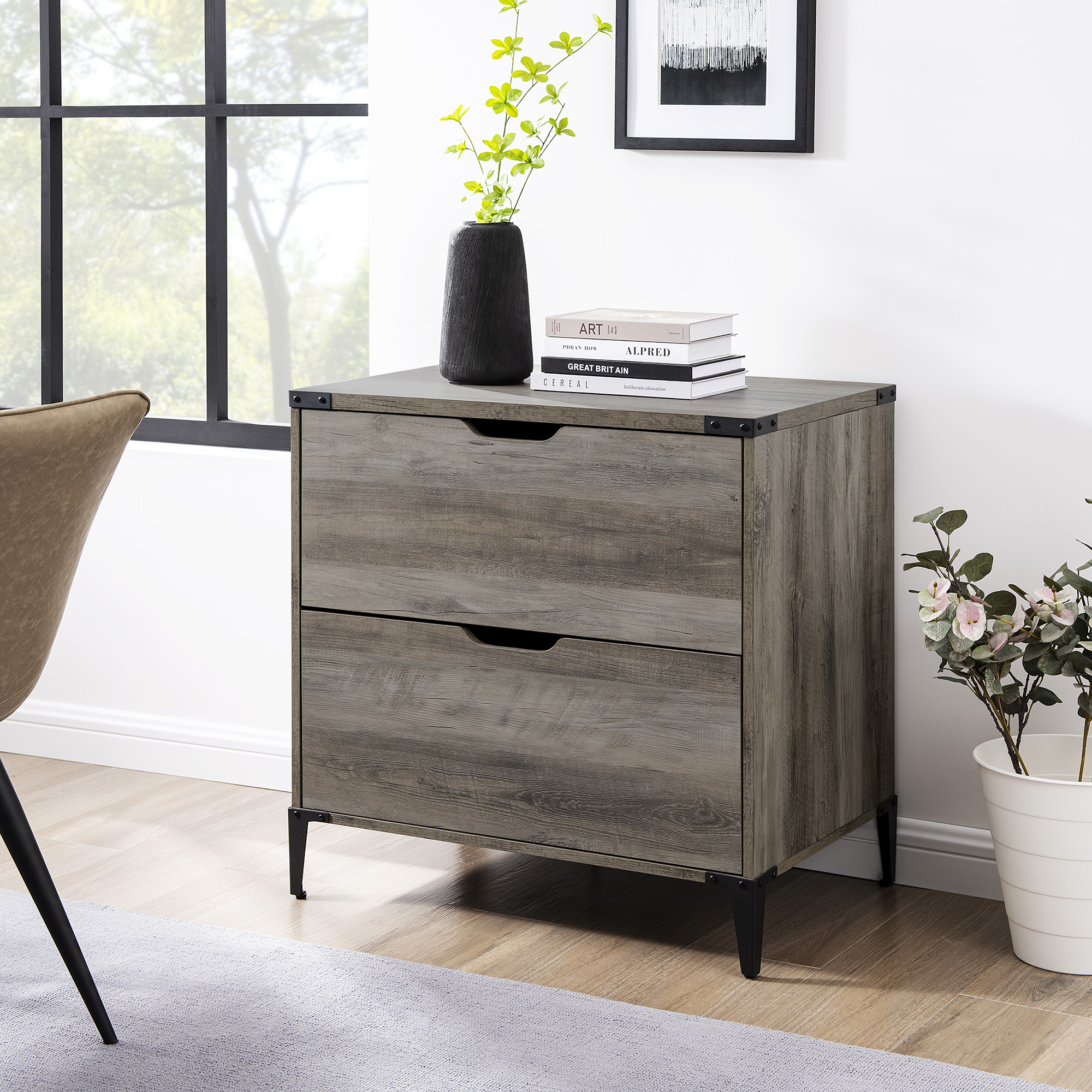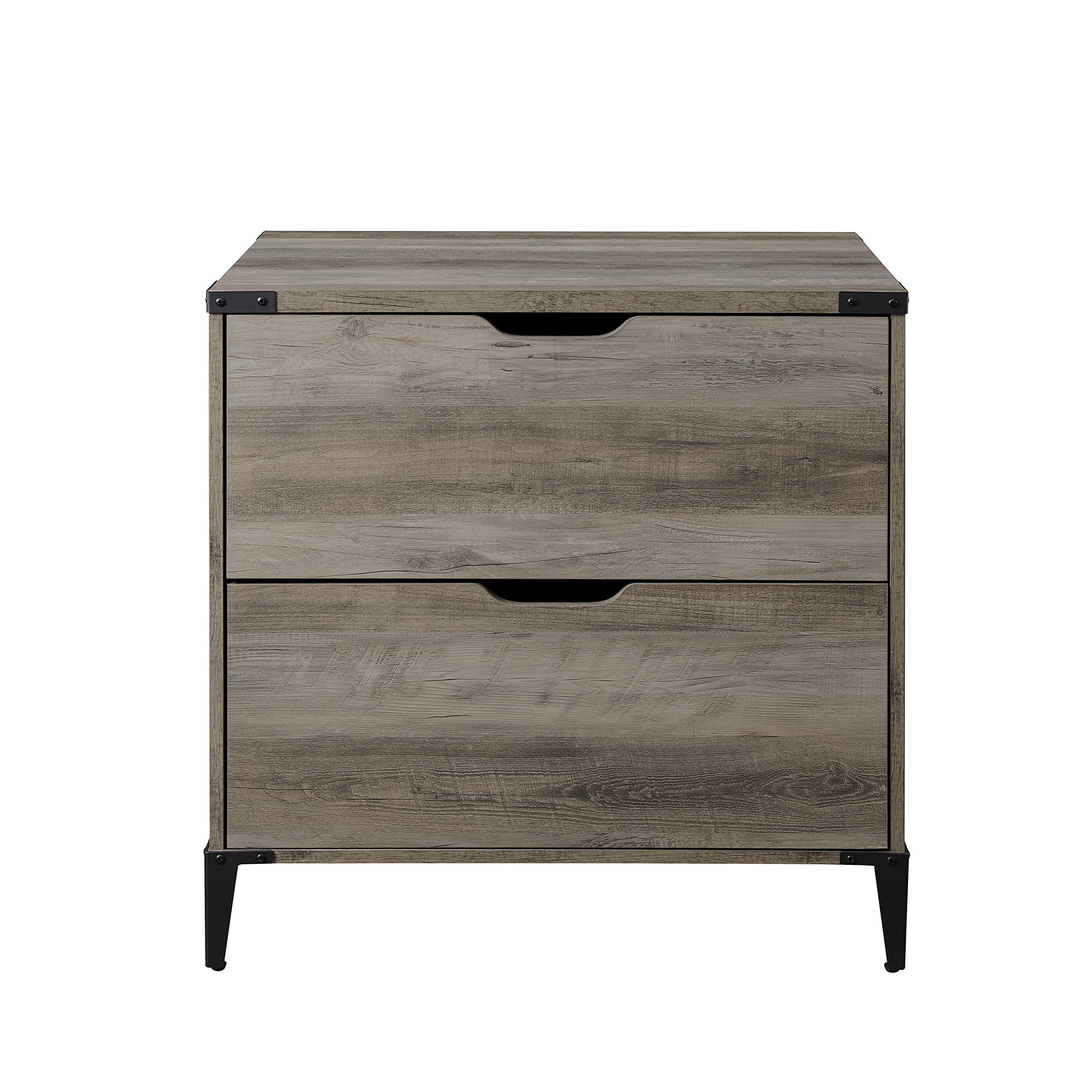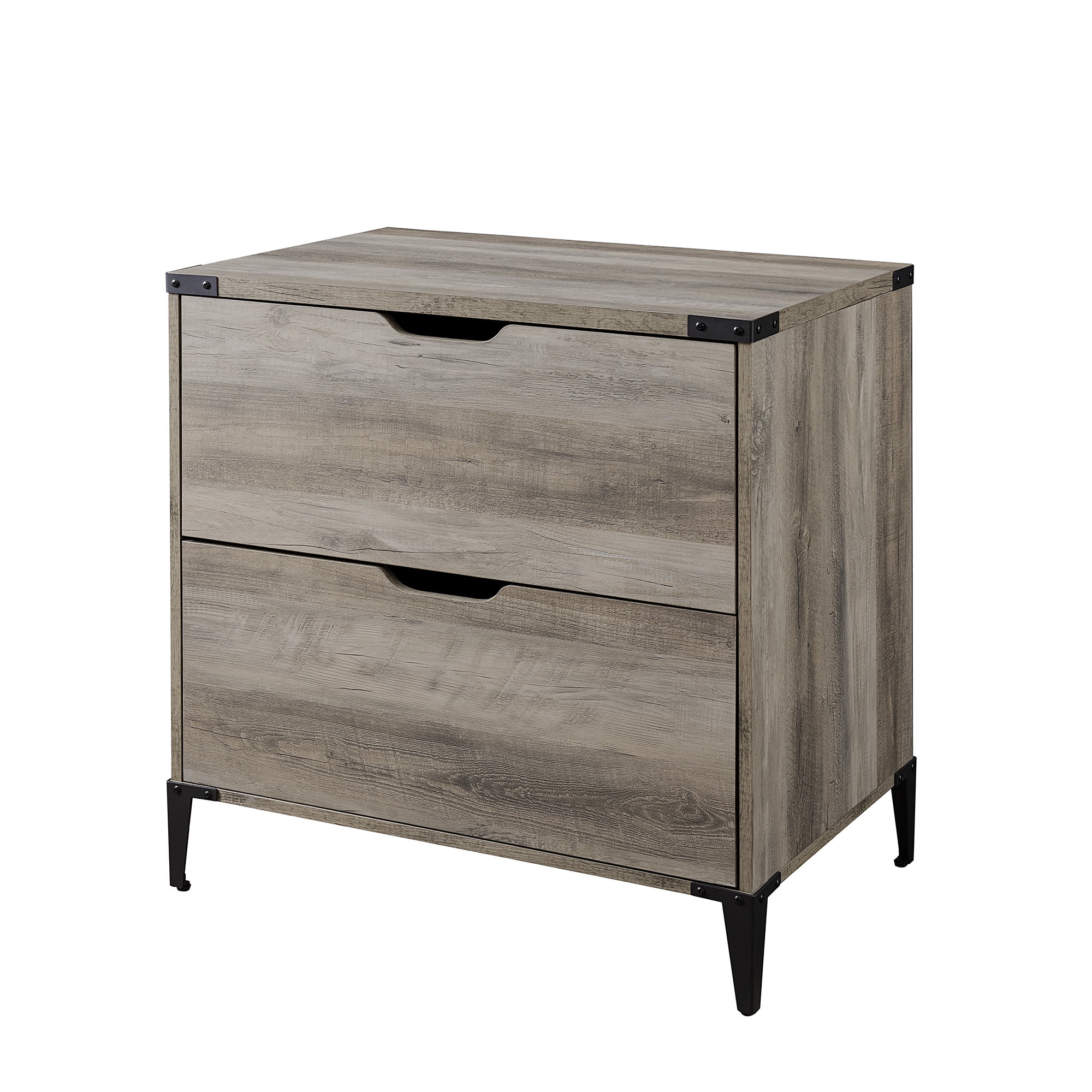 Urban industrial style Grey wash finish 2 drawers with attractive cutout handles Modern angle-iron legs Rustic top corner brackets File hanging hardware for both regular and legal-sized files Smooth, telescoping metal drawer glides Adjustable feet stabilize the piece Made from warp-resistant MDF wood, durable laminate, and powder-coated steel Ships ready-to-assemble with step-by-step instructions Assembled Dimensions: 30” H x 30” L x 20” W Packaged Dimensions: 8.25” H x 35” L x 24” W