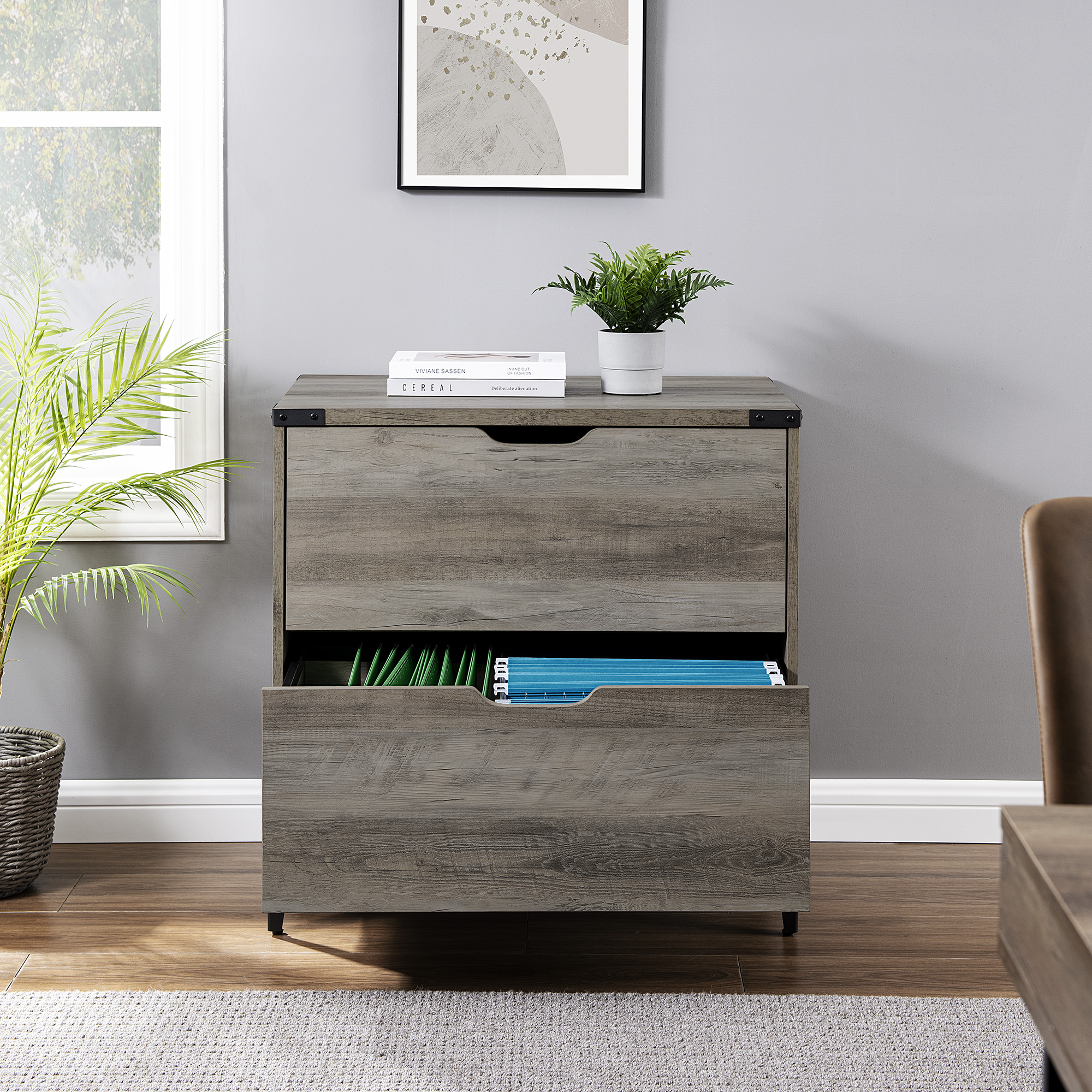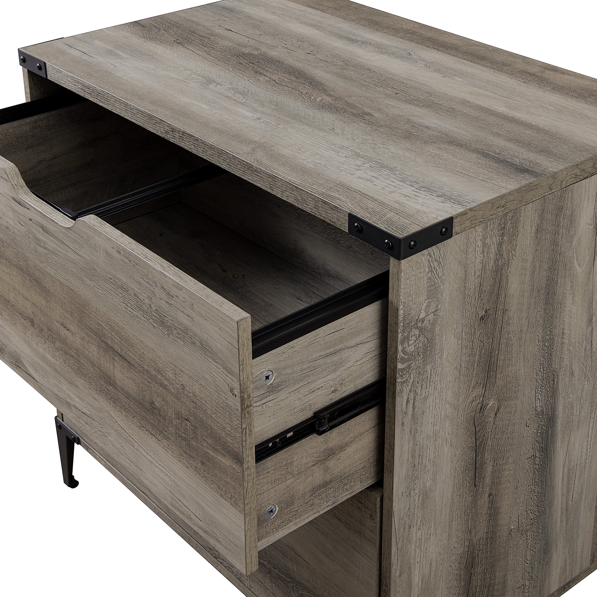 Organize your office space with the Walker Edison Modern Industrial 2-Drawer File Cabinet. Place craft essentials, important papers, and other supplies within the two large drawers on telescoping metal glides. The optional file hanging hardware provides an easy way to arrange your work or personal documents. The metal, top corner brackets and angle iron legs add an urban look to your workspace. Display credentials, your favorite books, or family photos on the wide top for a personalized look.