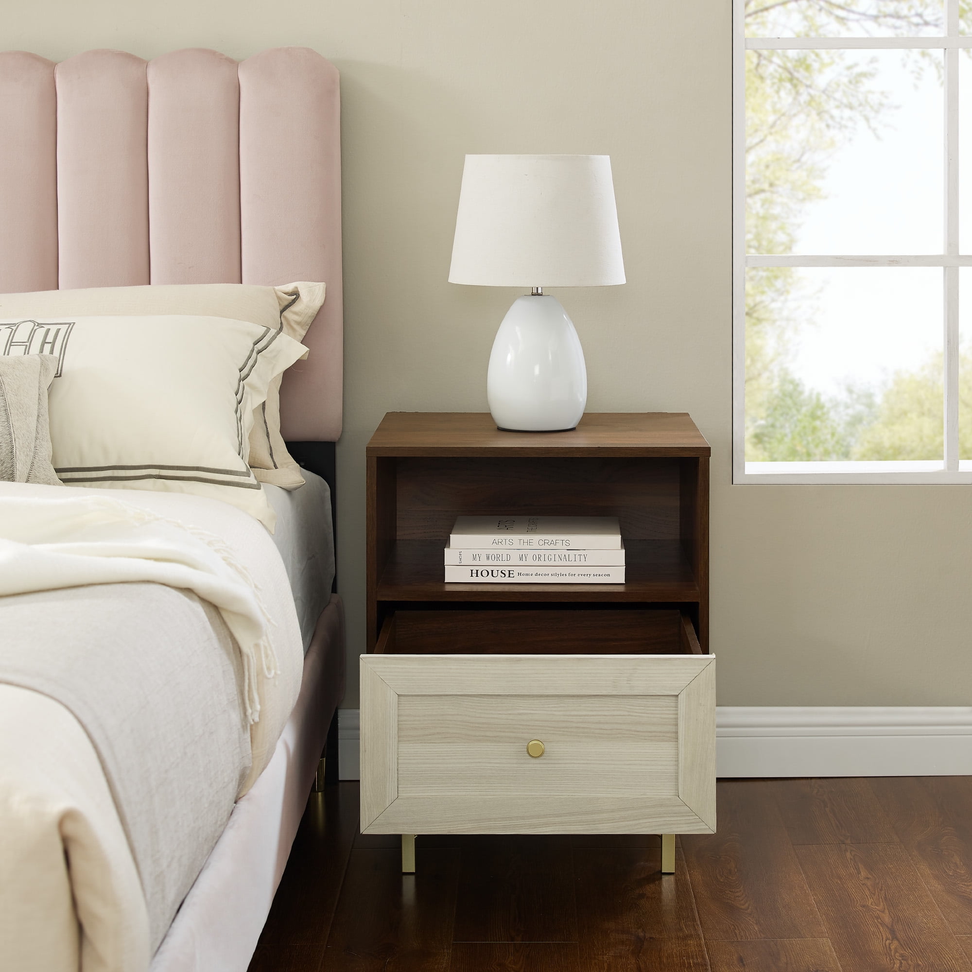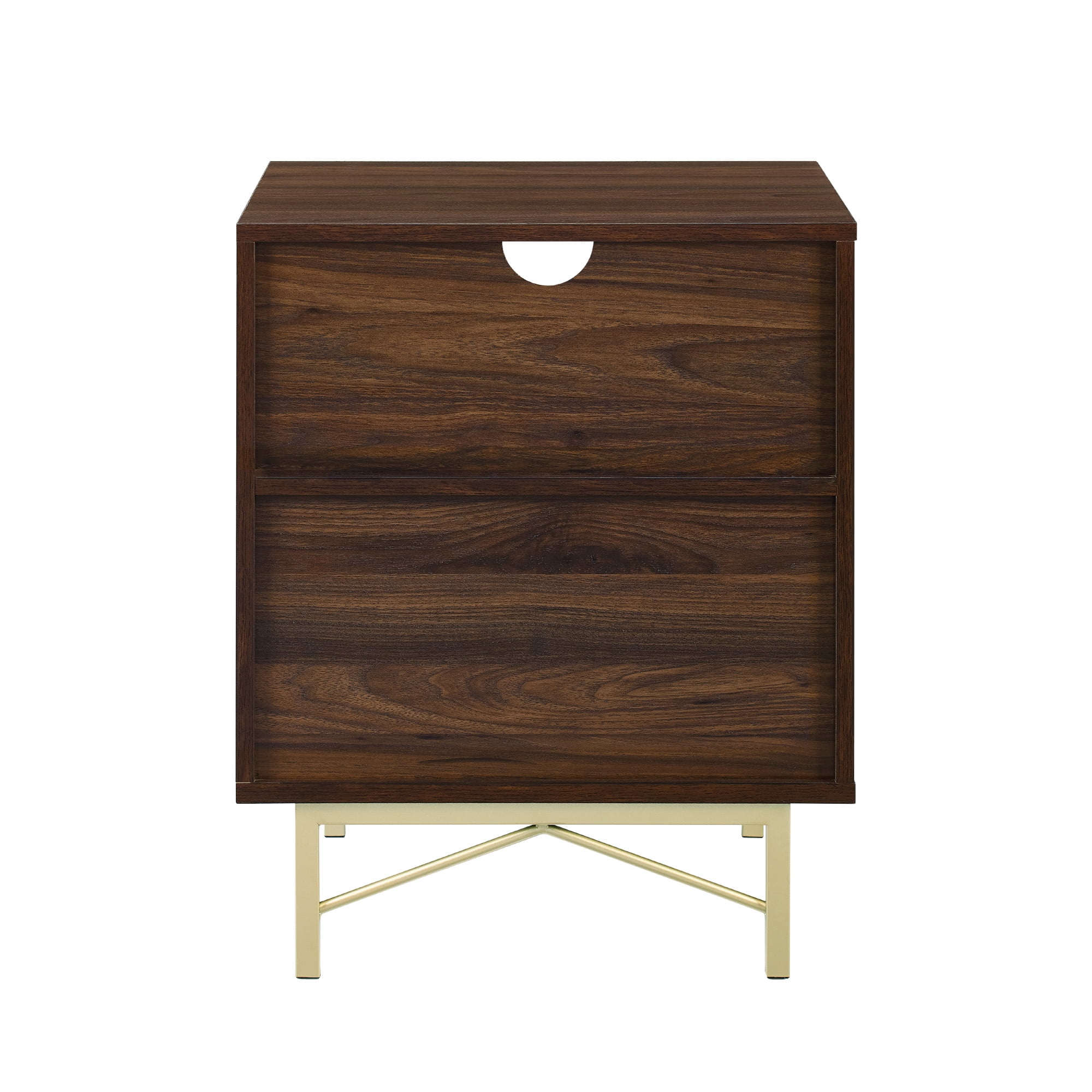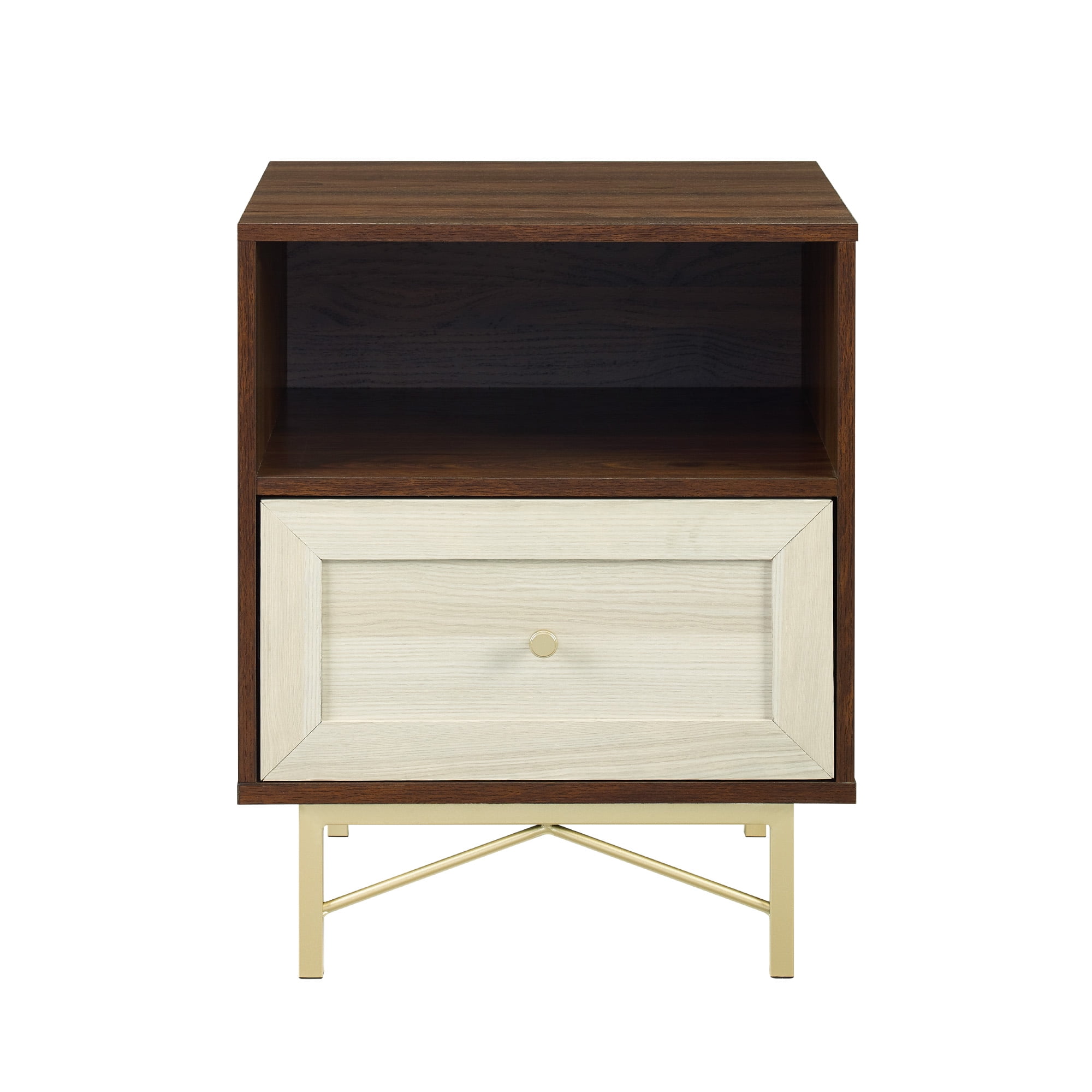 Incorporate the Walker Edison Modern Single Drawer Nightstand into your bedroom or guest room for sophisticated style. The painted gold hardware and eclectic base provide a contemporary look to elevate your private sanctuary. Tuck nightly essentials within the single drawer for easy access at bedtime. The open cubby is the perfect home for books and journals within close reach. The warp-resistant MDF wood, durable laminate, and powder-coated steel build is made to last in your forever home or first apartment. Pair with the matching dresser for a full set.