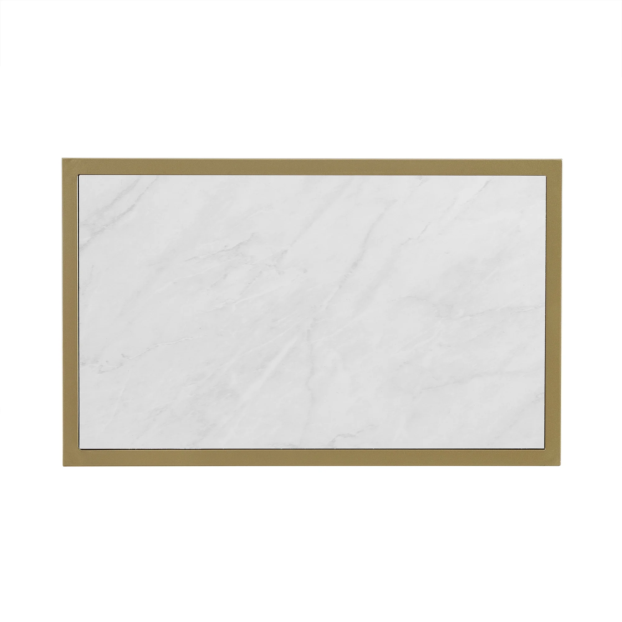 Packaged dimensions: 3″ H x 26″ L x 14″ W Assembled Dimensions: 24″ H x 11.8″ L x 8″ W Materials: High-grade MDF, durable laminate, and painted metal Assembly: Some assembly required White faux marble finish Glam accent table Open-C silhouette Rectangle tabletop Use in any room as a workspace or accent piece