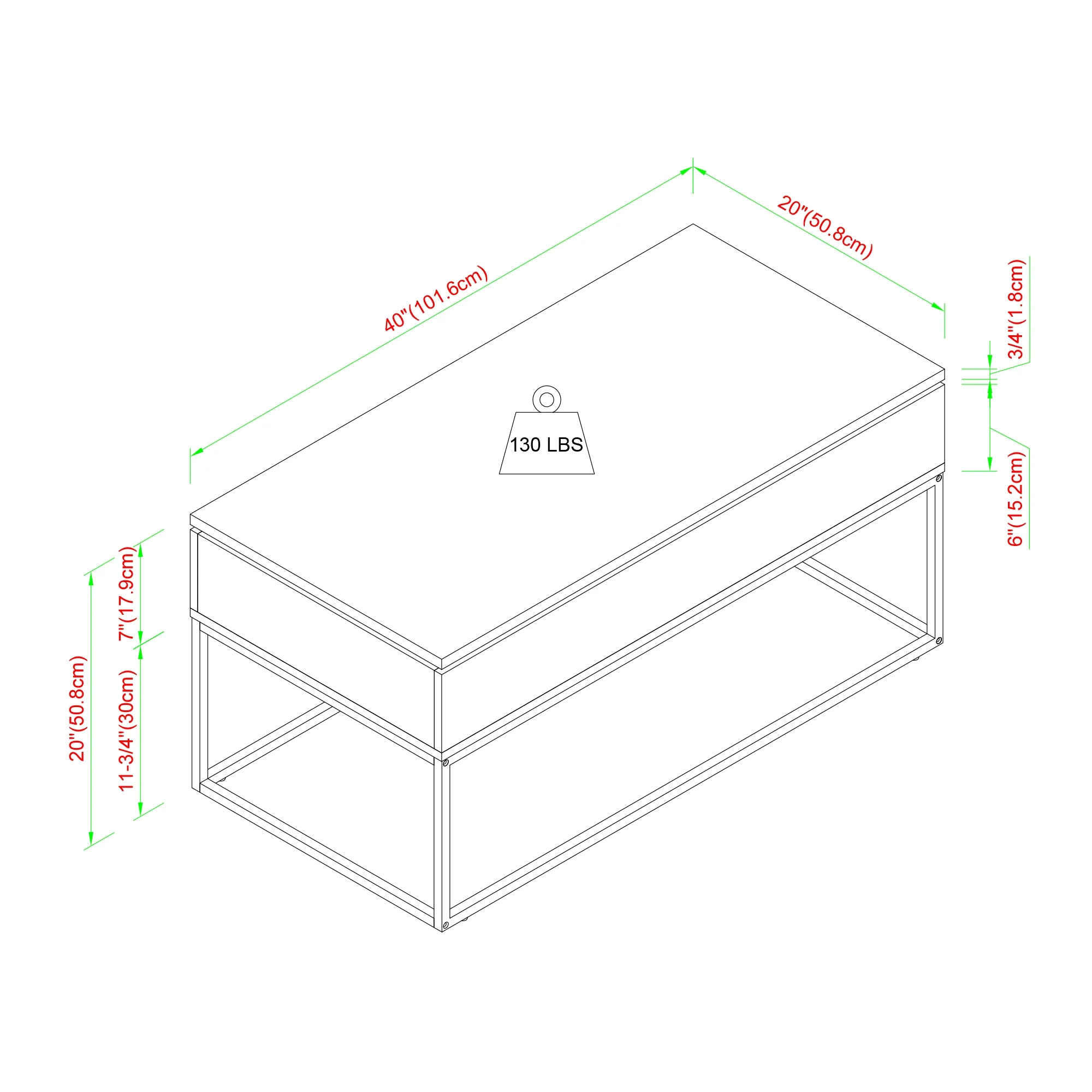 Modern style Contrasting wood and metal finishes Use lift top to create desk Square metal legs Perfect for eating, working, or studying from home Made from warp resistant MDF wood, durable laminate, and powder coated steel Ships ready-to-assemble with step-by-step instructions Assembled dimensions: 19″ H x 40″ L x 20″ W Packaged dimensions: 6″ H x 56″ L x 24″ W