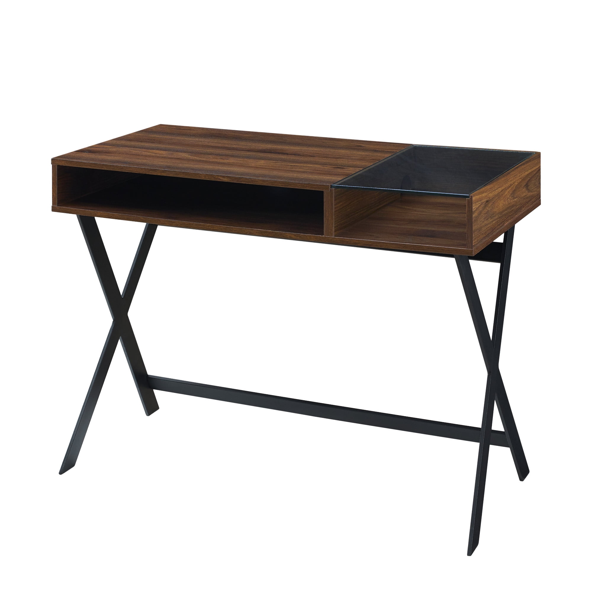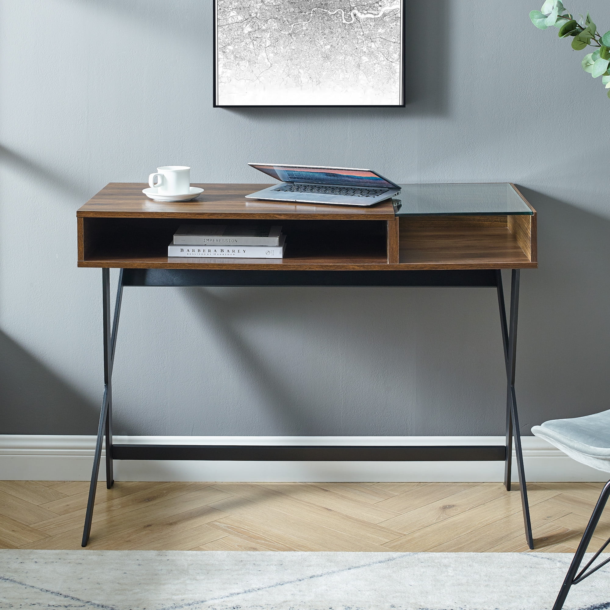 Bring new life into your workspace with the Walker Edison Modern X-Leg Writing Desk. The mixed-material design provides a city-inspired look to elevate your home office. Place electronic accessories, art supplies, or documents within the two open shelves for easy access when it matters most. The tabletop’s glass panel adds a trendy vibe and makes organizing a simple task. Made from warp-resistant MDF wood, durable laminate, and powder-coated steel, this piece is made to last through late-night study sessions or work deals. It can also be used as a vanity.