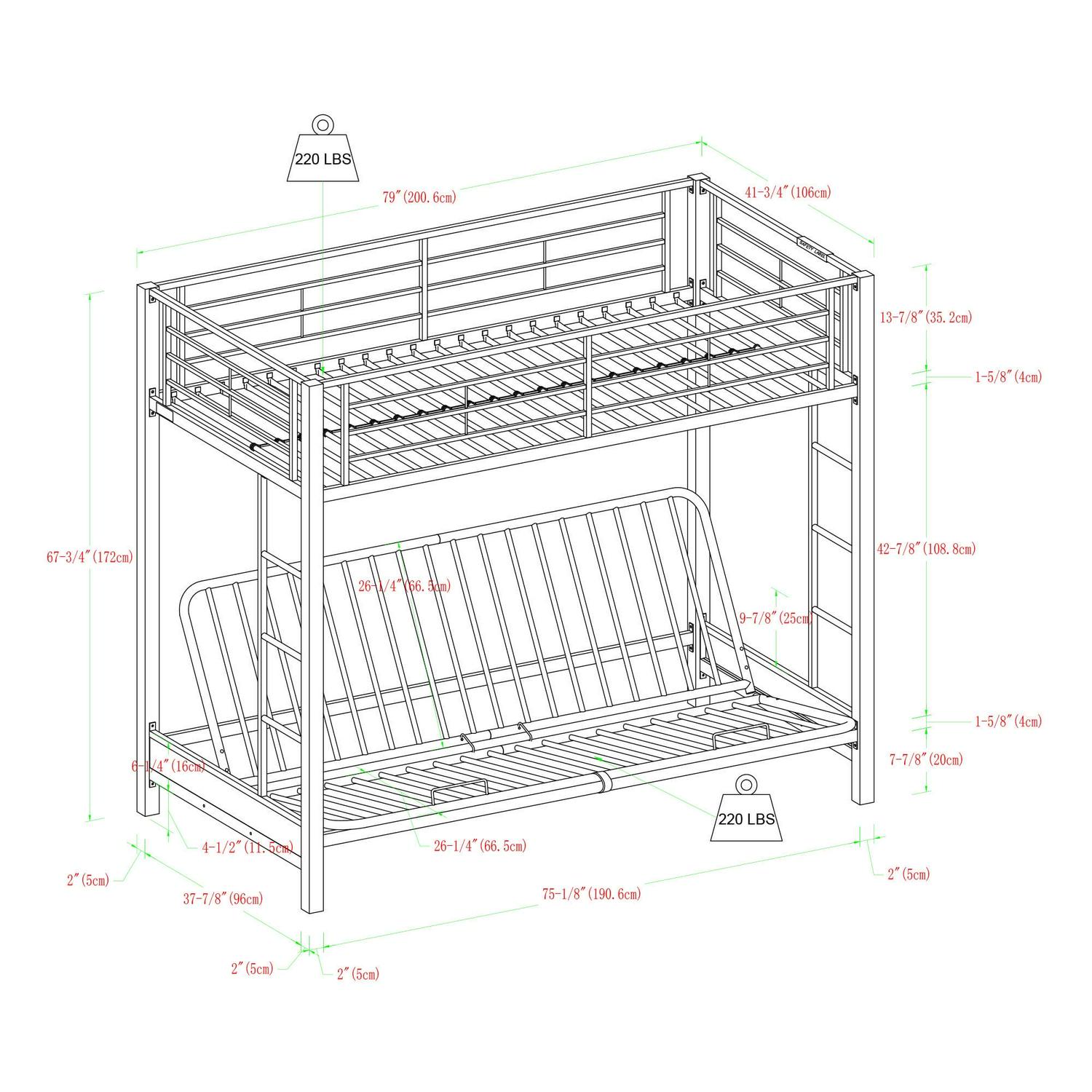 Make your kid’s bedroom or guest room more practical with our twin-over futon bunk bed. Provides plenty of sleeping space for either your little ones or for when guests need a place to rest, by having a futon that can easily convert into a full-size sleeper. Then, in the daytime, the futon can be repositioned to be used as a spot to sit comfortably and chat together. The top bunk can fit a standard twin or a full-sized mattress and can support up to 300 pounds. Designed with functionality in mind, this contemporary bunk bed is made of sturdy metal with a powder-coated finish and includes support slats, as a box spring is not needed. This space-saving bunk bed will be a wonderful addition to your home.